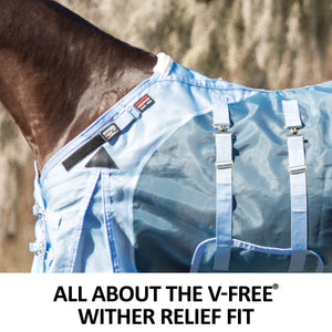 Our V-Free® Wither Relief fly sheets are designed to prevent rubbing and relieve pressure on low to moderate-withered horses. With the larger neck opening and sloped neckline that covers the shoulders, this fit is designed specifically for Arabians, Quarter Horses, Stock breed horses, or those with sloped shoulder conformation. The drop on these sheets is longer than a stable sheet, allowing a slight wrap around the barrel. Darts at the hip form a contoured fit around the rump. V-Free® Wither Relief sheets begin where the mane ends, leaving the mane uncovered with fleece placed where the mane meets the sheet, further preventing rubbing.