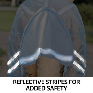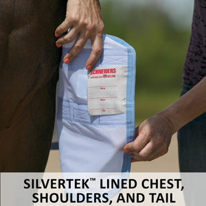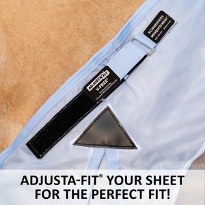 When the bugs are bad, the sun is glaring, and you need to protect your horse from the widest range of flying insects, reach for this fly sheet with an open front design and a bellyband closure for extra protection. The extra fine “window screen” 350D nylon mesh material prevents even the tiniest gnats from getting to your horses while providing exceptional airflow. Plus, it features reflective stripes for safety and SilverTek® technology with antibacterial nylon lining on the chest, shoulders, and tail flap. It comes in our comfortable V-Free® Wither Relief fit option that relieves pressure on low to moderate-withered horses, such as Arabians, Quarter Horses, and other Stock breeds. The sheet contours to your horse’s body for a comfortable fit, providing 40% UV protection.