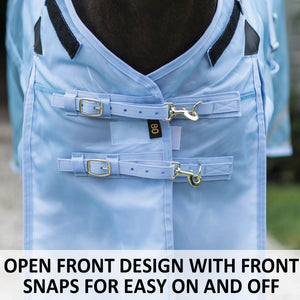 The open front option features double front snaps with new and improved wider hook and loop closures, allowing you to easily adjust the fly sheet for the perfect amount of “snugness” at the front of the chest. Plus, the snaps make it easy to put on and remove.