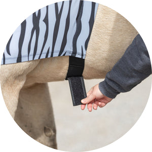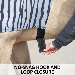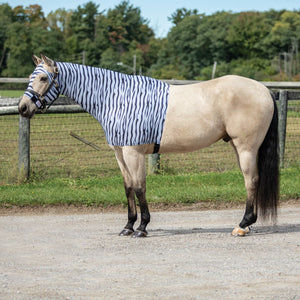 The pull-on over-the-head style of the UltraFlex® Pull-On Zebra Slicker Hood makes it easy to put on and take off without having to worry about any hardware that could rub or break. This makes it more convenient for you and ensures that all the seams of the slicker are smooth against your horse's skin. The lack of hardware also eliminates any potential sources of discomfort or irritation for your horse, making the UltraFlex® Full Body Zipper Zebra Slicker the ideal choice for horse comfort and safety.