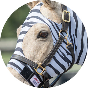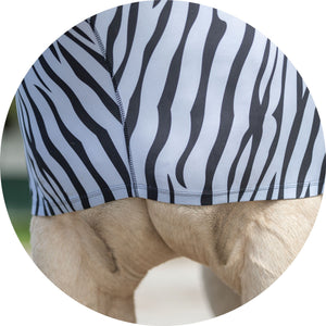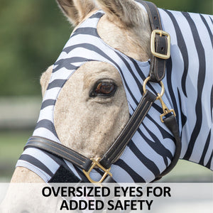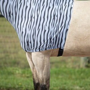 The UltraFlex® Pull-On Zebra Slicker Hood is the perfect choice for horse owners looking for style and function. The 8oz 4-way stretch lycra material allows your horse to move comfortably in every direction, while the zebra print is a fun pattern you'll love. The pull-on style and 2" elastic girth strap make it easy to put on and take off. You'll love this stylish slicker that keeps your horse clean while in the stall!