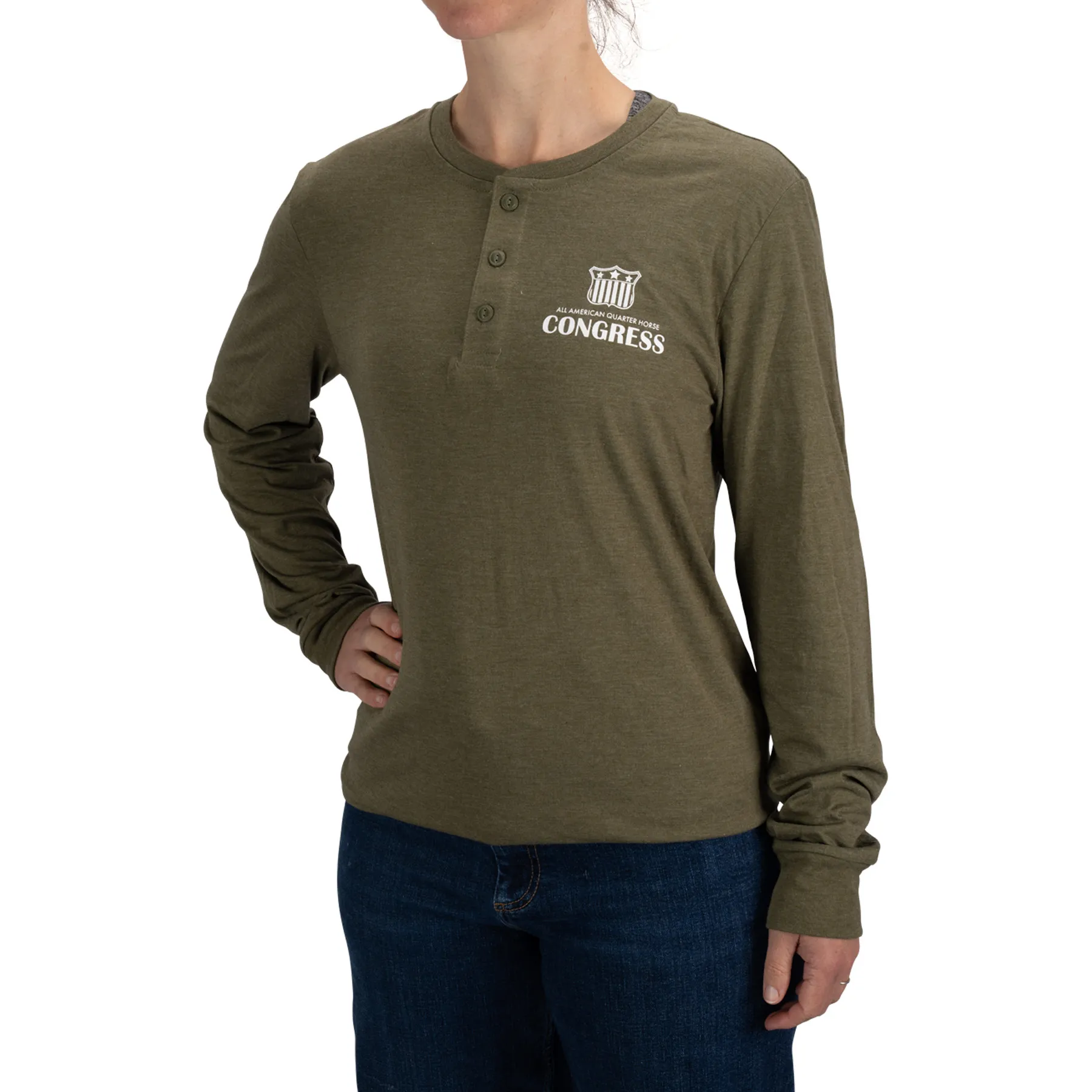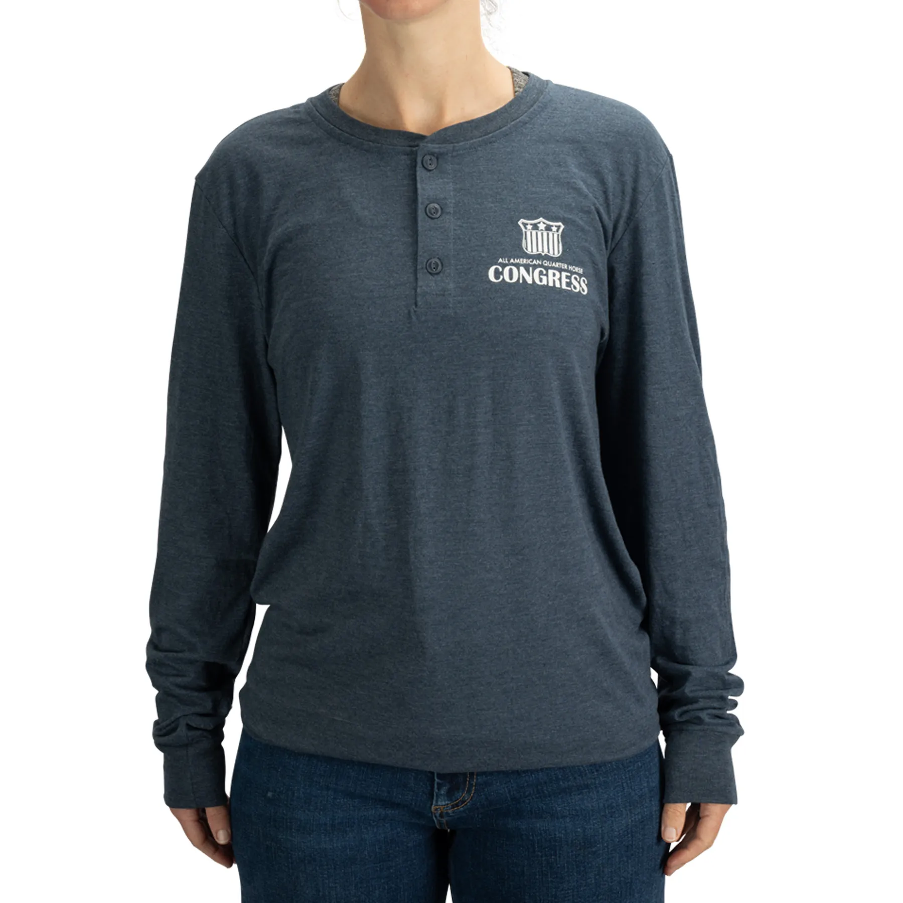 Show your support for the All-American Quarter Horse Congress event with this cozy long-sleeve henley shirt, complete with the official Quarter Horse Congress logo on the front. Great for layering or wearing alone, this shirt will quickly become your go-to choice!