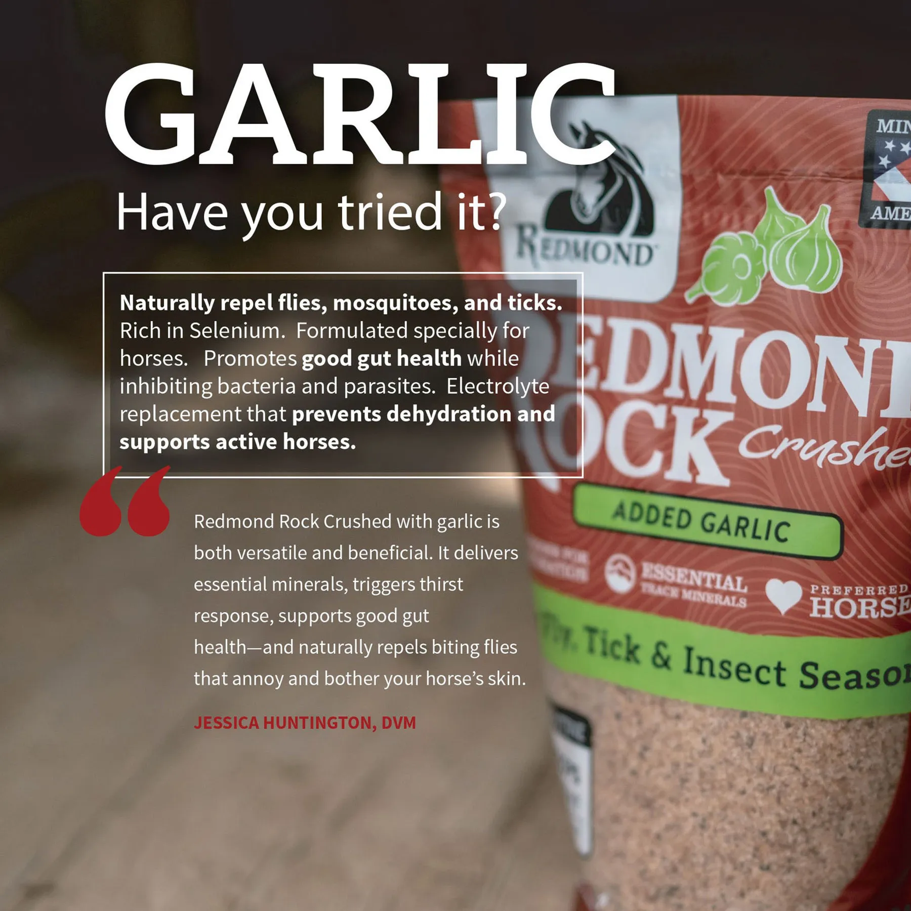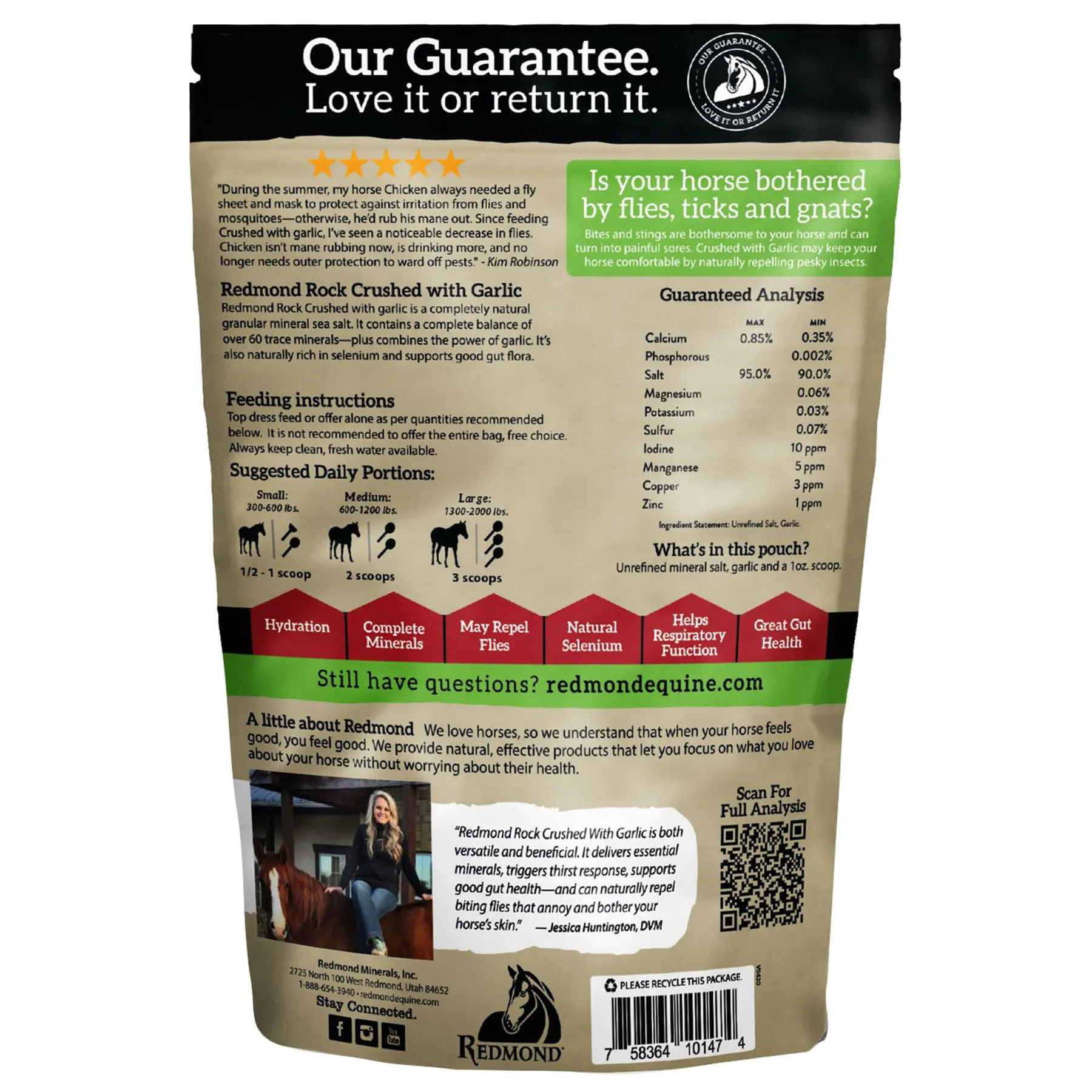 Bites and stings from pests stress your horse and can become painful sores. Help your horse stay comfortable during fly season with Redmond Rock Crushed with Garlic! It naturally repels flies and ticks on horses and delivers 60+ trace minerals and electrolytes to support better health and hydration. Crushed with Garlic is natural nutrition and fly control you can feel good about giving your horse. Crushed with Garlic contains powerful bioidentical garlic oil. It's highly concentrated, which means much less is needed to gain the same benefits as other garlic forms. Bioidentical oil has the same flavor and organosulfur compounds as natural garlic - but it's consistently more bioactive and stable. Crushed Garlic is a smart, safe, and effective choice as a garlic supplement and natural loose mineral salt horses love! Manufacturers do not recommend feeding garlic to your horse year-round. Follow appropriate Crushed with Garlic dosage instructions based on your horse's size, and use only during fly season. (The product should be used for a maximum of 6 consecutive months).