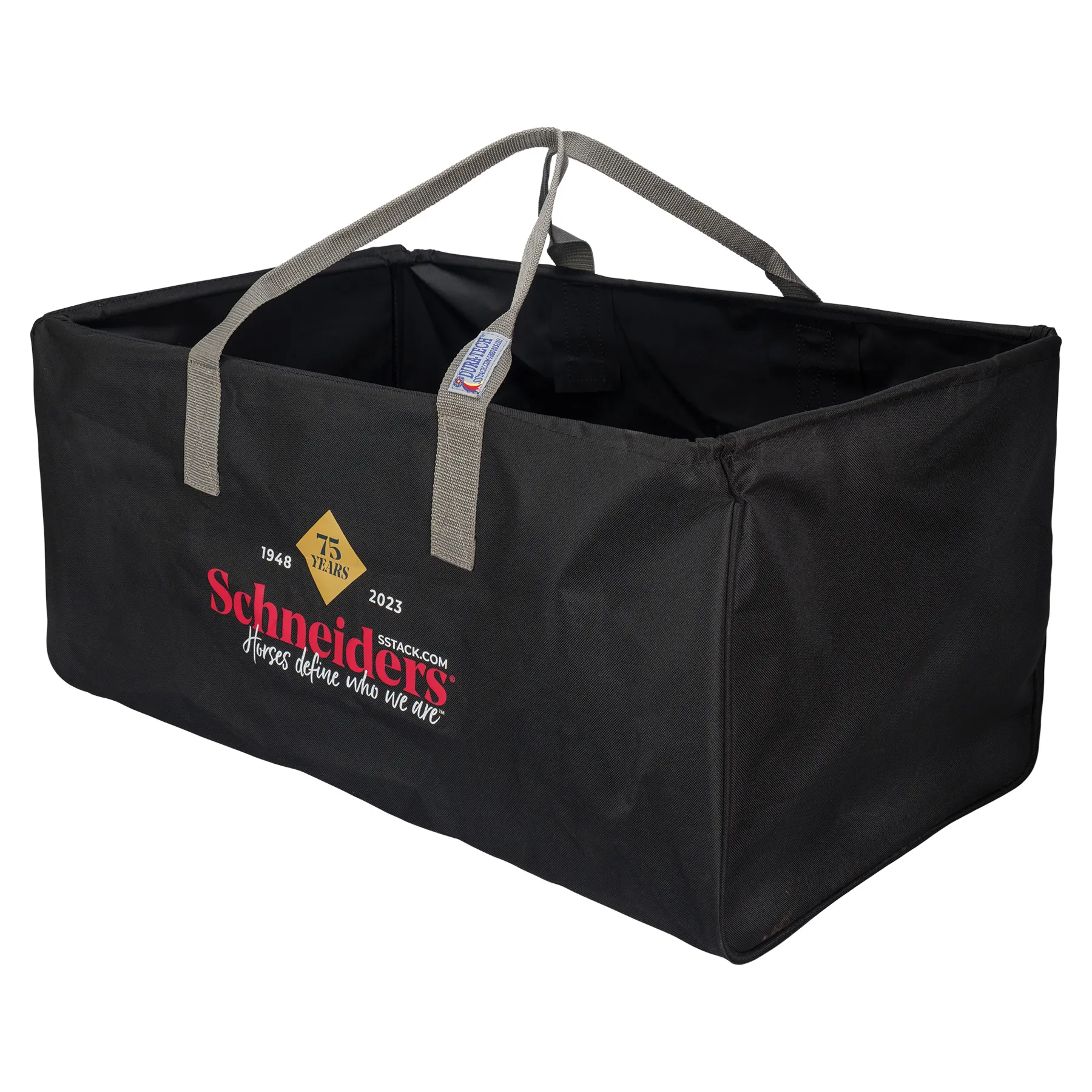 Celebrate Schneider's 75th anniversary with this large utility tote featuring our limited edition anniversary logo. The tote has a rigid top frame for easy loading and unloading. Use to carry hay to the pasture, transport sports equipment, or as a toy bag for dogs.