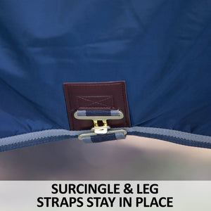 Reinfored leg straps and a surcingle closure adjust to keep the blanket from sliding side to side. Comes with locking bands=for increased security. Brass plated hardware resists corrosion from moisture, manure and detergents.