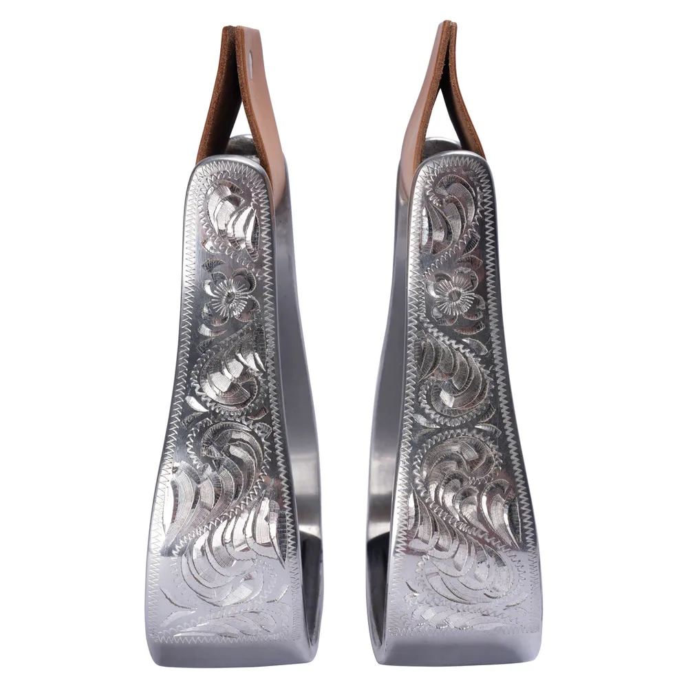 Add a touch of elegance to your show saddle with these Aluminum Engraved Western Padded Stirrups. Designed with beautifully etched aluminum, these stirrups offer a natural luster while providing enhanced comfort and grip with a rubber-padded footbed. Lightweight yet durable, they're the perfect combination of style and functionality for any Western rider.