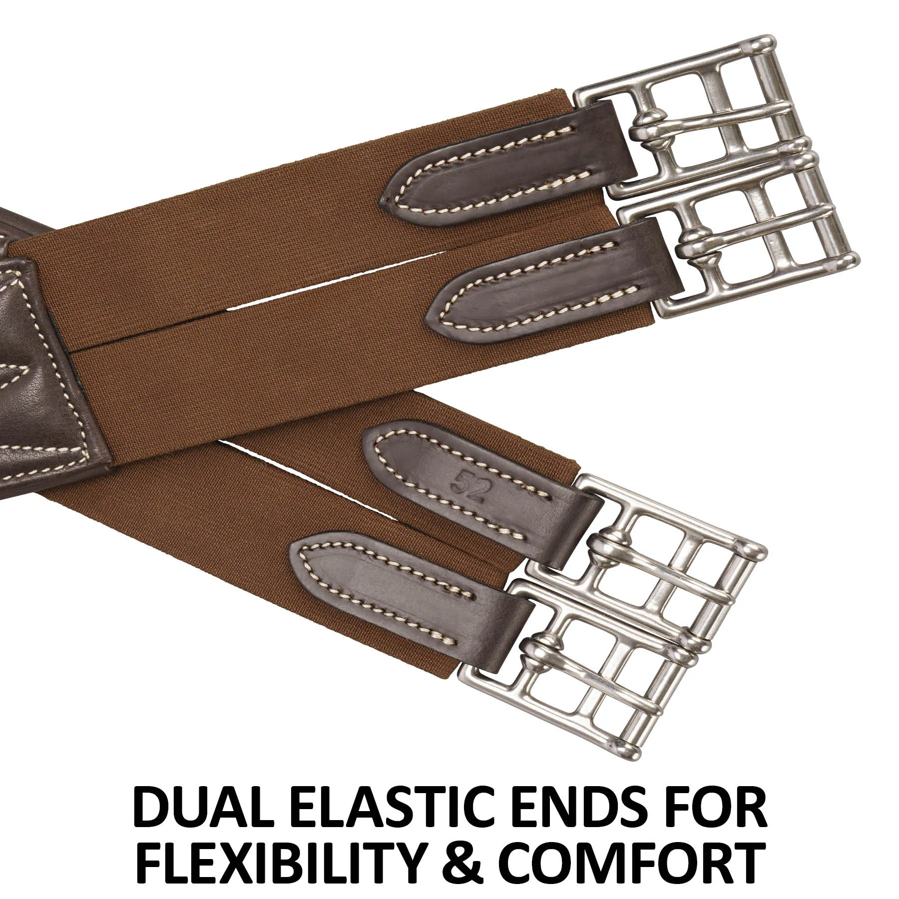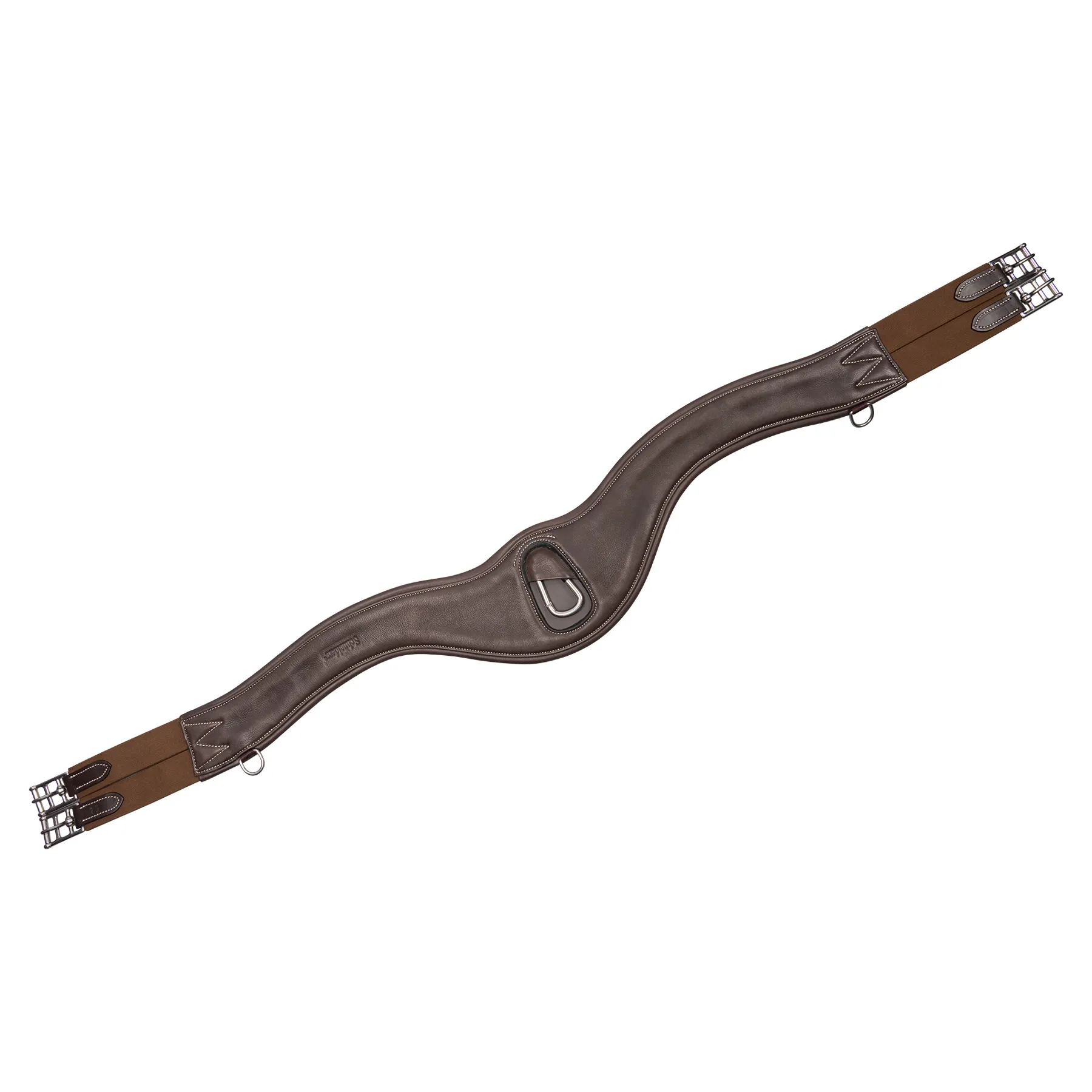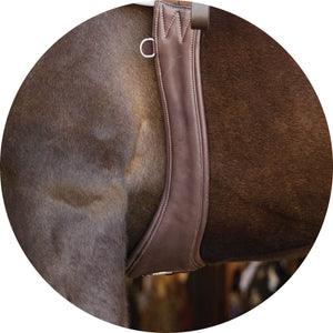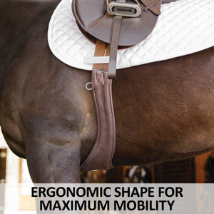 Give your horse the freedom to move effortlessly with our Anatomical Leather English Jump Girth. Designed for superior comfort and performance, this girth features a strategic anatomical shape, premium aniline calfskin leather, and smart functional details. Whether you're tackling a jumper course or perfecting your flatwork, this girth supports natural movement, prevents discomfort, and ensures a secure yet flexible fit. With a carabiner clip for easy martingale attachment, stainless steel hardware, and dual elastic ends, it's the perfect choice for both training and competition.