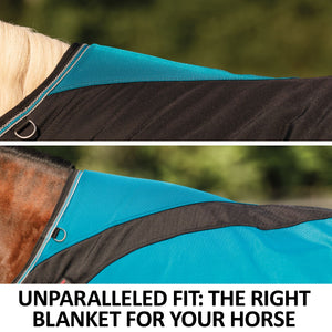 Our VTEK ® Wither Relief fit is designed to prevent rubbing and relieve pressure on moderate to high withers. The upright shoulder and shape over the withers are designed to fit breeds with similar conformations as Thoroughbreds, Warmbloods, Appendix horses, or those with upright shoulder conformation. It includes an extended drop to cover a deeper heart girth, and they are shaped with darts at the hips to give a more contoured fit around the rump. Extends 6 to 8 inches onto the mane with fleece placed where the mane meets the sheet, further preventing rubbing.
