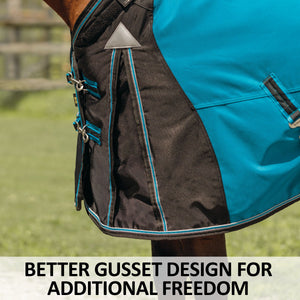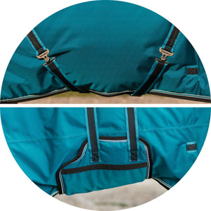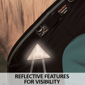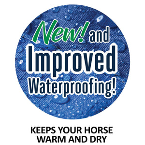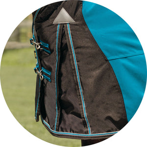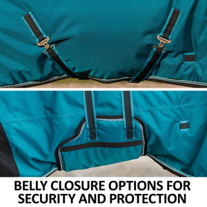 The bellyband closure option adds additional protection from harsh weather. Hardware is positioned to avoid rubbing or poking while your horse is lying down, and the t-post hardware on the bellyband closure includes locking bands. It incorporates elastic inserts for more give as the horse moves since the proper fit is with the bellyband snug and flush to the belly.