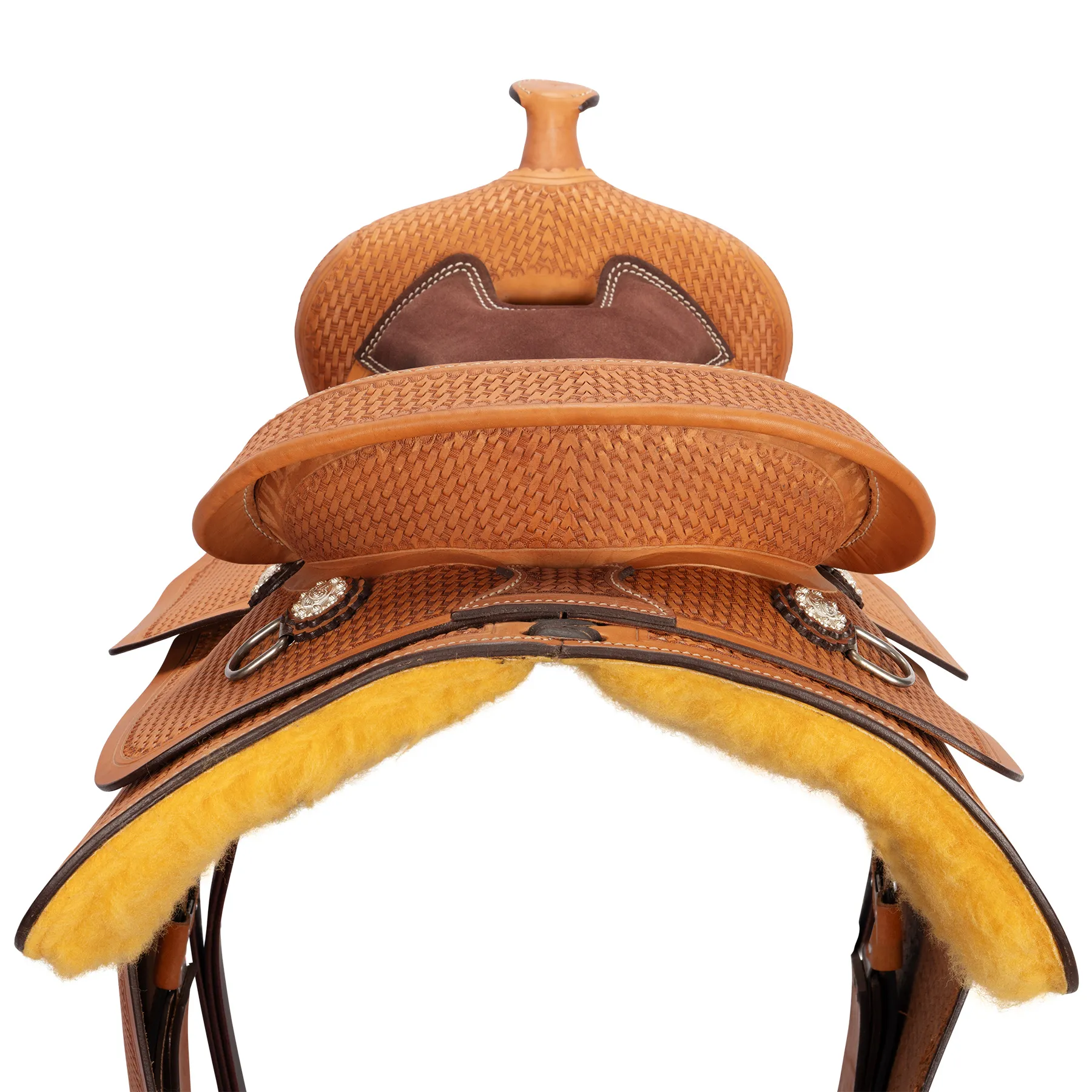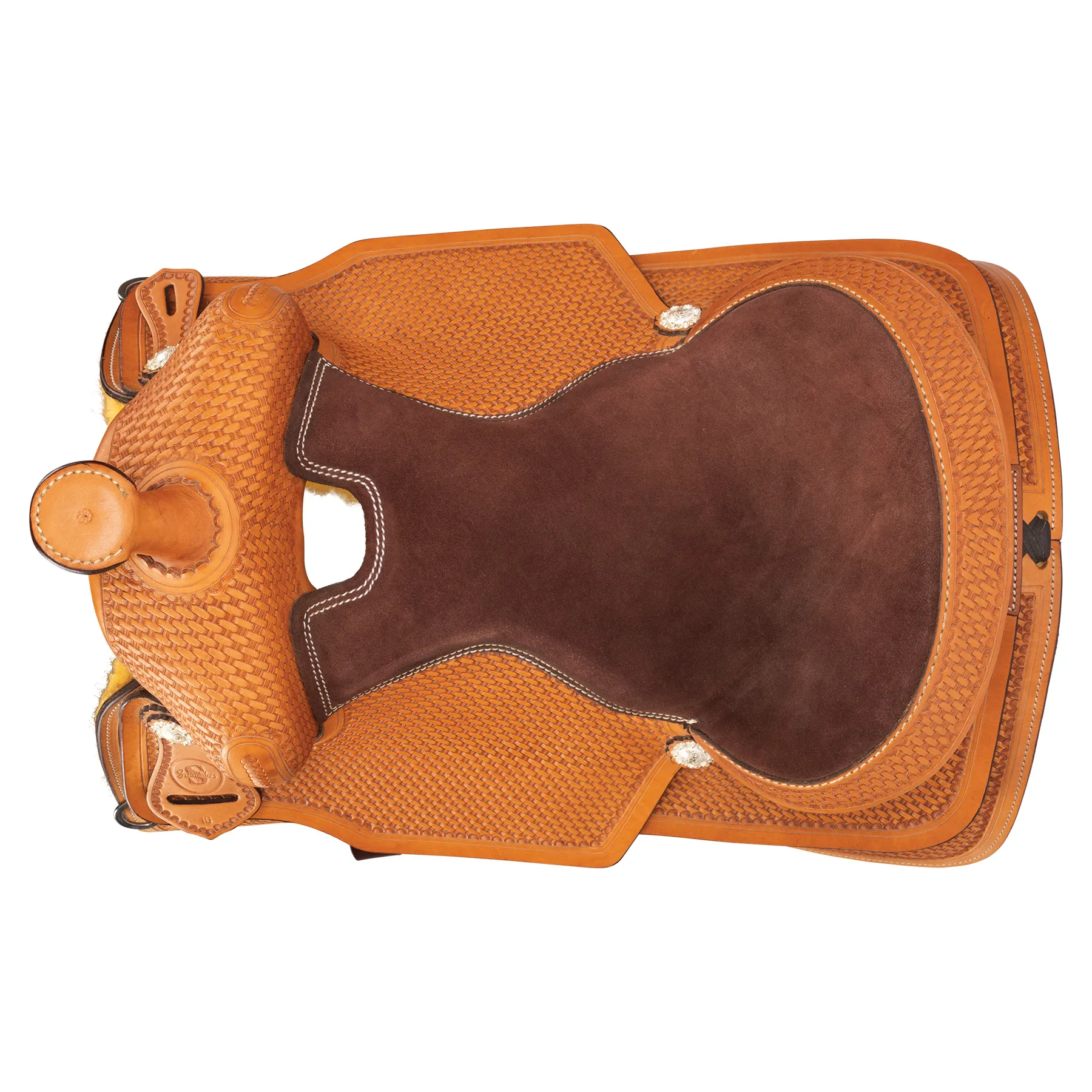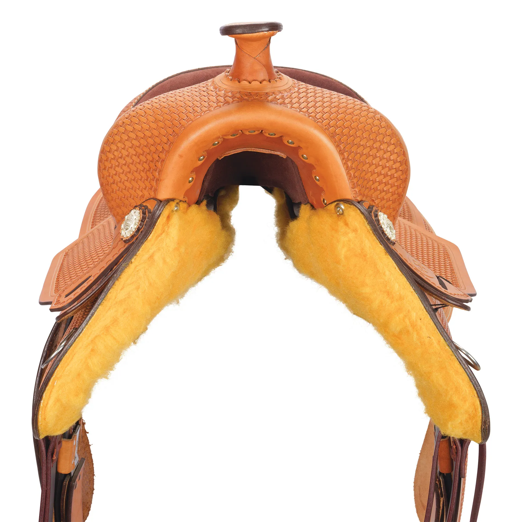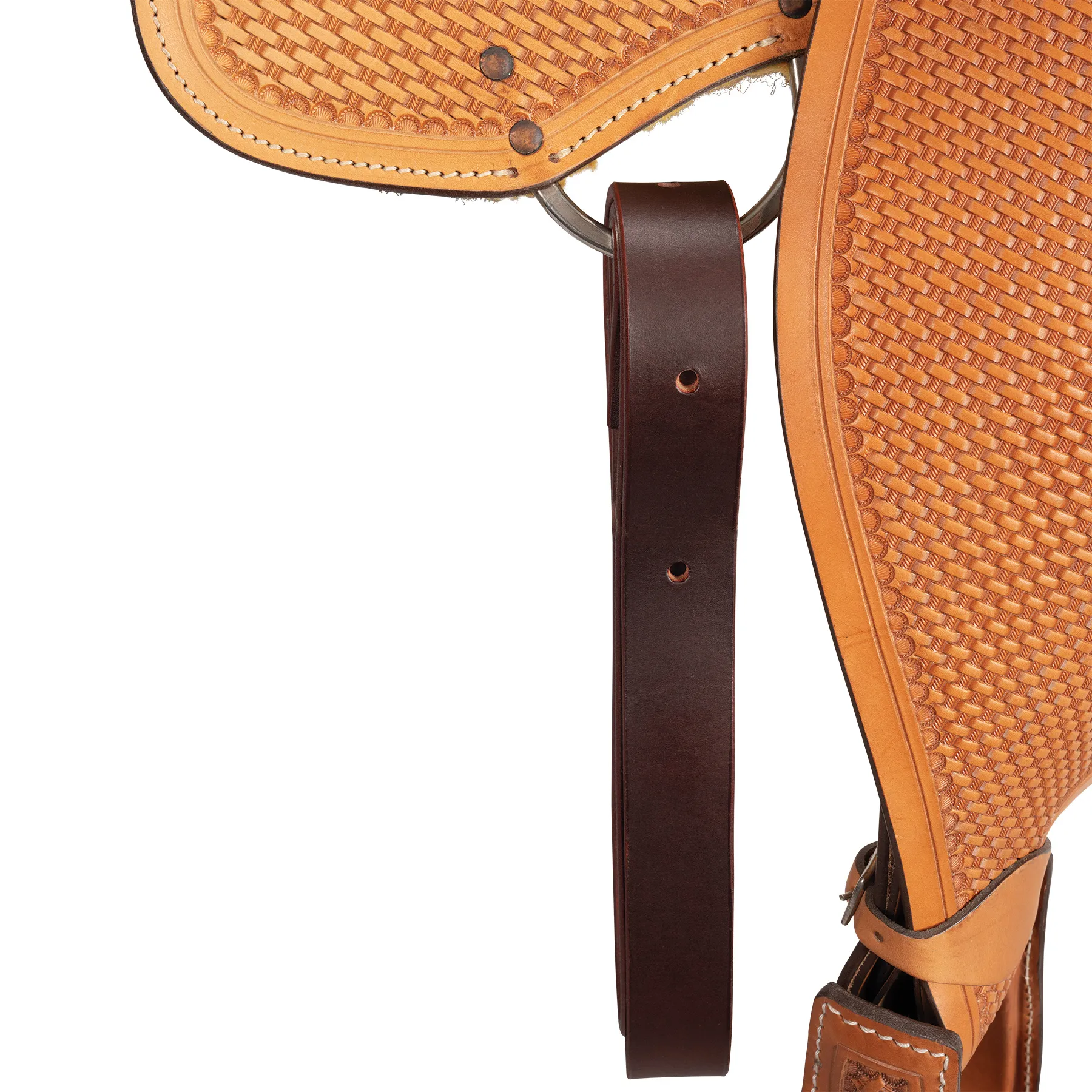 Ready for everyday rides, trail adventures, or as your go-to backup, this all-around western saddle delivers style and function in one balanced design. Hand-tooled with a classic basketweave pattern, it's built on a lightweight fiberglass tree with Full Quarter Horse bars to fit a wide range of modern horse builds, including more refined types like Arabians. The padded seat and stainless steel hardware make it both comfortable and trail-tough.