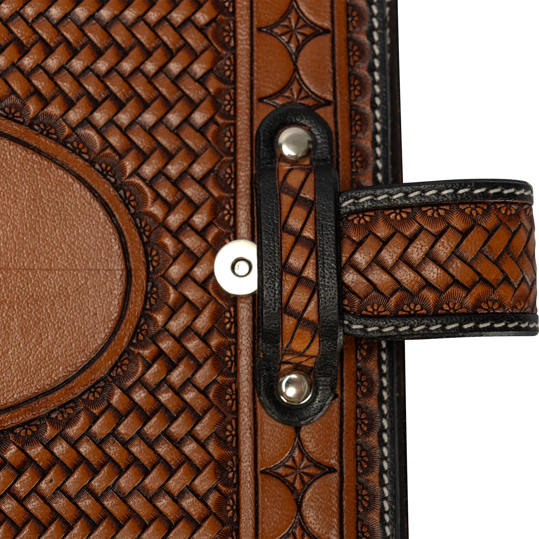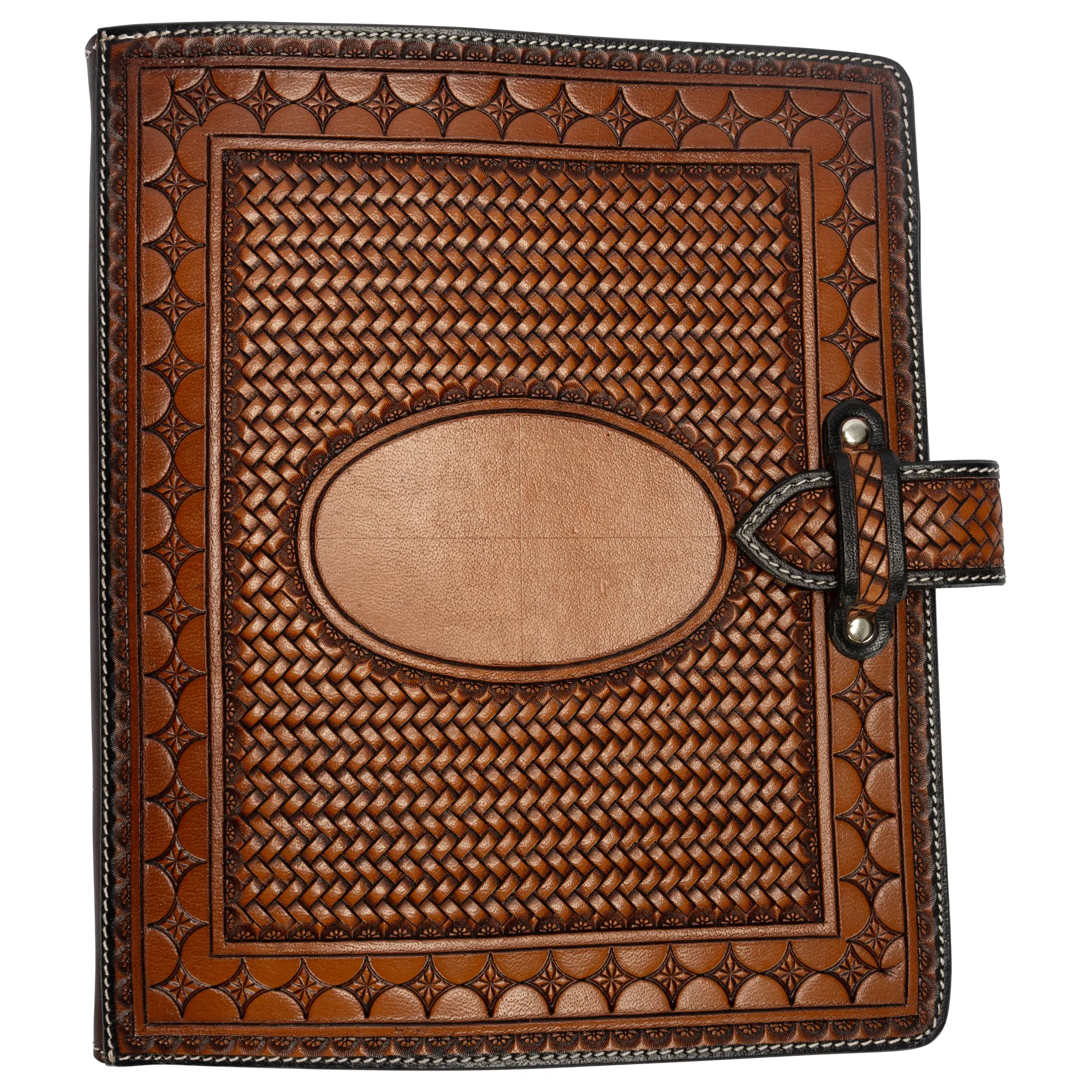 Stay stylish and organized with this stunning hand-tooled leather binder padfolio. It's functional and elegant, perfect for business professionals, equestrians, or anyone who values timeless design. With intricate basketweave and diamond tooling, this padfolio makes a thoughtful gift or an impressive award.