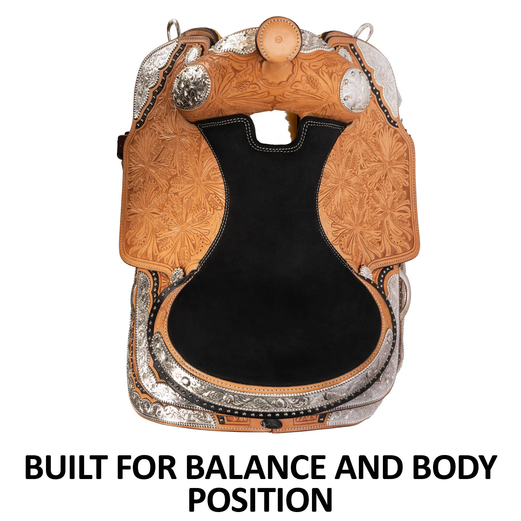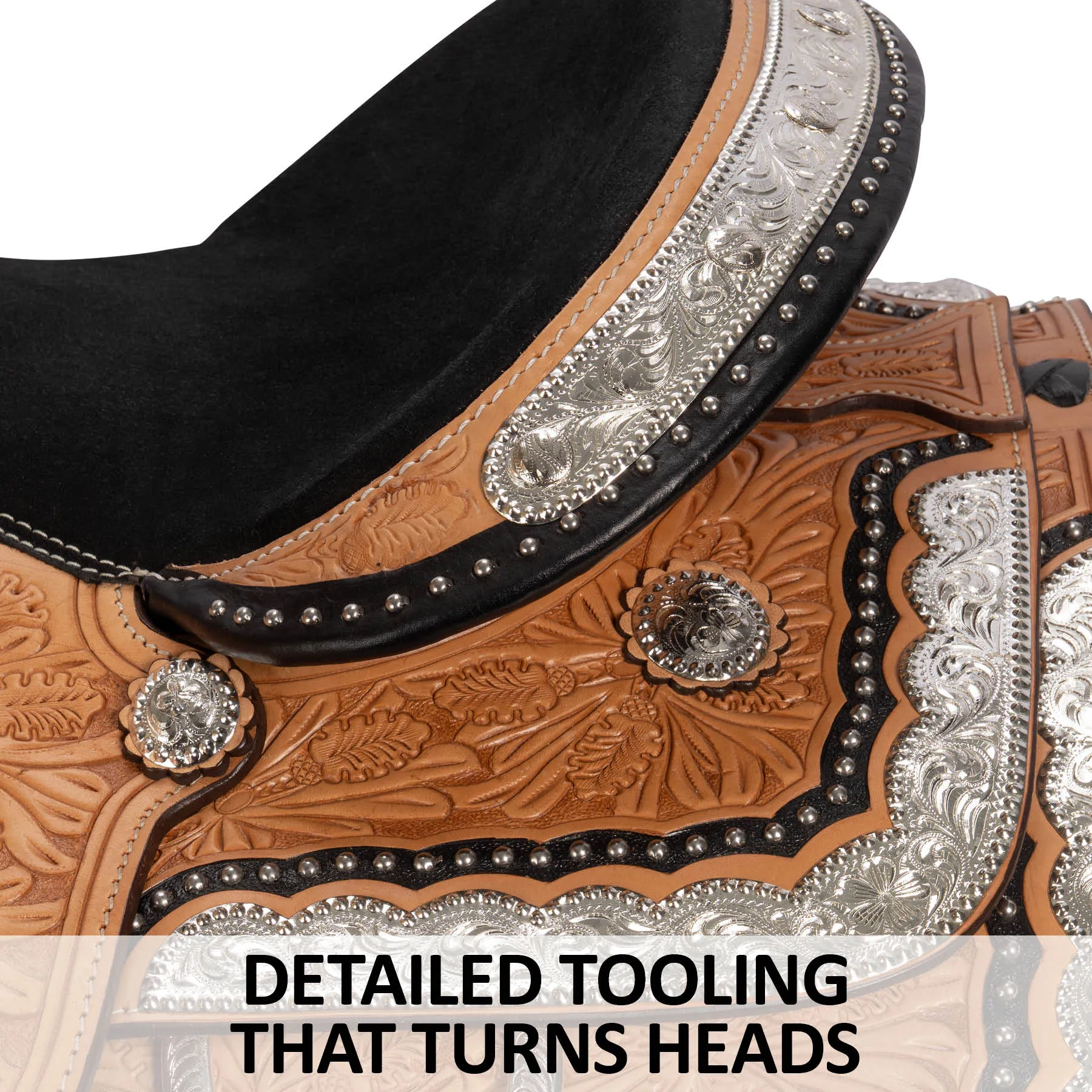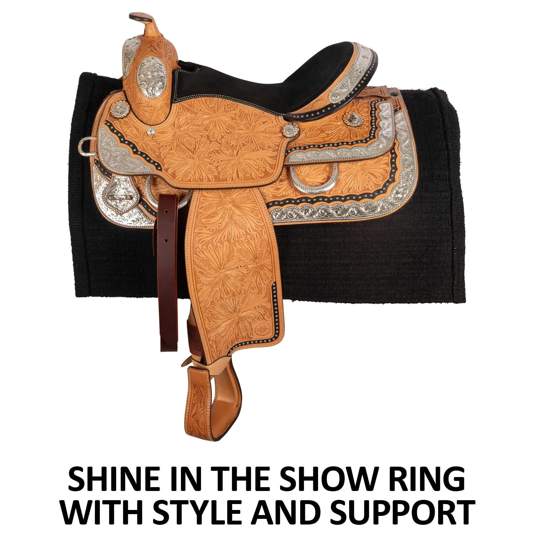 Step into the show ring with confidence and classic western flair. The Cody II Western Silver Show Saddle is the perfect entry-level showpiece for riders looking to elevate their presence. Built on a lightweight rawhide-wrapped fiberglass tree with full horse bars, it offers a balanced, comfortable ride and a fit that suits modern equine builds. Intricate hand-tooled leather and silver-plated trim make this saddle a true standout, ready to draw attention under the arena lights.