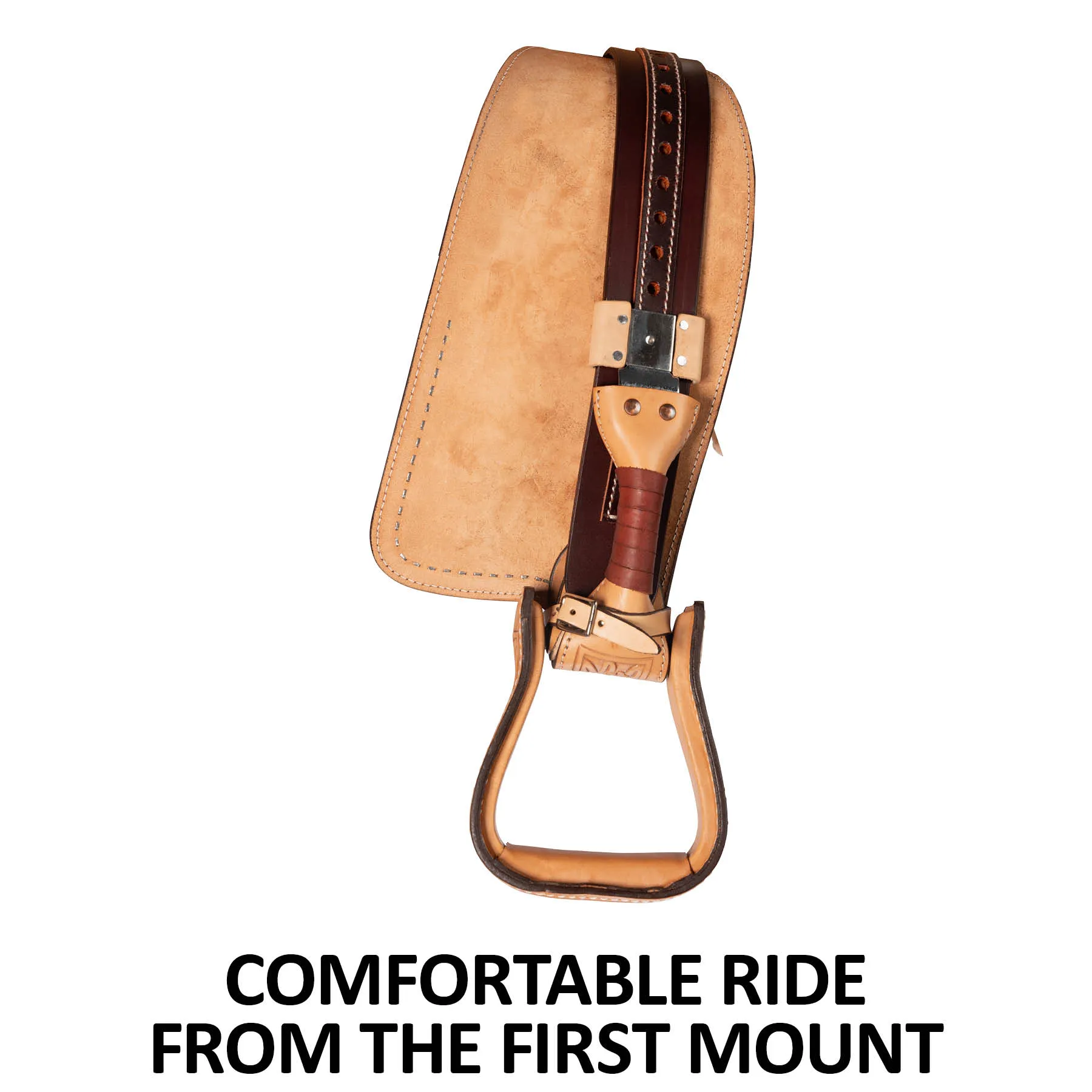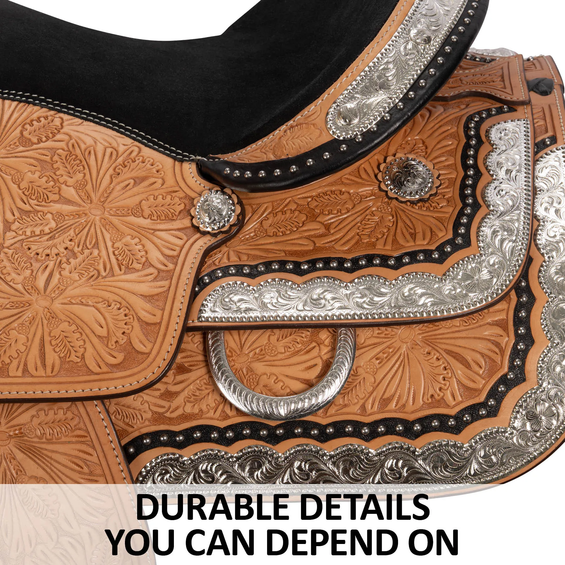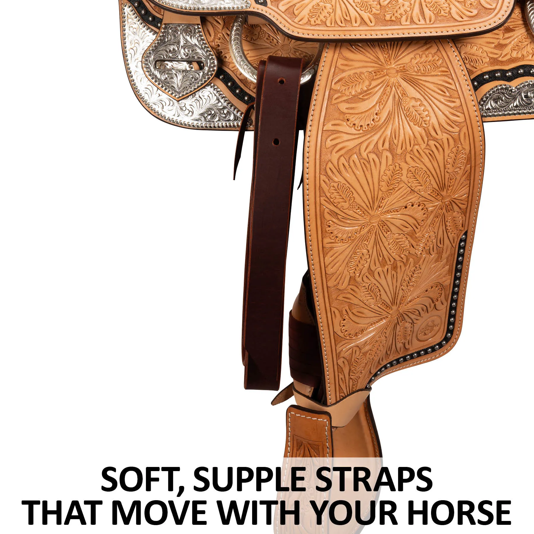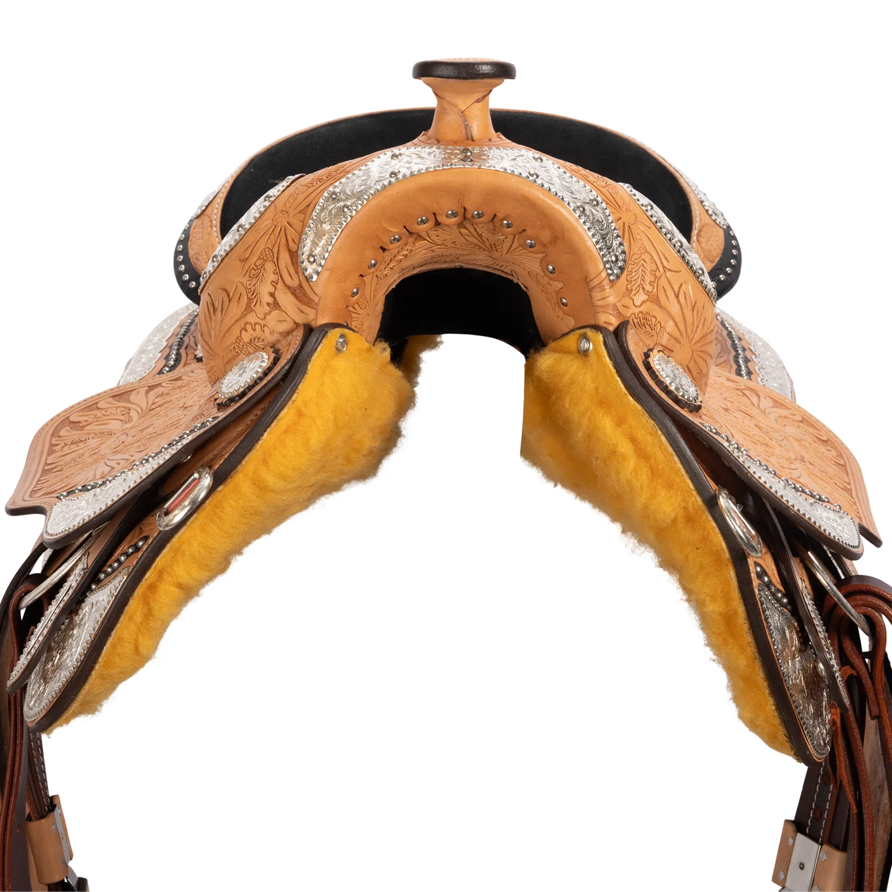 Step into the show ring with confidence and classic western flair. The Cody II Western Silver Show Saddle is the perfect entry-level showpiece for riders looking to elevate their presence. Built on a lightweight rawhide-wrapped fiberglass tree with full horse bars, it offers a balanced, comfortable ride and a fit that suits modern equine builds. Intricate hand-tooled leather and silver-plated trim make this saddle a true standout, ready to draw attention under the arena lights.