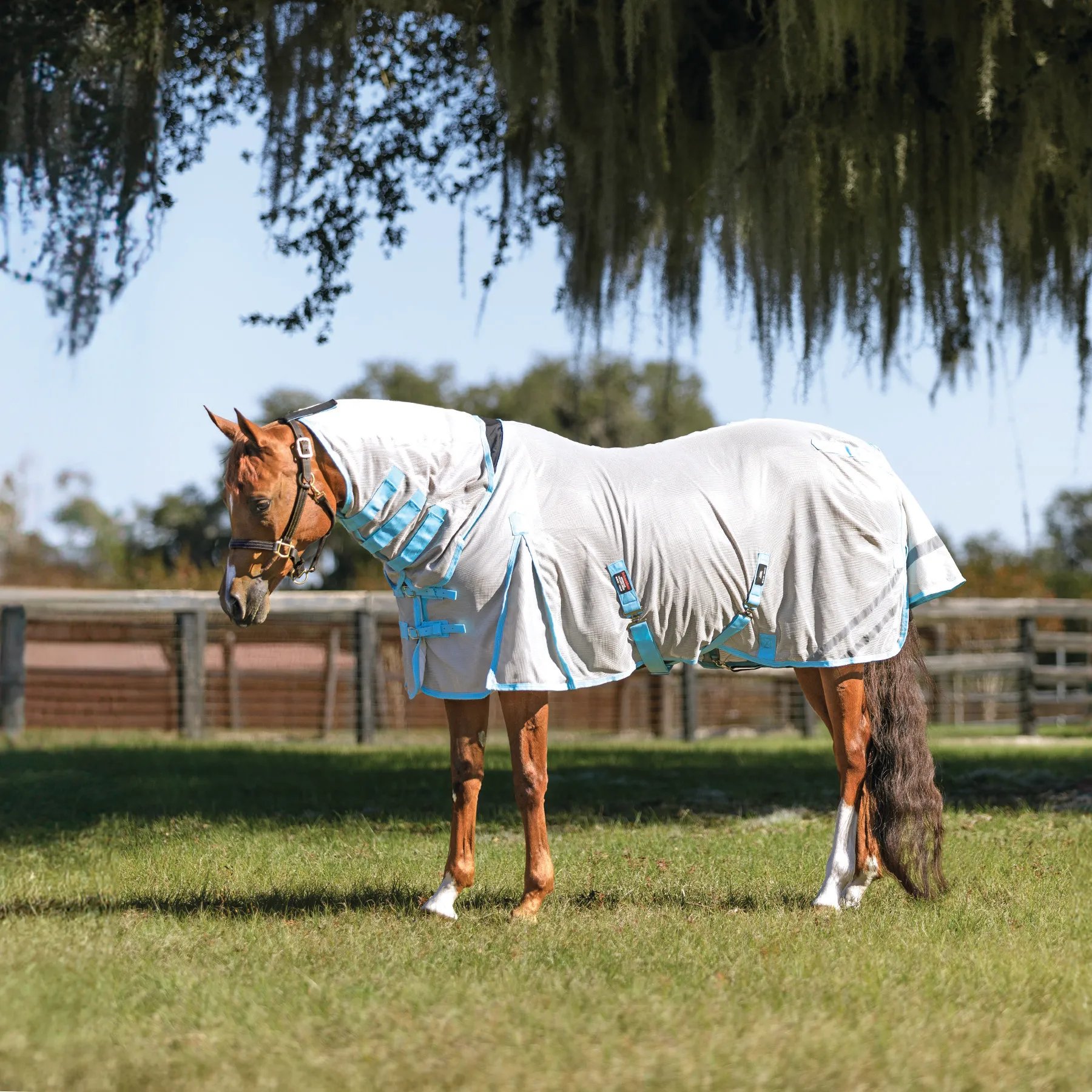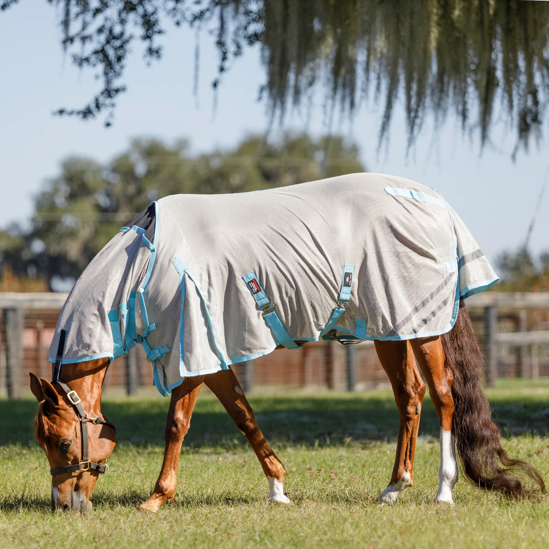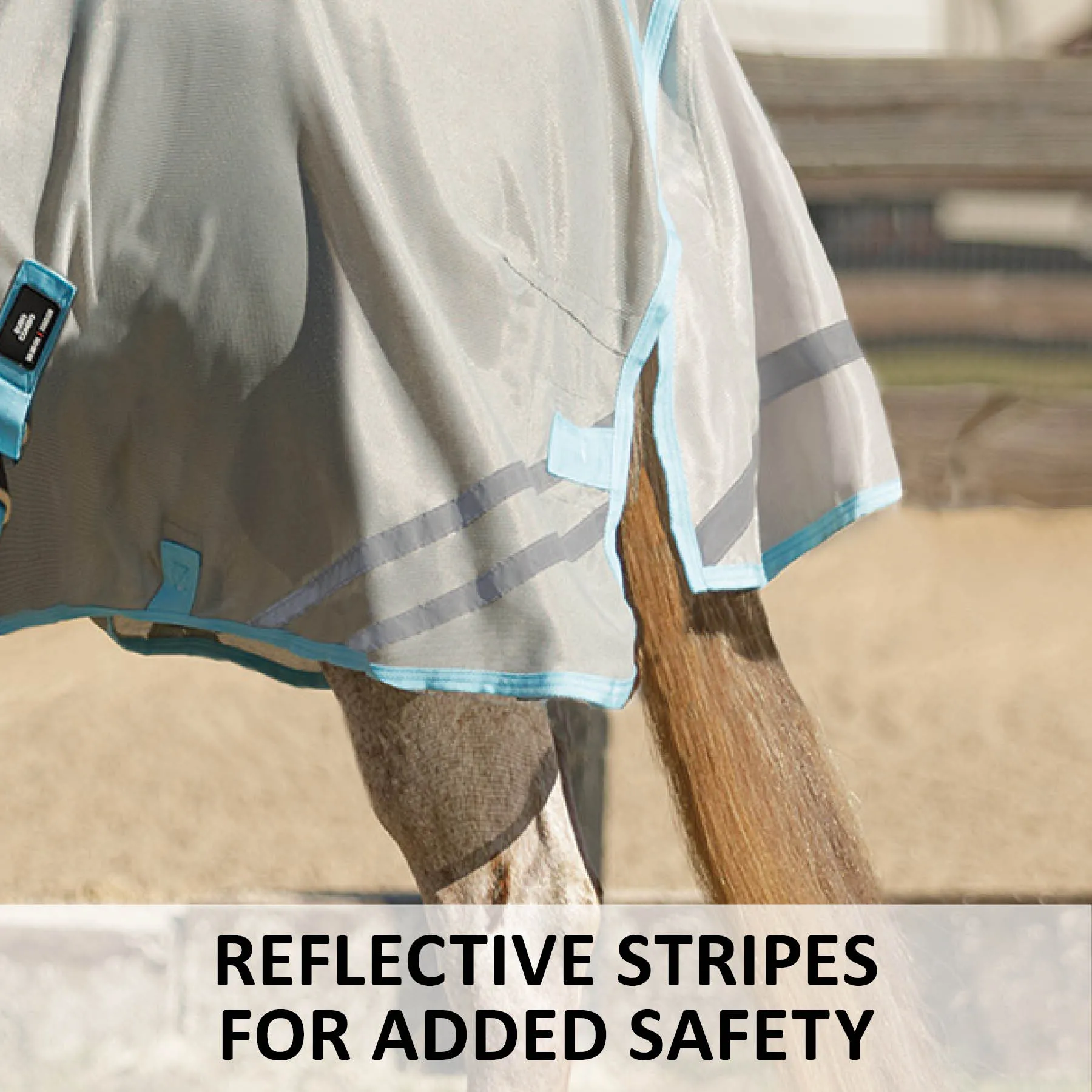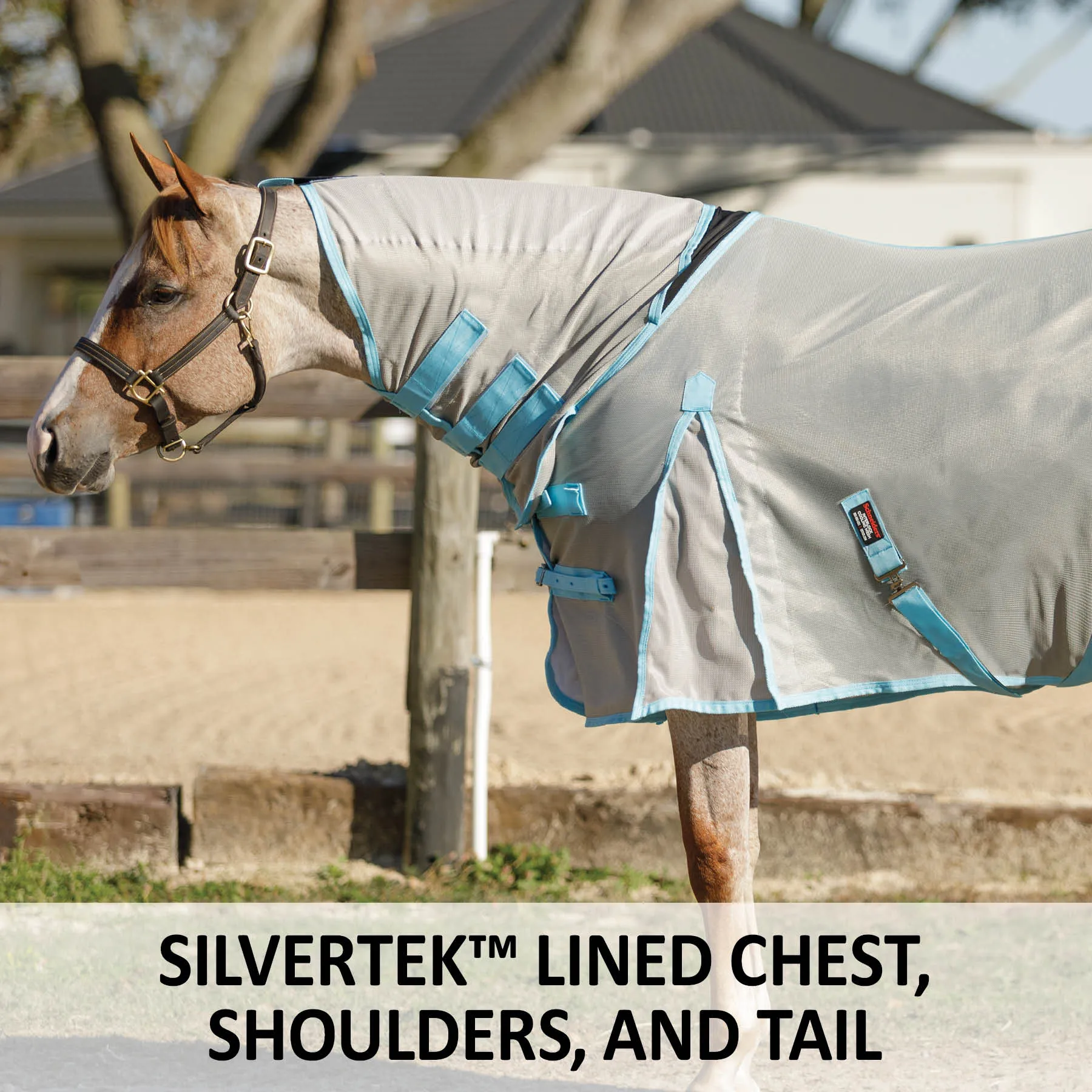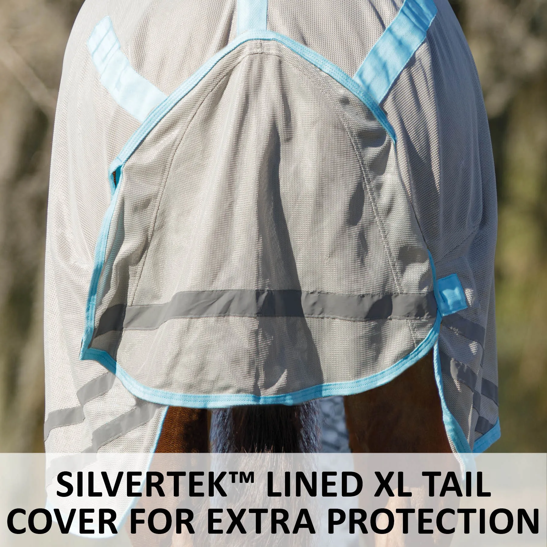 This 'cooling' fly sheet with an attached neck is your go-to when the weather gets hot due to its advanced technical material that actually cools your horse. We blended our soft, opaque 300D polyester mesh with a combination of 45% polyester cooling yarn and 55% nylon cooling yarn to create a material that cools and inhibits sweating. The fly sheet cools off as your horse heats up, keeping your horse as comfortable as possible. It protects your horse from small to medium-sized bugs, such as gnats and flies, and offers exceptional 80% UV protection, with a fleece comfort strip at the wither and higher gussets for better mobility. With new reflective stripes for safety and added SilverTek® technology, you'll love all the benefits this unique fly sheet offers.
