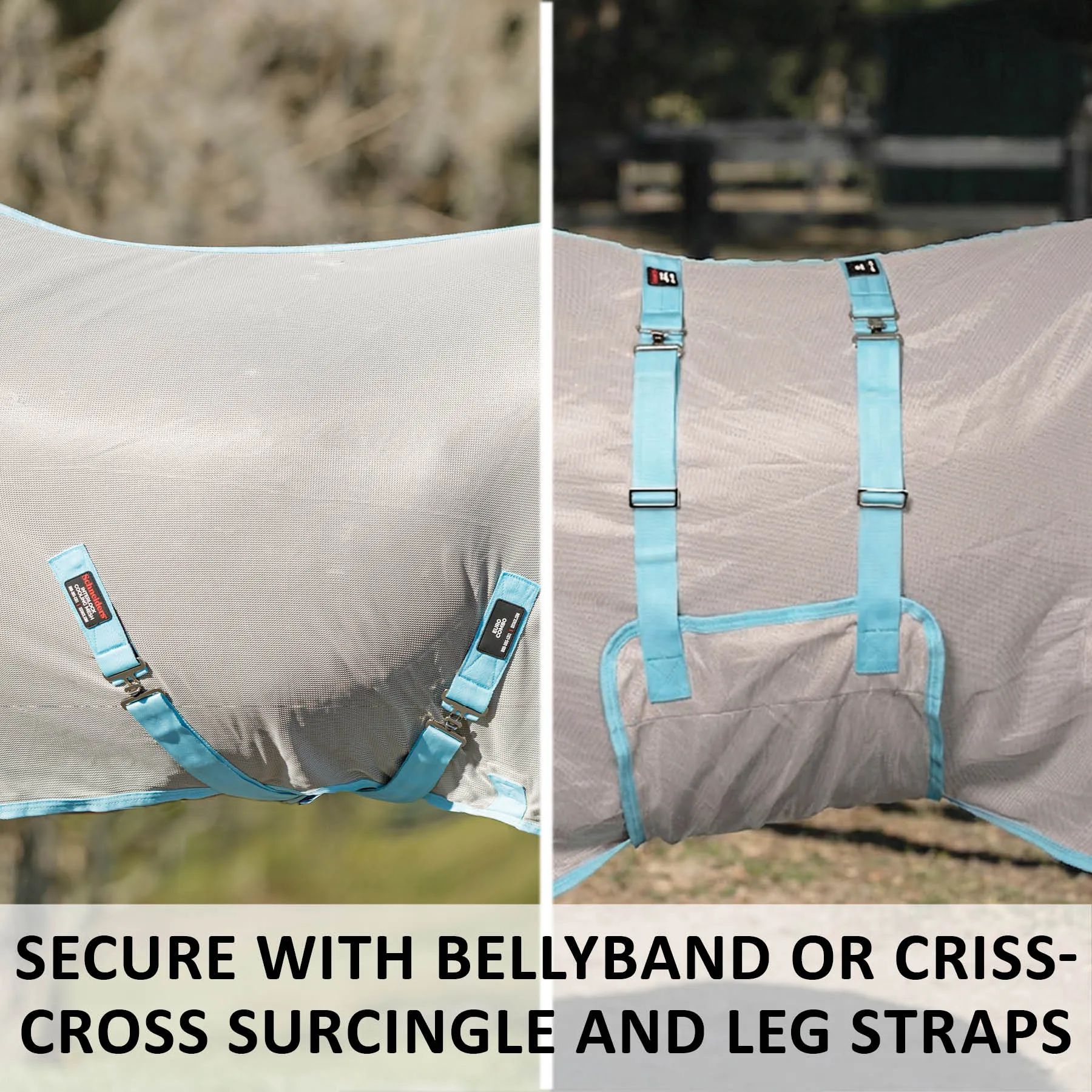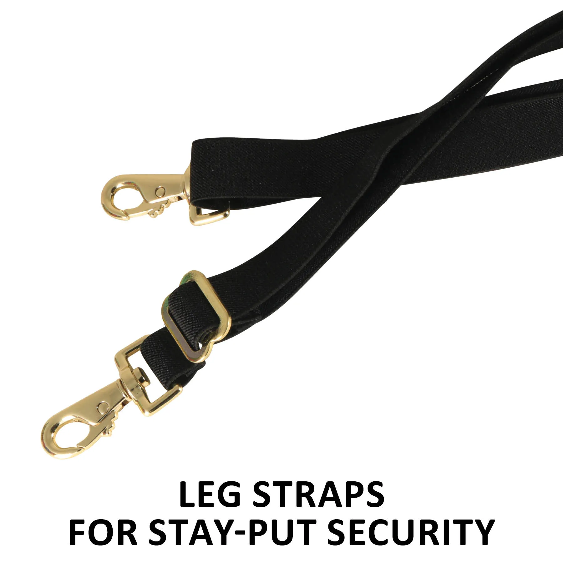 - Criss-cross surcingle closure and detachable elastic leg straps included
