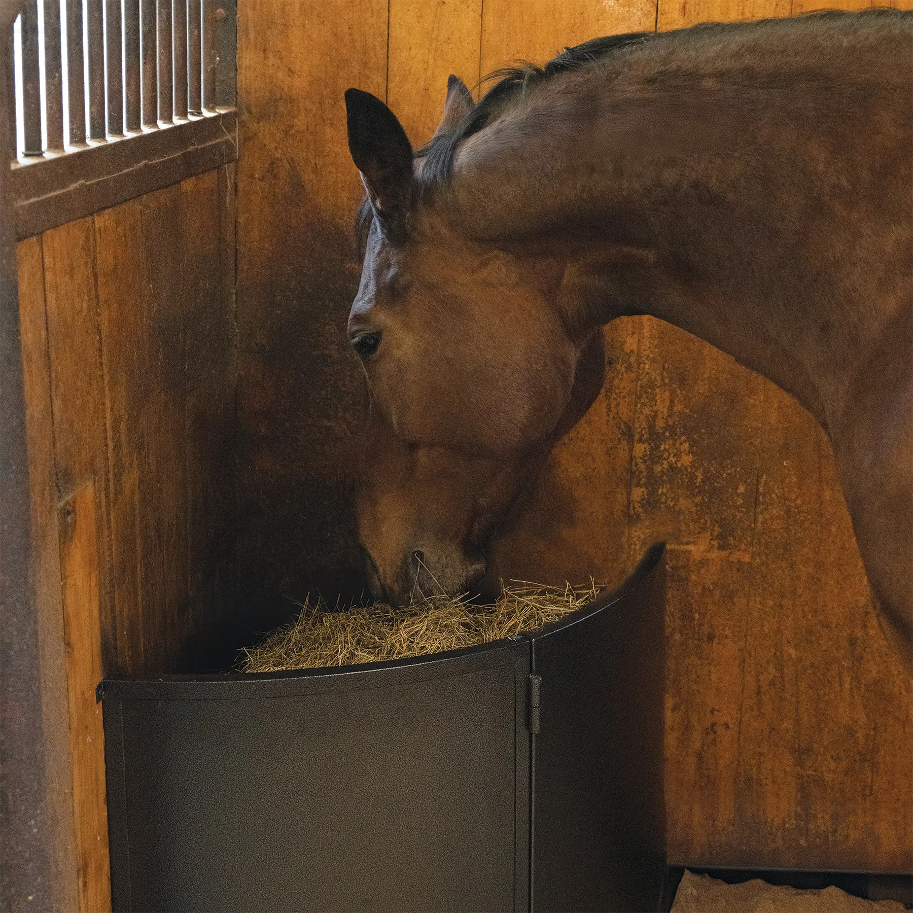 Designed to fit snugly into the corner of your horse's stall, this solid panel hay feeder keeps hay neatly contained where it belongs. No more hay dragged all over the stall floor, this feeder reduces mess and waste while encouraging better hay consumption. With a strong steel build and smart features like stabilizing bars and a sawdust-blocking plate, it's built to last and save you money in the long run.