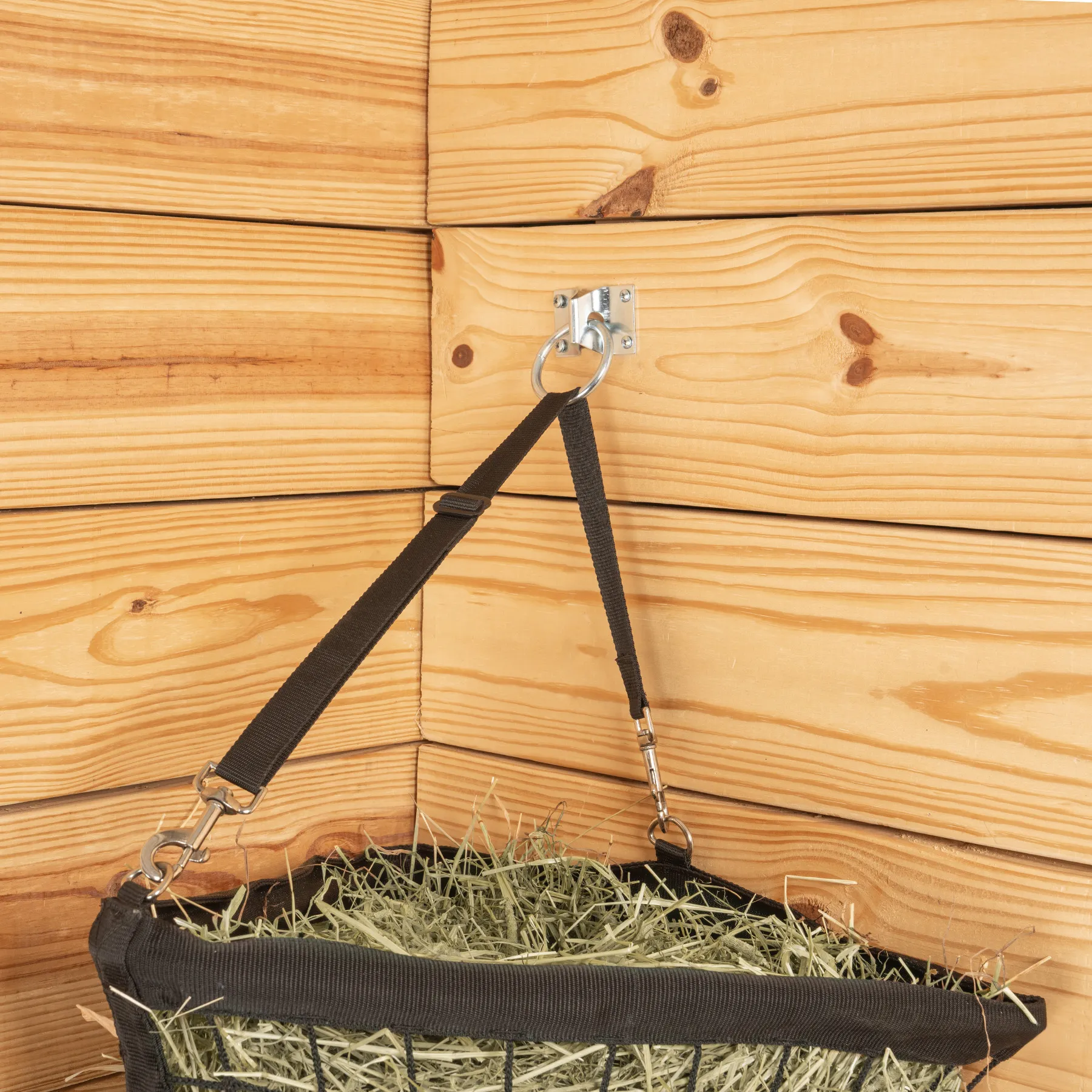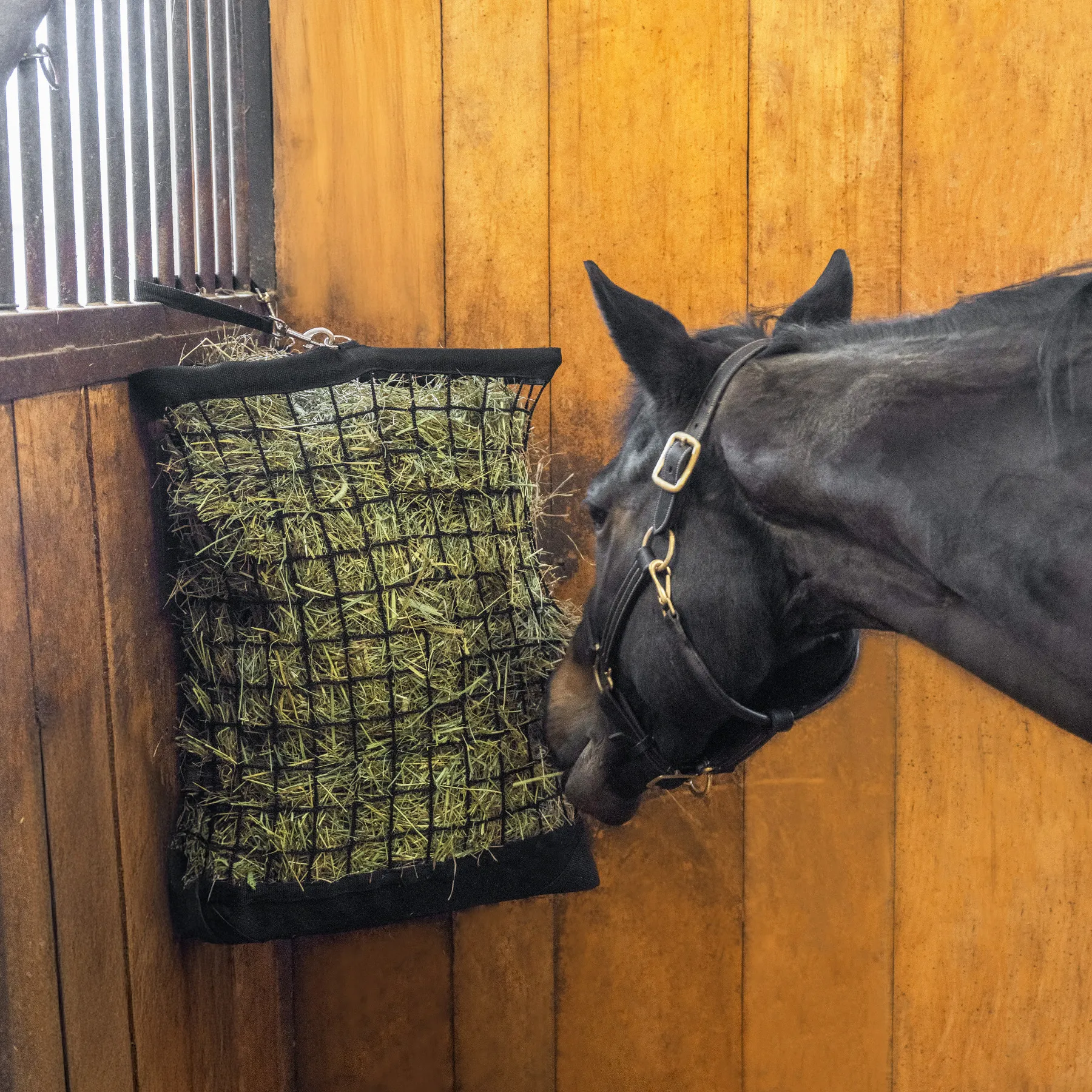This corner-style slow feed hay net keeps hay neatly contained and horses happily grazing while in their stall. Designed to fit securely into stall or trailer corners, it helps reduce hay waste while encouraging a more natural, slower feeding pattern. The knotless netting is gentle on noses and teeth, while the durable body stands up to daily barn use. Easy to load and simple to hang, it makes feeding time more efficient and less messy.
