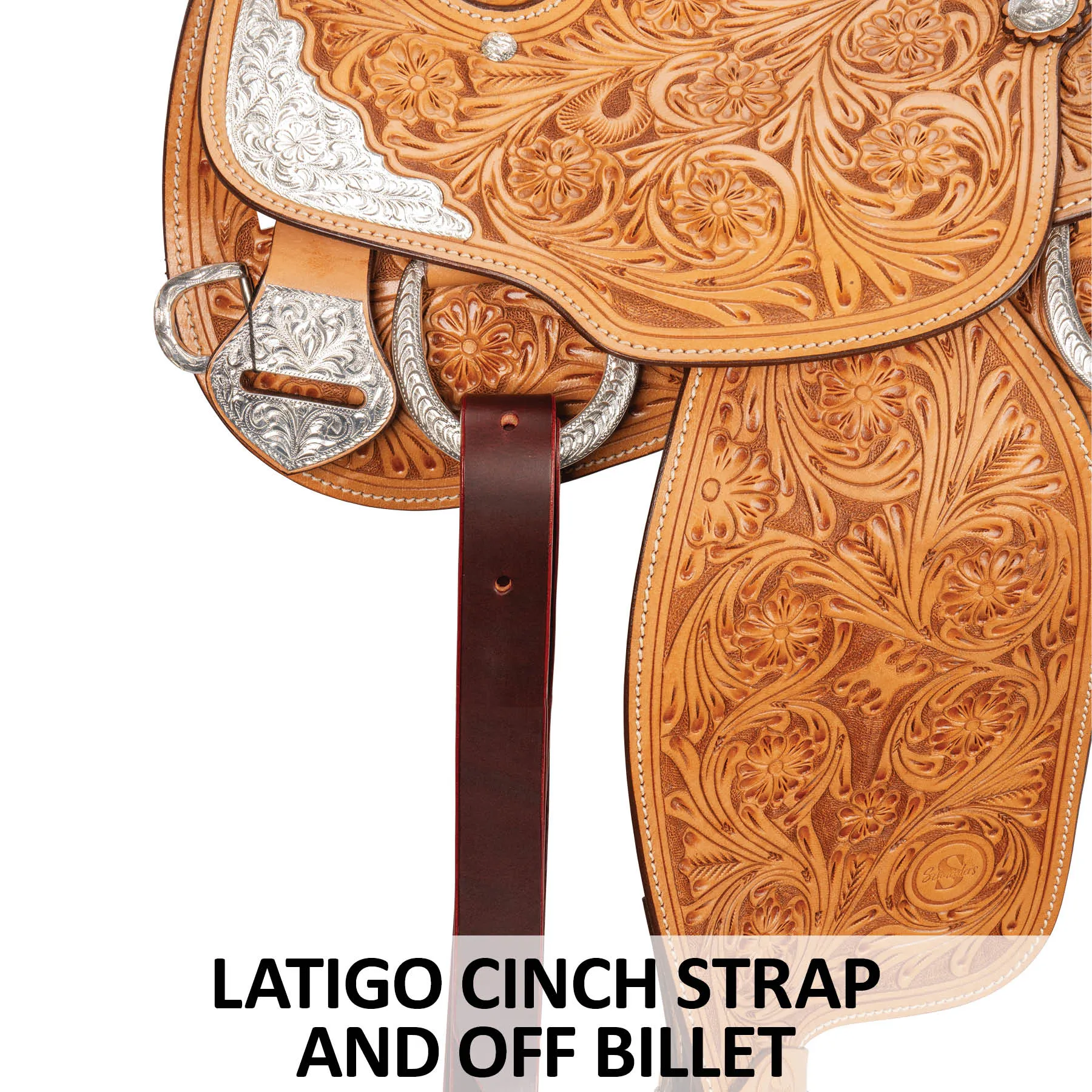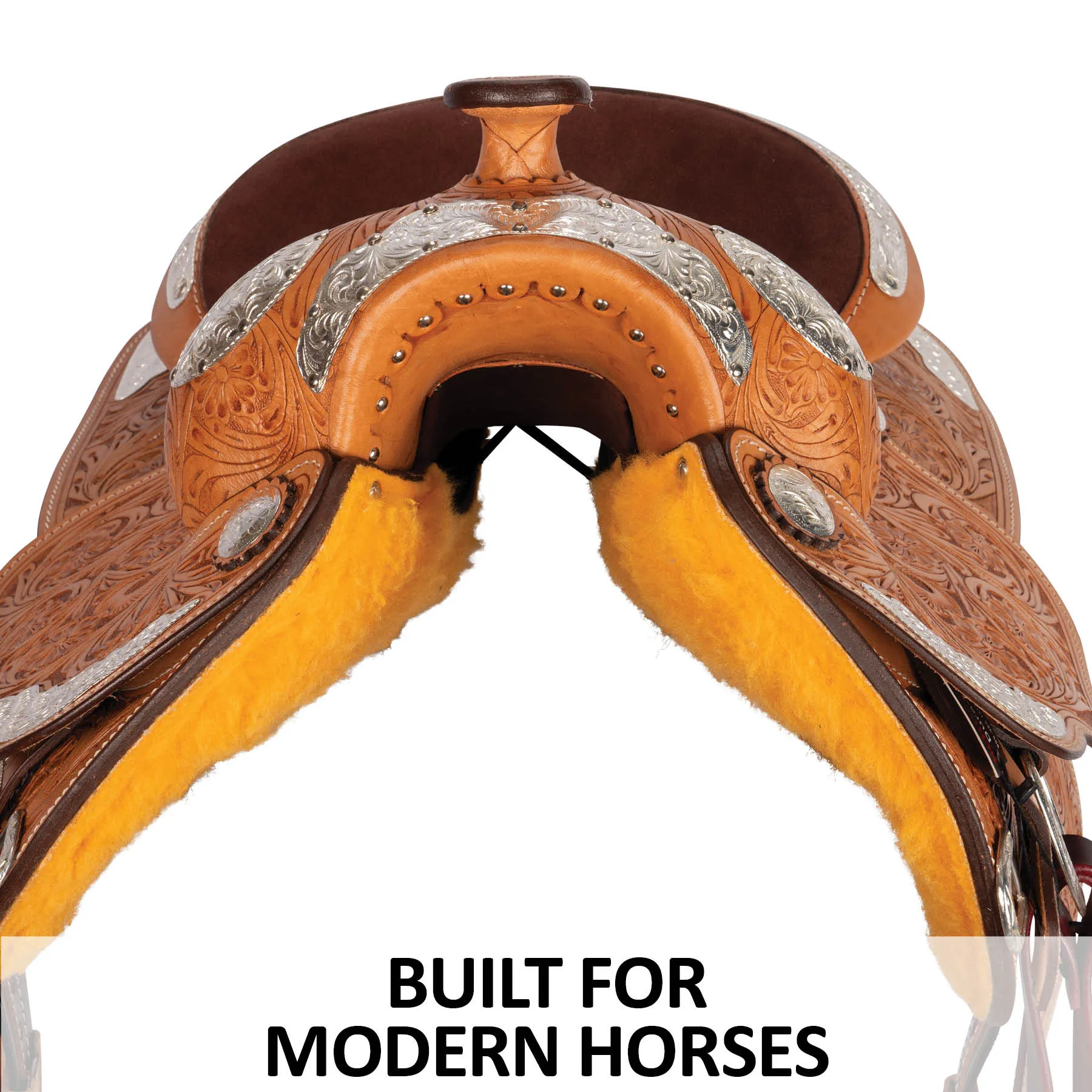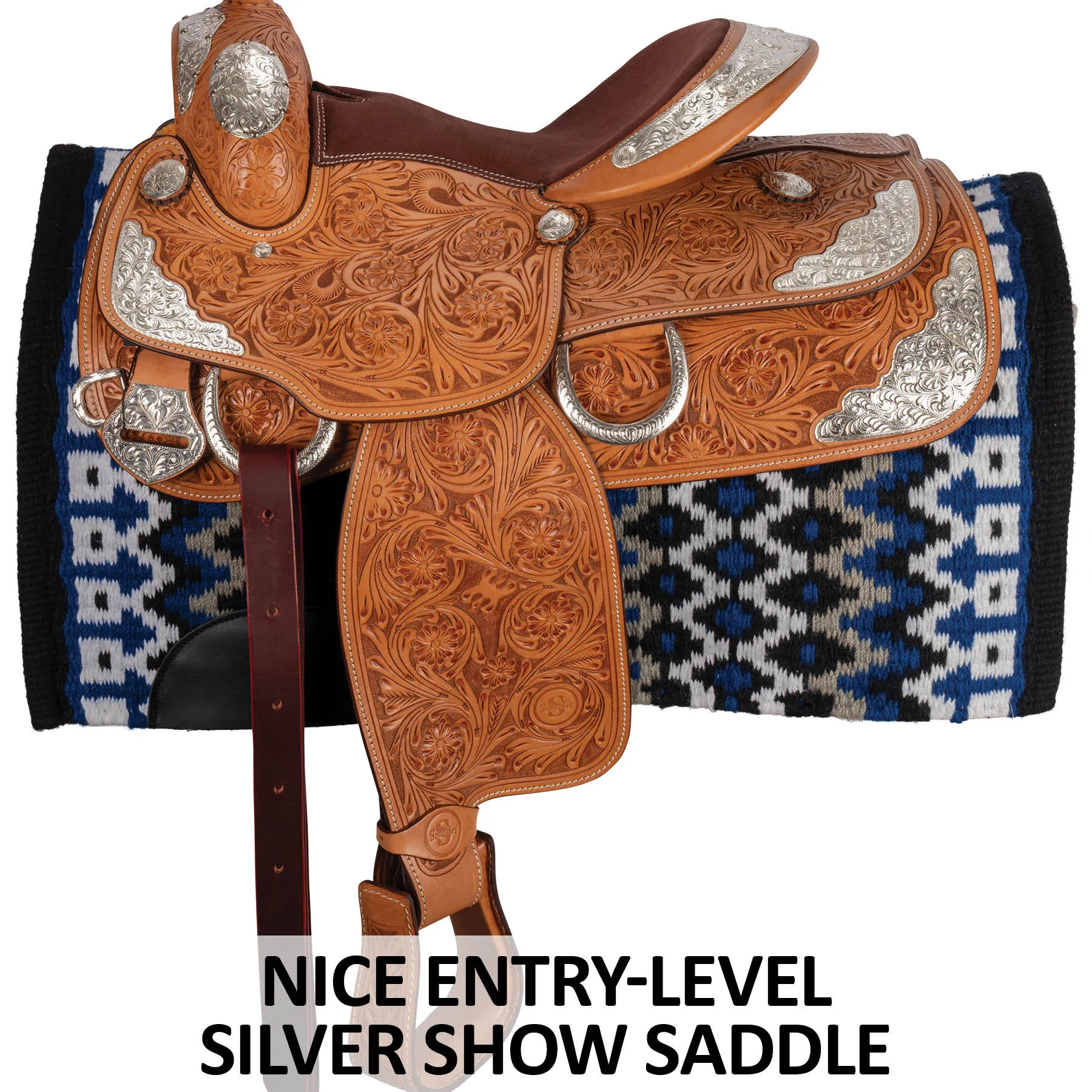This western show saddle places riders in the correct position for optimum performance. Built on a lightweight rawhide-wrapped fiberglass tree, this saddle features a beautiful rosette tooling pattern and is loaded with engraved silver-plated trim. The suede seat and cutaway under fenders offer the ultimate close contact feel, so you feel beautiful and secure every show. Semi-quarter horse bars accommodate today's modern conformations, including Arabians and Quarter horses. Turn heads in the arena with this stylish and ultra-functional saddle!