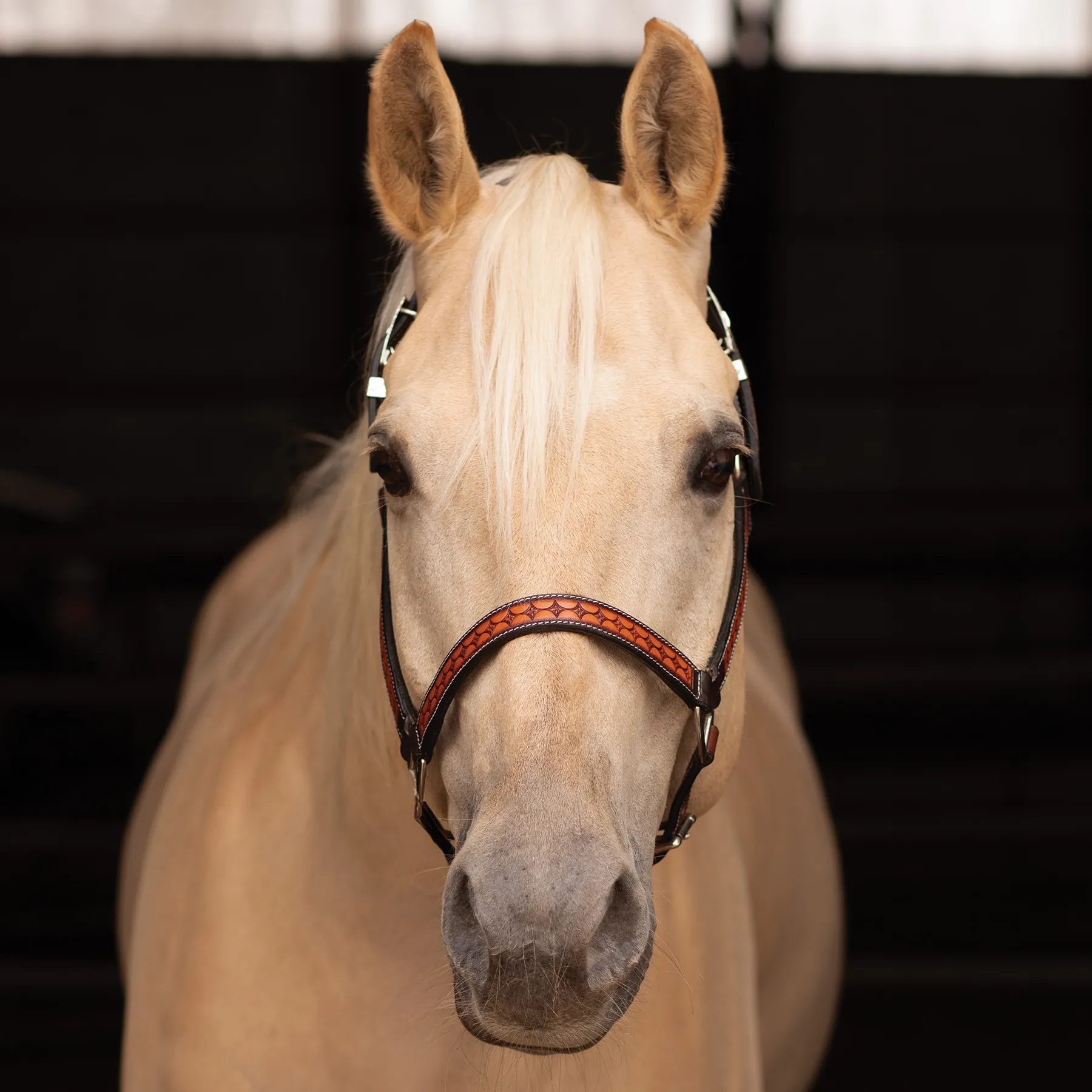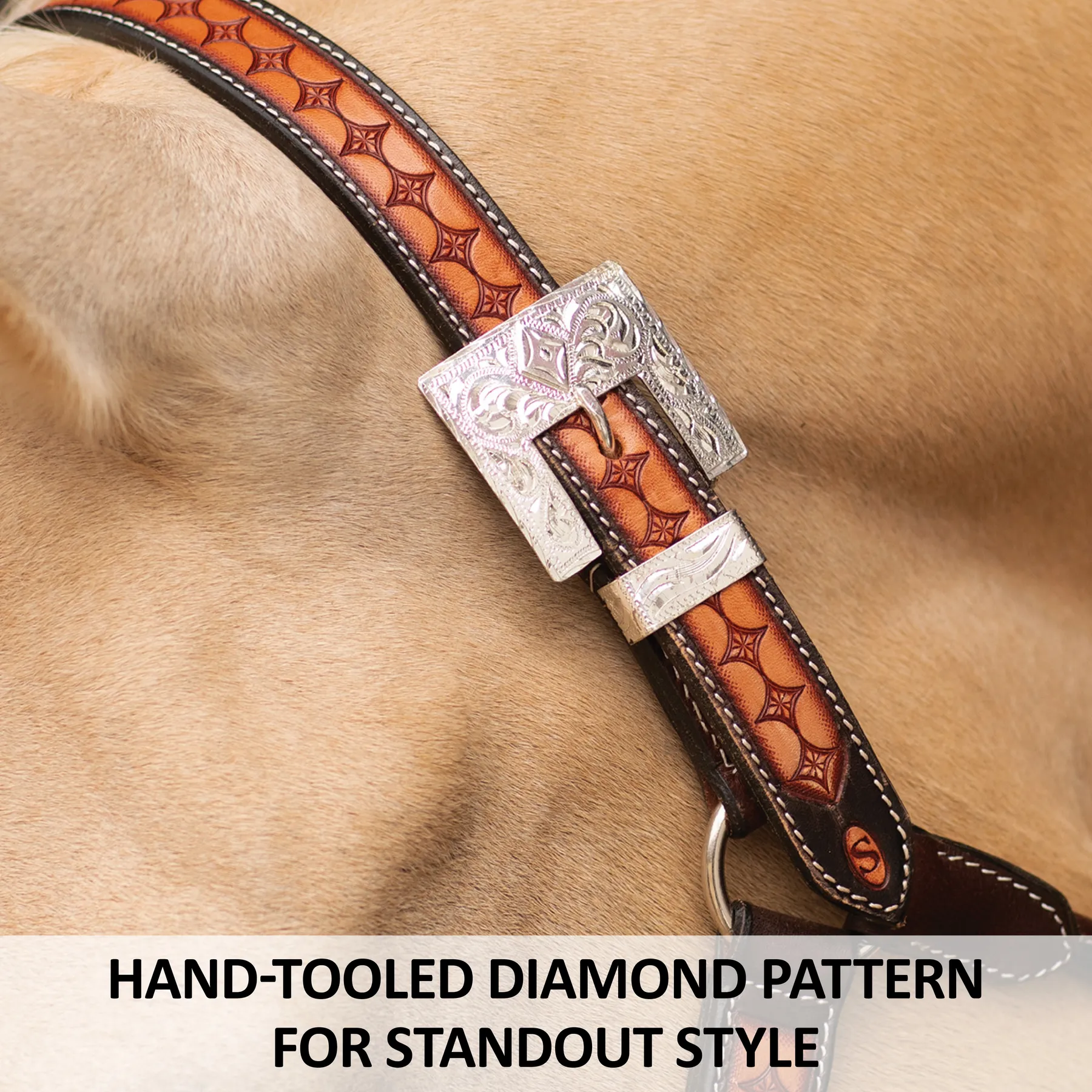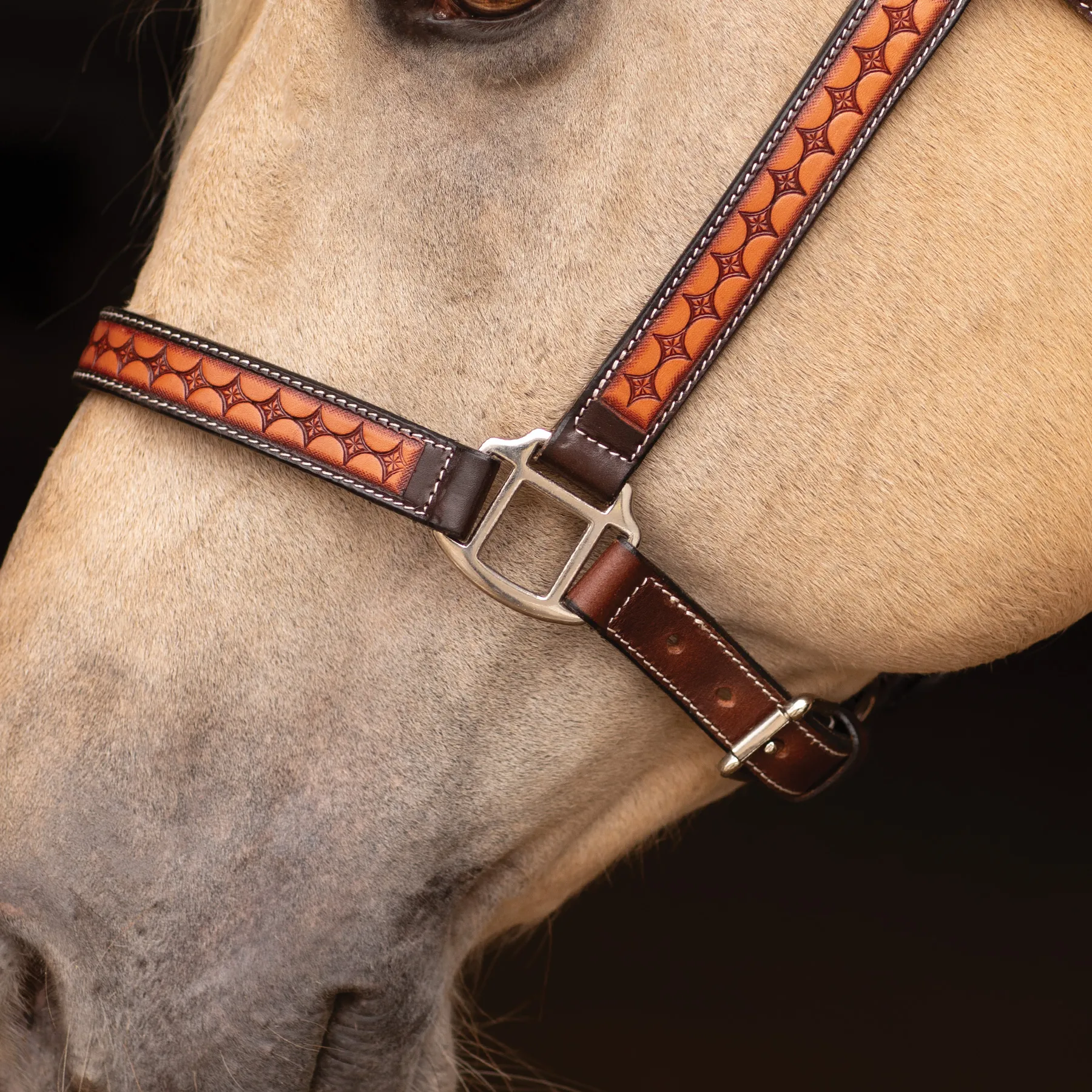 Step into the ring with confidence in our Sunburst Ranch Western Show Halter. Designed for Ranch Halter classes and everyday elegance, this hand-tooled leather halter strikes the perfect balance between style and function. With a 1" wide crown, cheeks, nose, and gullet, plus a three-piece gullet connection, this halter provides a polished, refined look that enhances your horse's natural head shape.