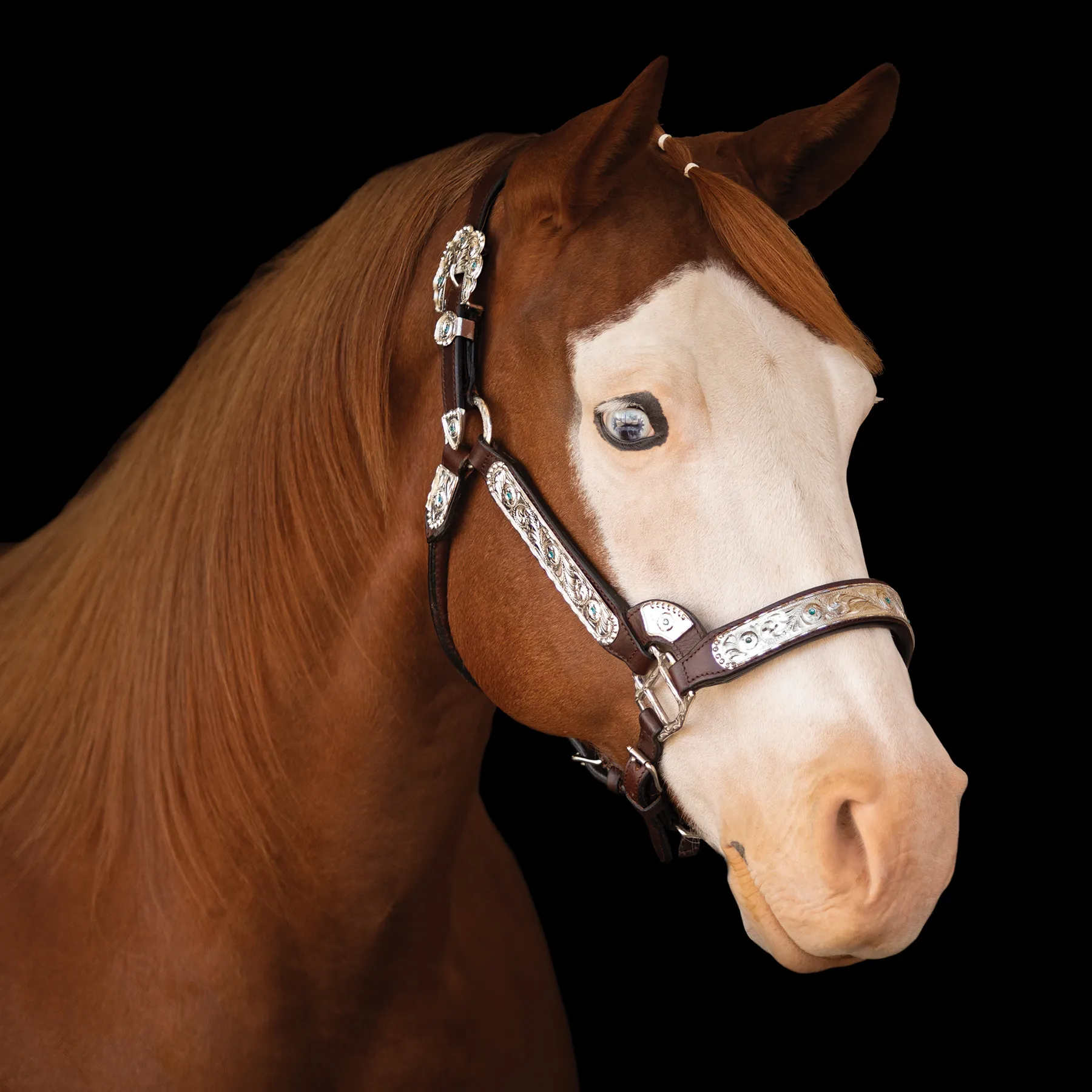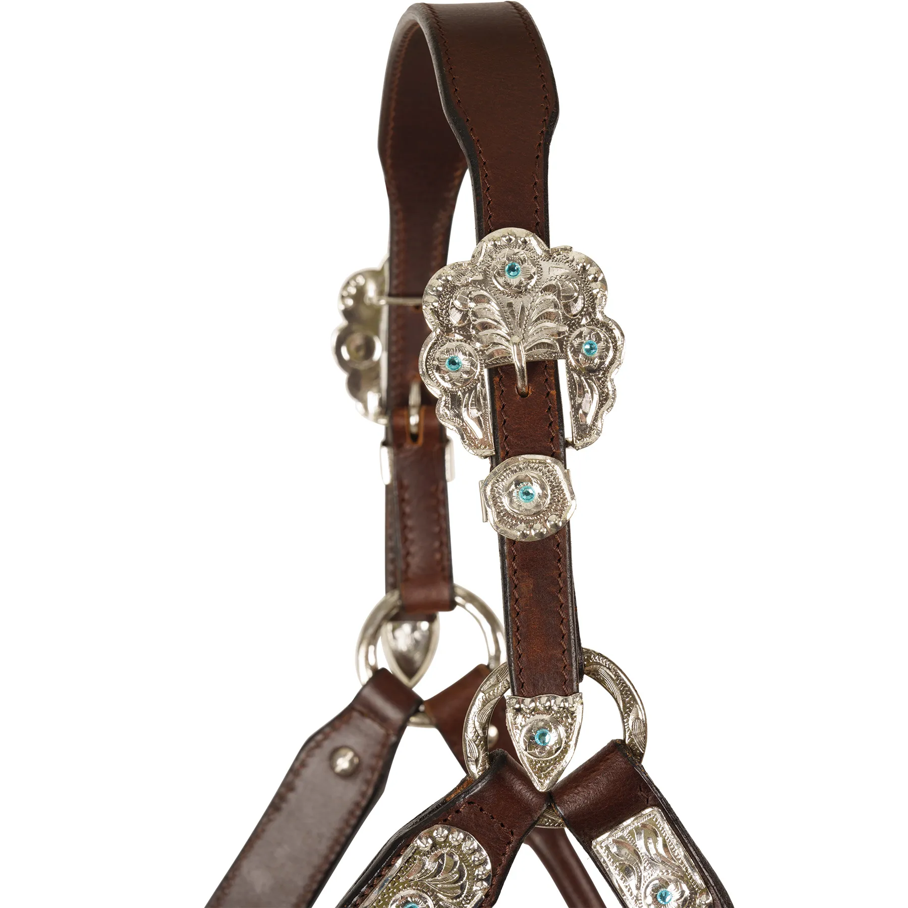 Elegant silver-plated cheeks, nose, and buckle with blue stone inlay