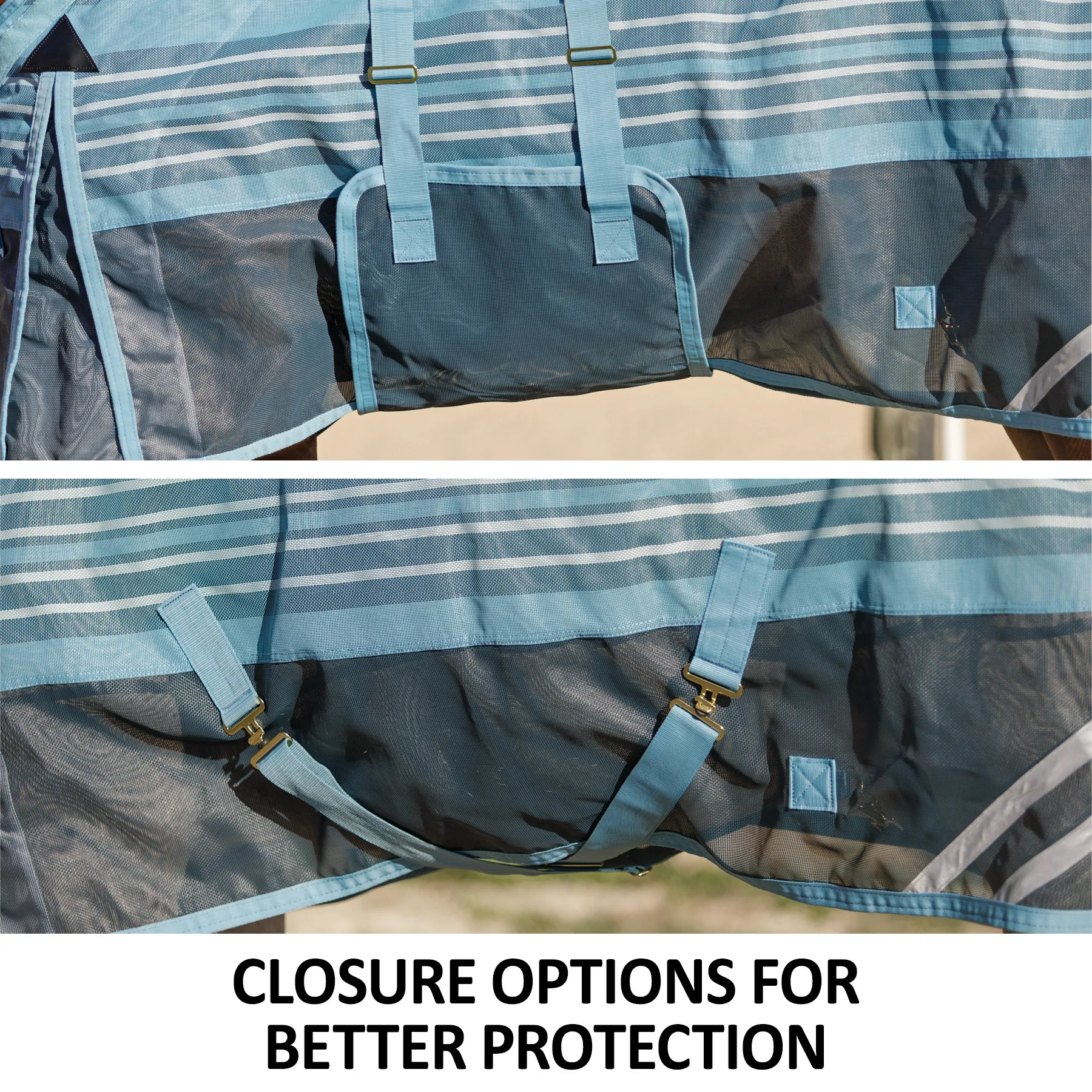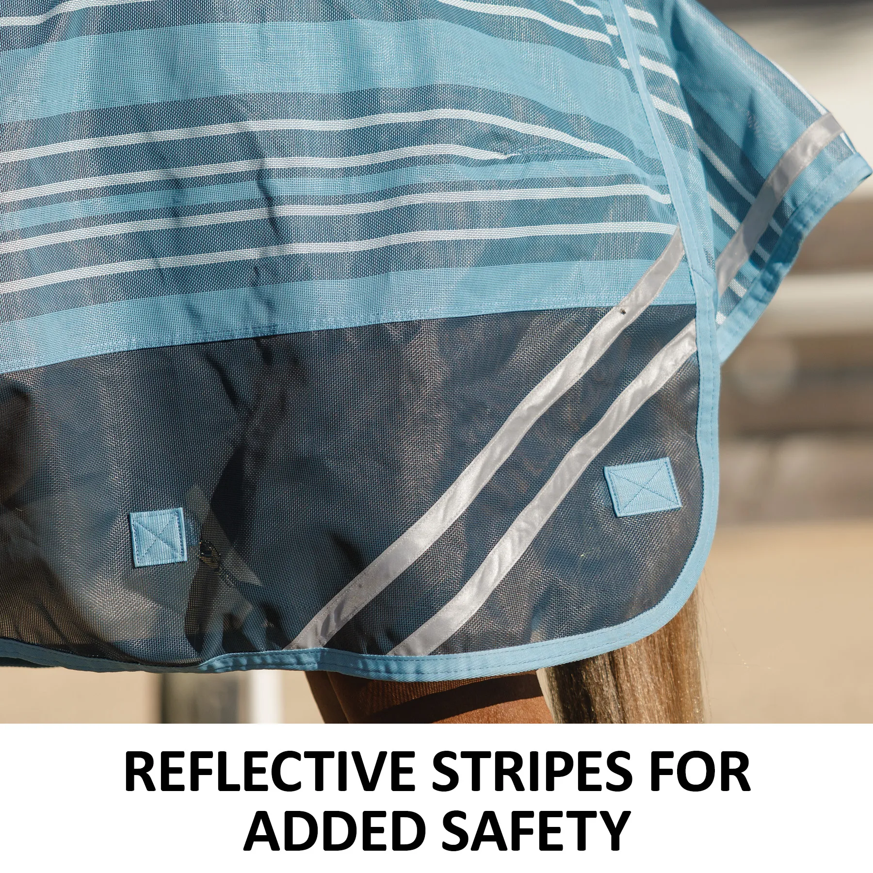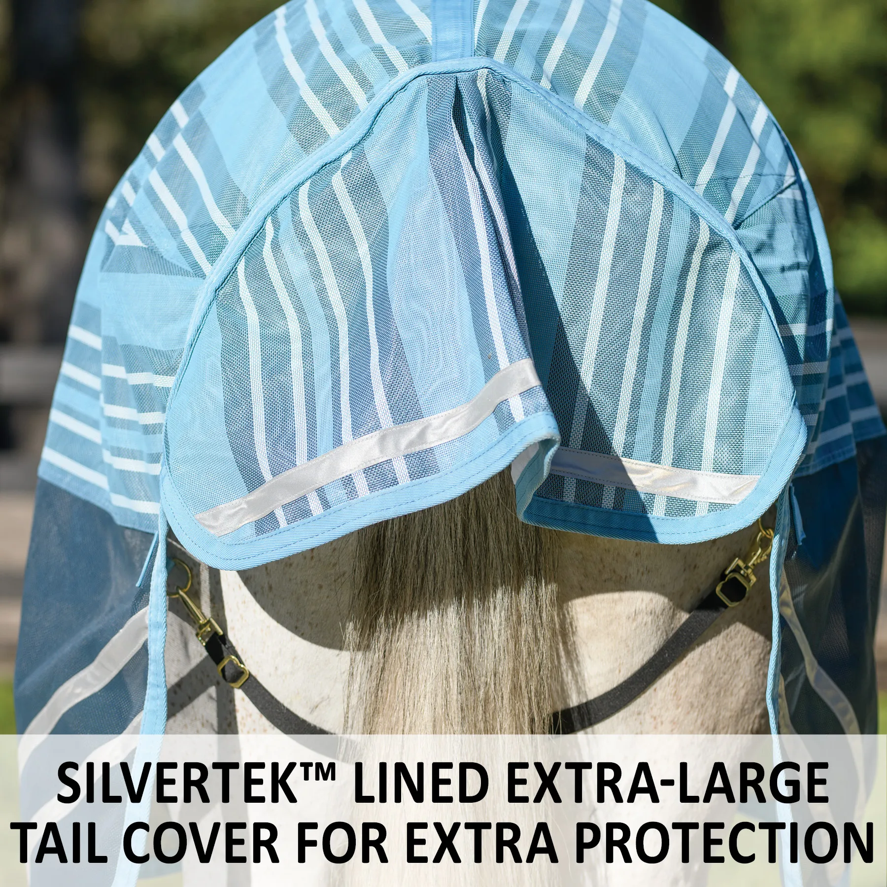Your favorite, most durable fly sheet is back with a new modern, blue-striped design, reflective stripes, and SilverTek® technology with antibacterial nylon lining on the chest, shoulders, and tail. The durable 1000D heavy polyvinyl-coated mesh withstands the rigors of turnout, perfect for those horses that play rough in the pasture, and it shields your horse from sun damage with 70% UV protection. With this durable sheet, your horse will be protected from medium to large-sized insects, such as deer flies, greenheads, and horse flies. It's available in multiple fits with features that prevent rubbing, offer unbeatable protection, and include a 3-year warranty. Don't forget to complete the look with the matching neck cover and boots.