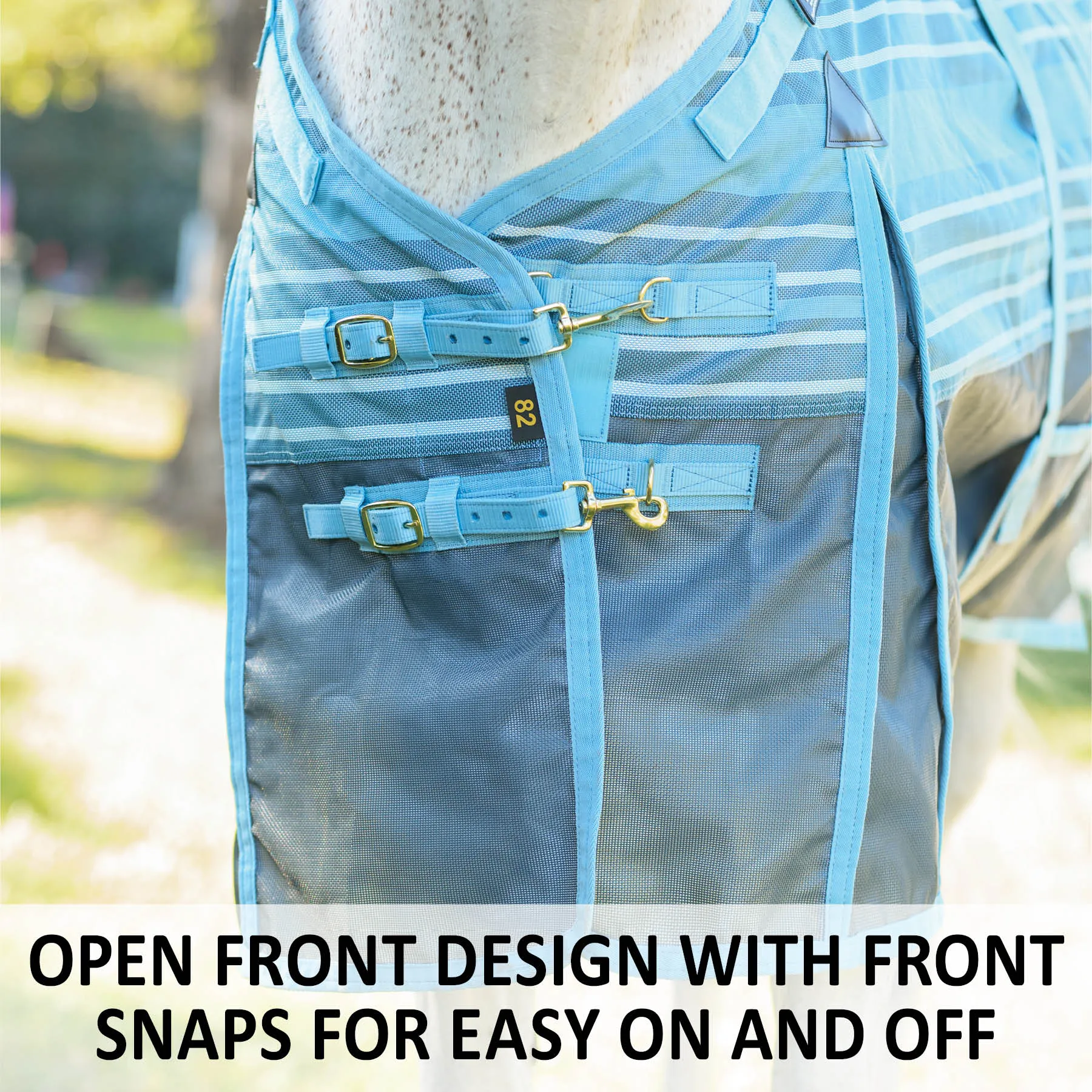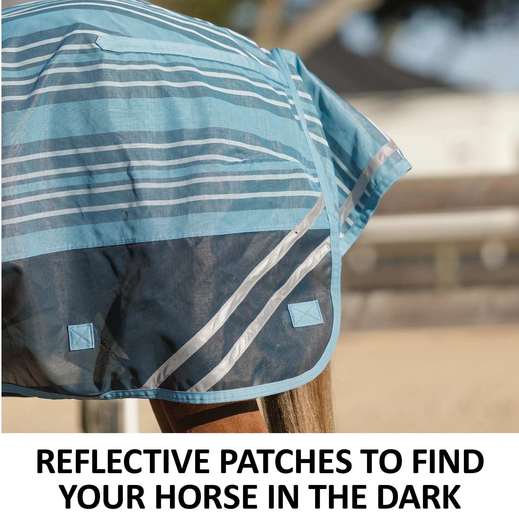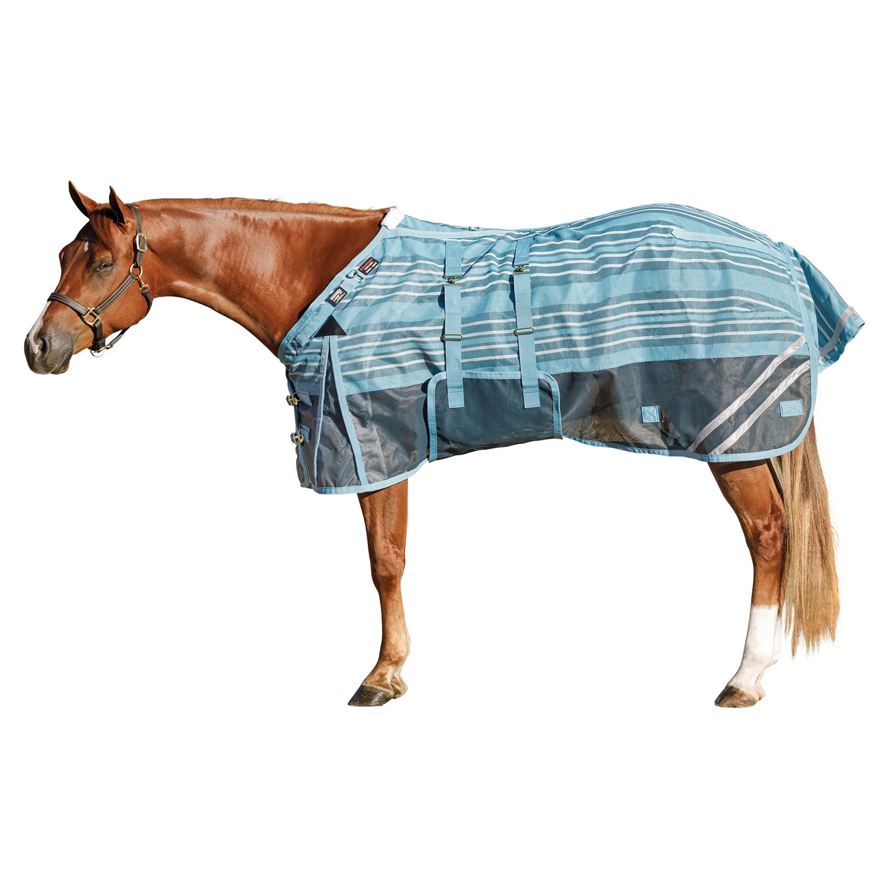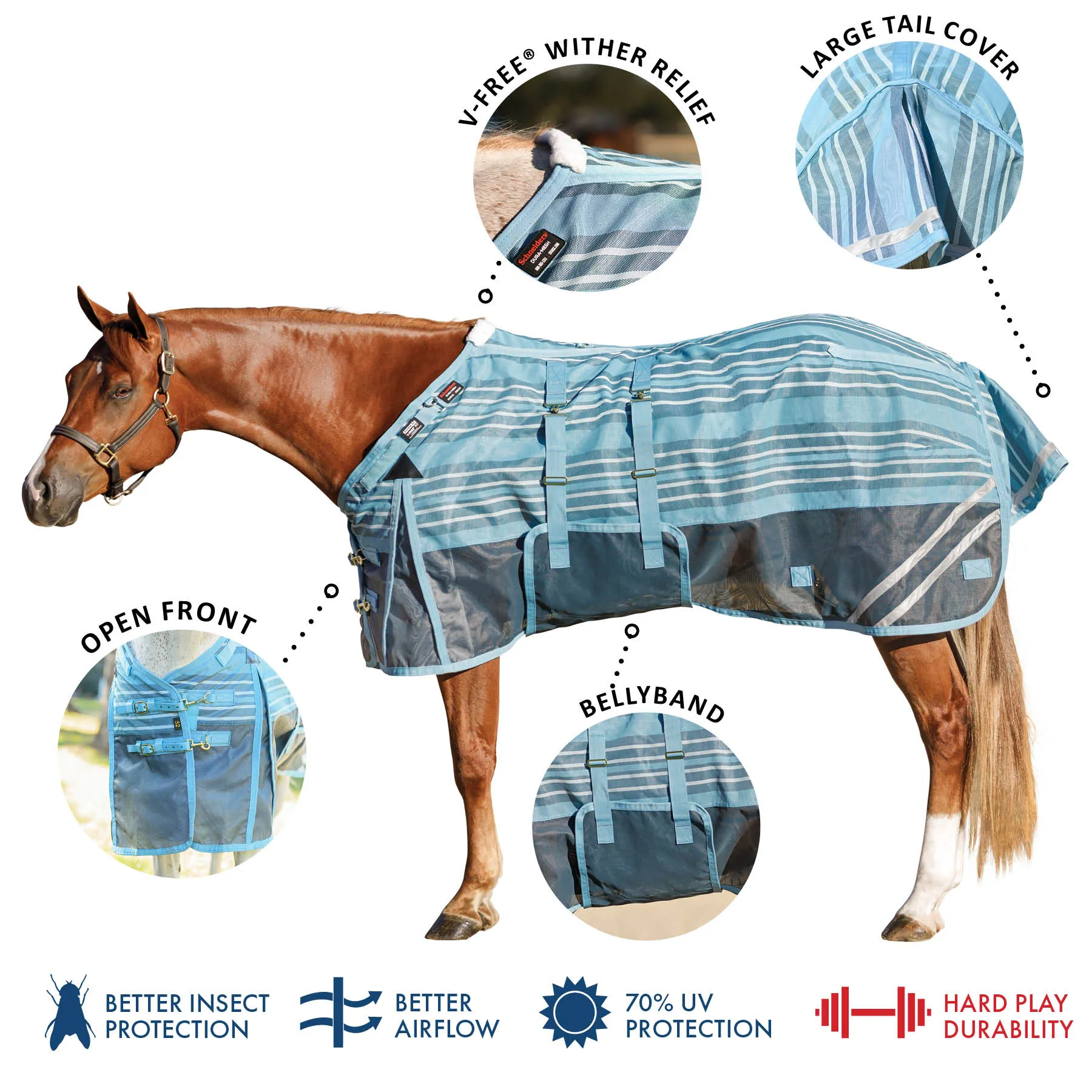 Your favorite, most durable fly sheet is back with a new modern, blue-striped design, reflective stripes, and SilverTek® technology with antibacterial nylon lining on the chest, shoulders, and tail. The V-Free® Wither Relief fit and Bellyband closure give low to moderate-withered horses the ultimate protection. The durable 1000D heavy polyvinyl-coated mesh withstands the rigors of turnout, perfect for those horses that play rough in the pasture, and it shields your horse from sun damage with 70% UV protection. With this durable sheet, your horse will be protected from medium to large-sized insects, such as deer flies, greenheads, and horse flies. It's available in multiple fits with features that prevent rubbing, offer unbeatable protection, and include a 3-year warranty. Don't forget to complete the look with the matching neck cover and boots.