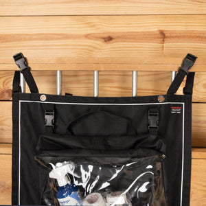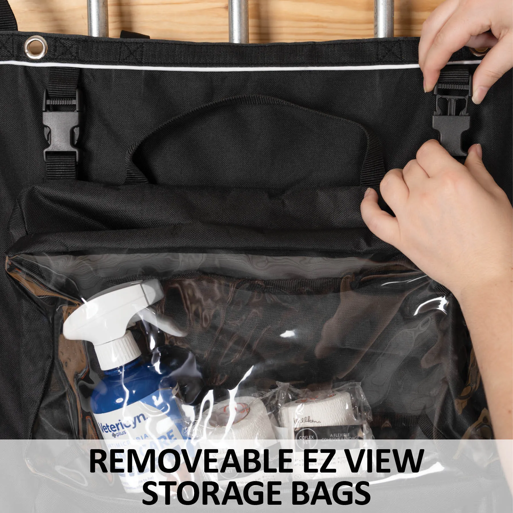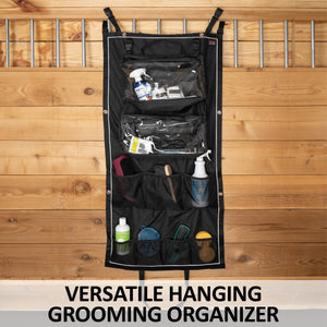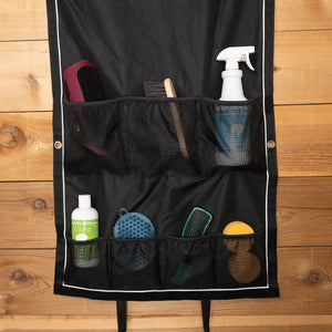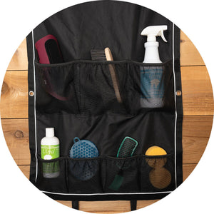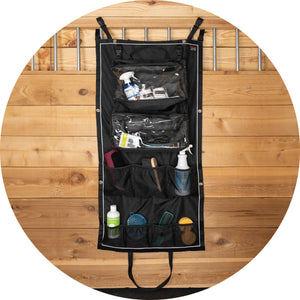 This useful hanging organizer can hold brushes, combs, hoof picks, grooming bottles, and more. The clear-view zippered pockets are perfect for first aid supplies, clipper storage, medications, and other small items. Hang this near the grooming area, in tack rooms, and at horse shows to keep an assortment of your equipment well-organized and always easy to find!