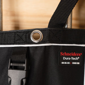 Two rows of 1000 denier mesh with elastic tops can hold various-sized brushes, bottles, boots, combs, and hoof picks. The 3 large mesh pockets measure 7" wide x 8" tall, 4 mesh pockets measure 5" wide x 5 1/2" tall.