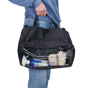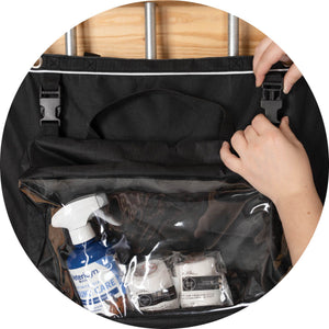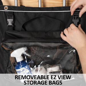 Two zippered top storage bags with a clear-view front panel, clips on and off the grooming panel for fast on-the-go use. Each bag is 15" long X 8" tall X 8" deep to fit everything from grooming tools, brushes, first aid supplies, and other small items.