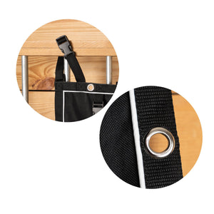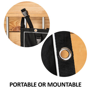 This bag comes with 2 adjustable hanging straps with quick clip connections. Each strap can adjust from 12"to 16 1/2" and fasten up to a 2" x 8"board. Grommets attached to the bag's frame offer a mounting option as well. Mounting hardware is not included.