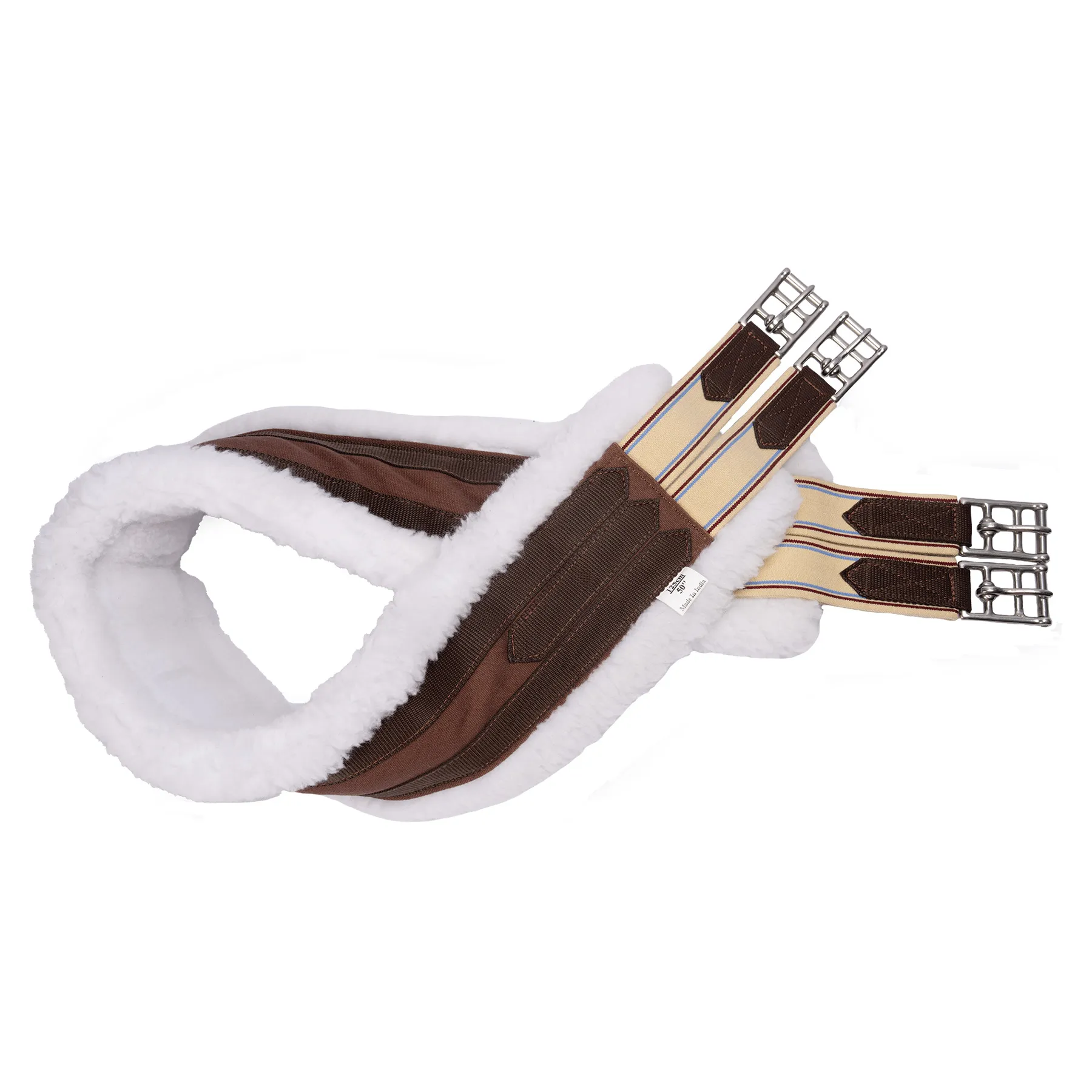 Give your horse cushioned comfort and flexibility with the double elastic fleece English girth. Perfect for everyday rides or stepping into the show ring, this girth features a thick, curly fleece lining that's soft on your horse's skin and supportive through every stride. The double-elastic ends offer excellent adjustability and freedom of movement, while stainless steel roller buckles make tacking up smooth and simple. A wide nylon/web spine adds durability, and a center D-ring gives you easy access for training attachments.