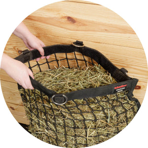 We have added a top rim that stays open while you fill with hay, making filling hay bags easier than ever. Simply pull open to load and push sides together to close when done.