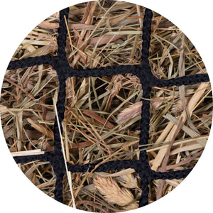 The netting is crafted from a soft poly material that withstands everyday use while being gentle on your horse's teeth. It allows your horse to comfortably push against it to pull hay out.