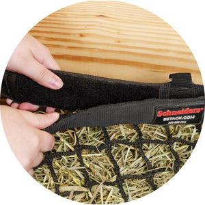 It includes hook and loop closures inside to ensure the top stays closed. The addition of 1.5" stainless steel O-rings for hanging helps prevent top feeding, keeping the hay securely inside.