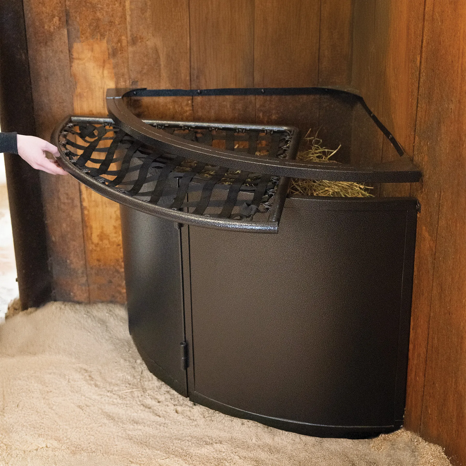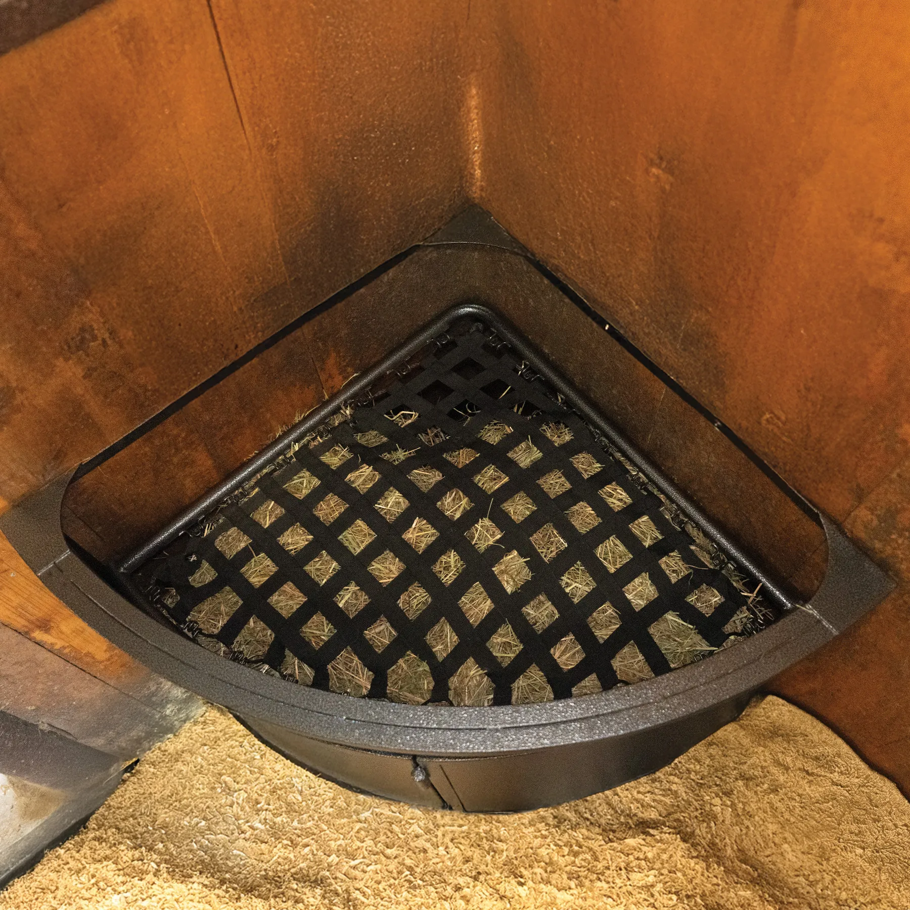 - Corner-mounted design prevents hay scattering
