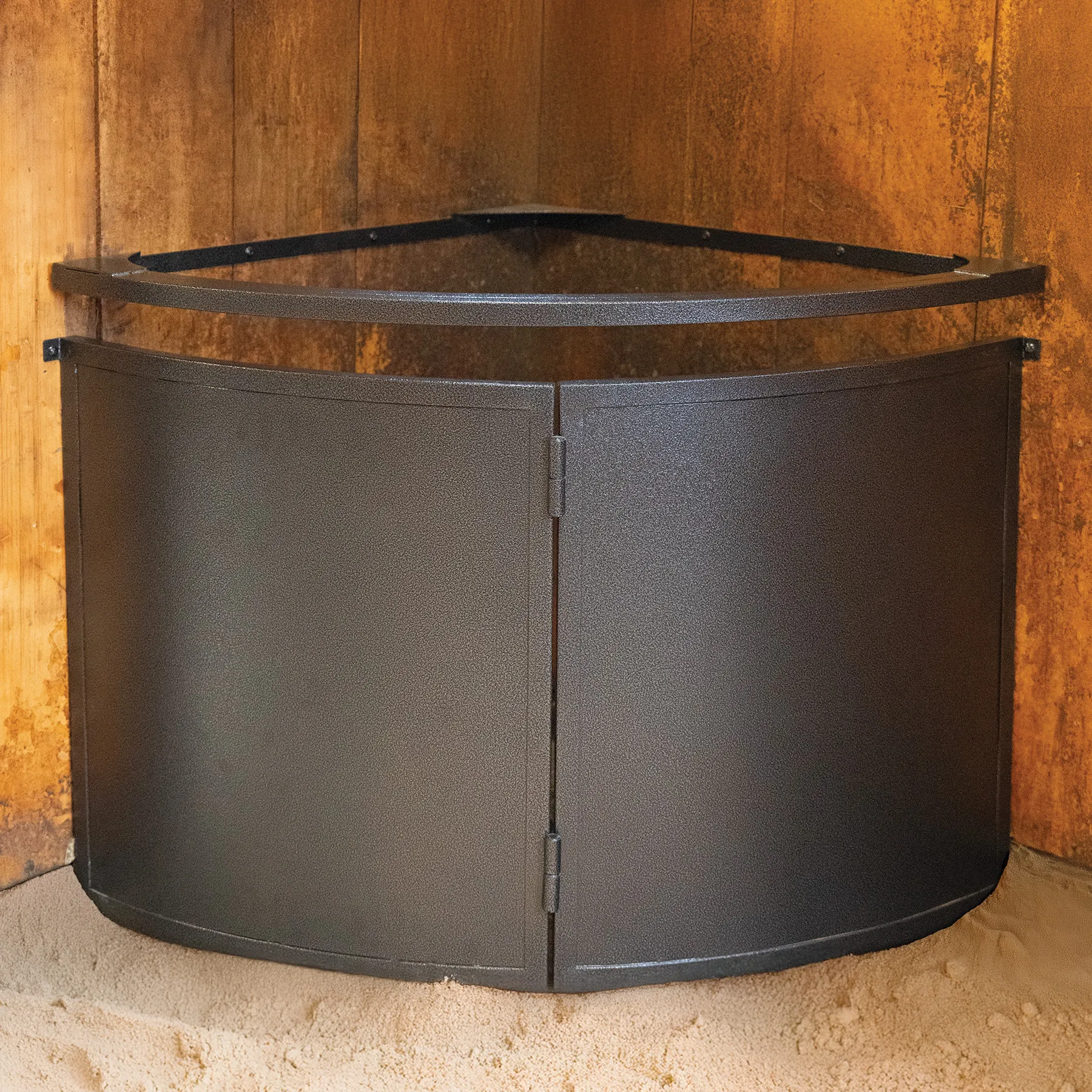 This solid corner floor hay feeder is your go-to solution for reducing hay waste while encouraging your horse to eat more slowly and naturally. Designed with durability and smart feeding in mind, it features a slow-feed netted lid with 1.5" spacing to help mimic grazing behavior. Built tough with reinforced steel and finished in rust-resistant Black Armor coating, it's made to last day after day, flake after flake. Easy to assemble and even easier to load, it keeps hay neatly contained in the corner of the stall, minimizing mess and keeping your horse happily nibbling.