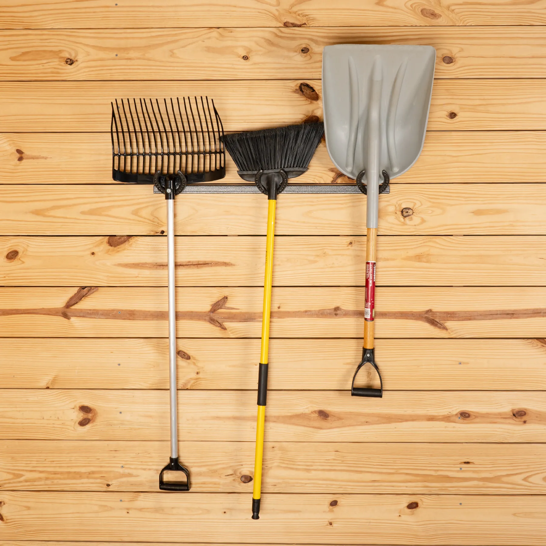 This adjustable horseshoe tool organizer allows you to customize tool spacing for a perfectly organized setup. It features three horseshoe-style holders mounted on a sliding track. Each holder can be freely adjusted left or right and locked into place with included screws, offering a flexible fit for a variety of tools. This organizer works well with most barn tools but is best suited for smaller tool heads due to the compact depth of the horseshoes. Finished in a durable gray armor coating, it resists rust and withstands heavy use.
