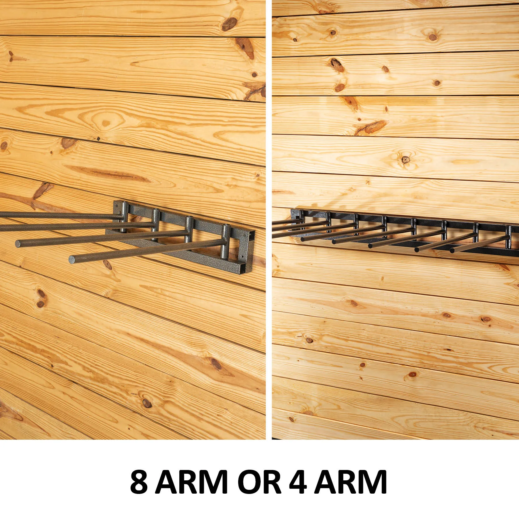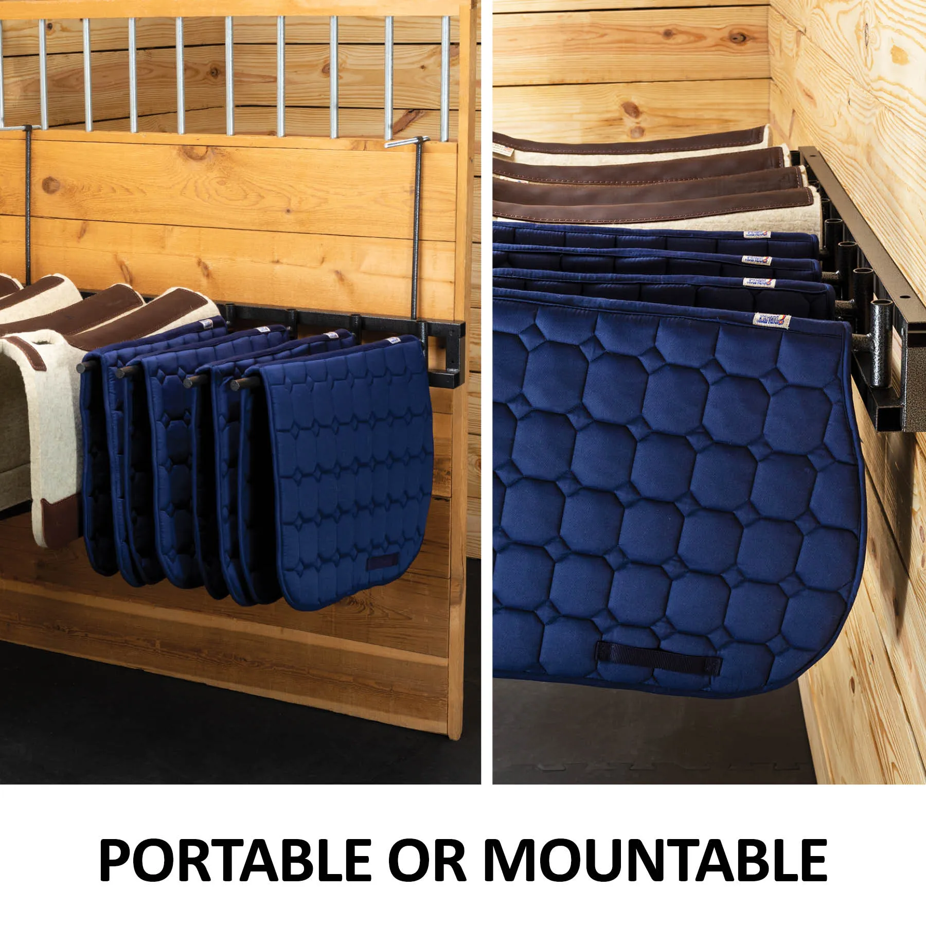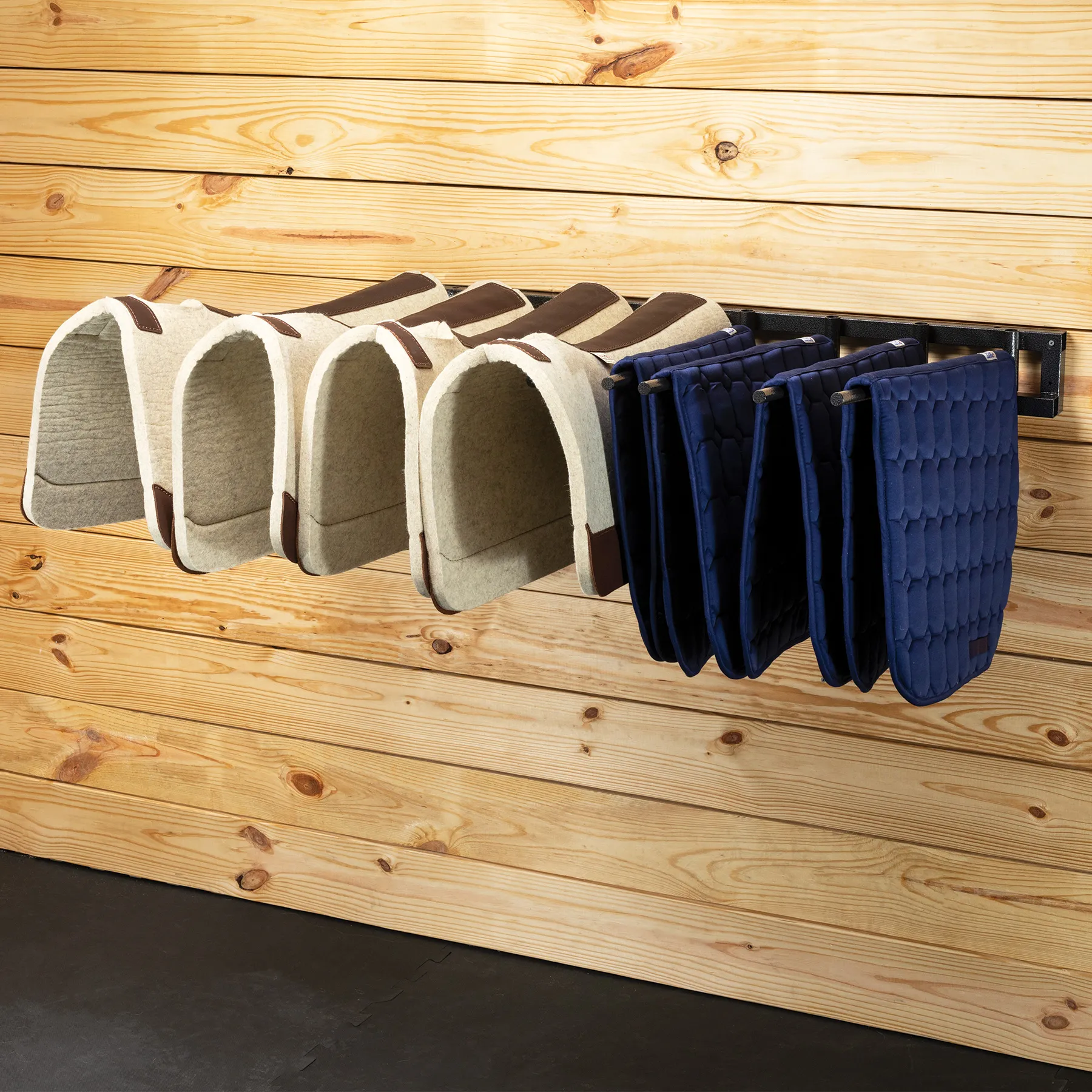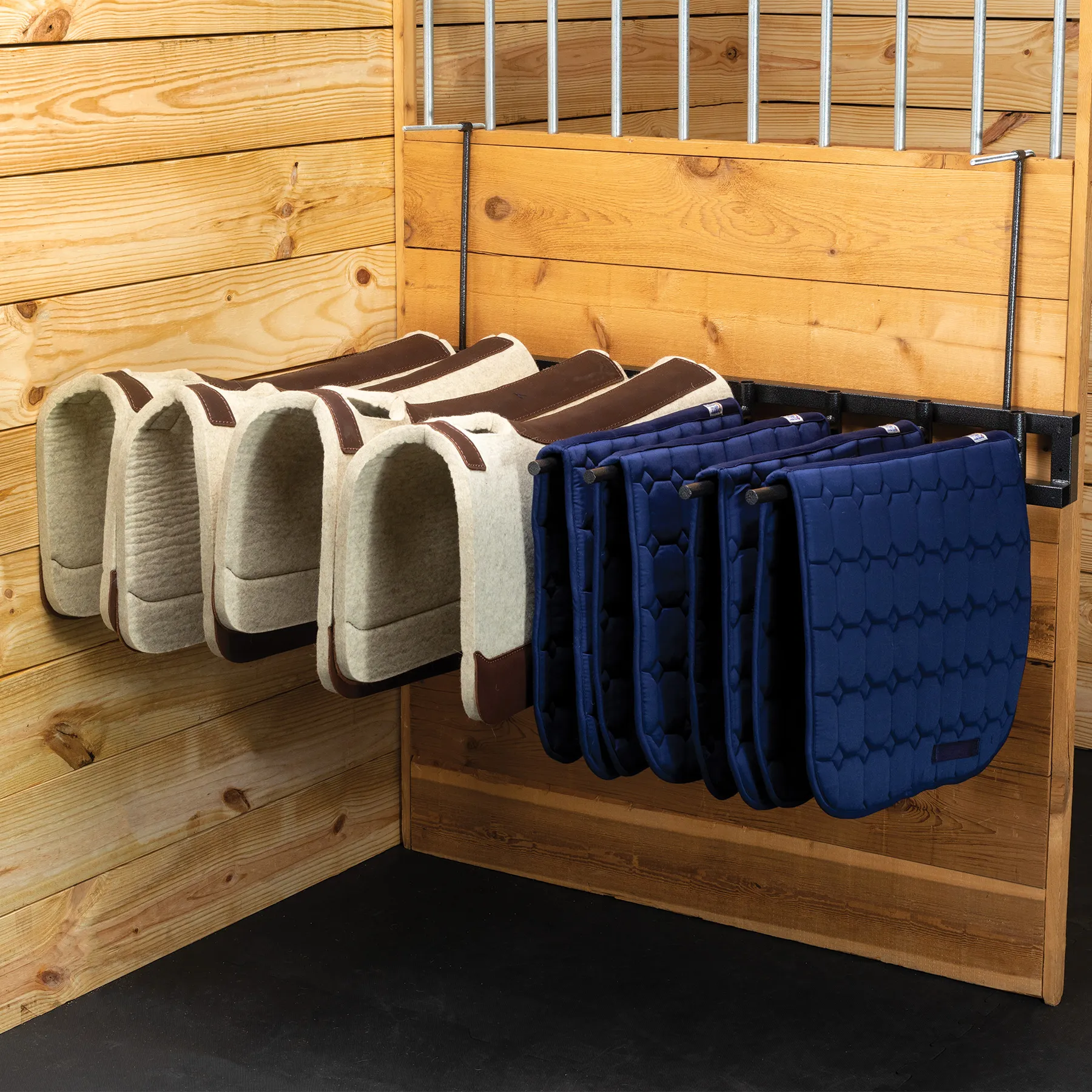 Tired of cluttered tack rooms and piles of saddle pads? This swinging blanket bar and saddle pad rack is here to keep your barn organized and your gear in top condition. Whether mounted in your barn or taken on the go, this heavy-duty rack easily supports even the bulkiest Western pads, blankets, and sheets.
