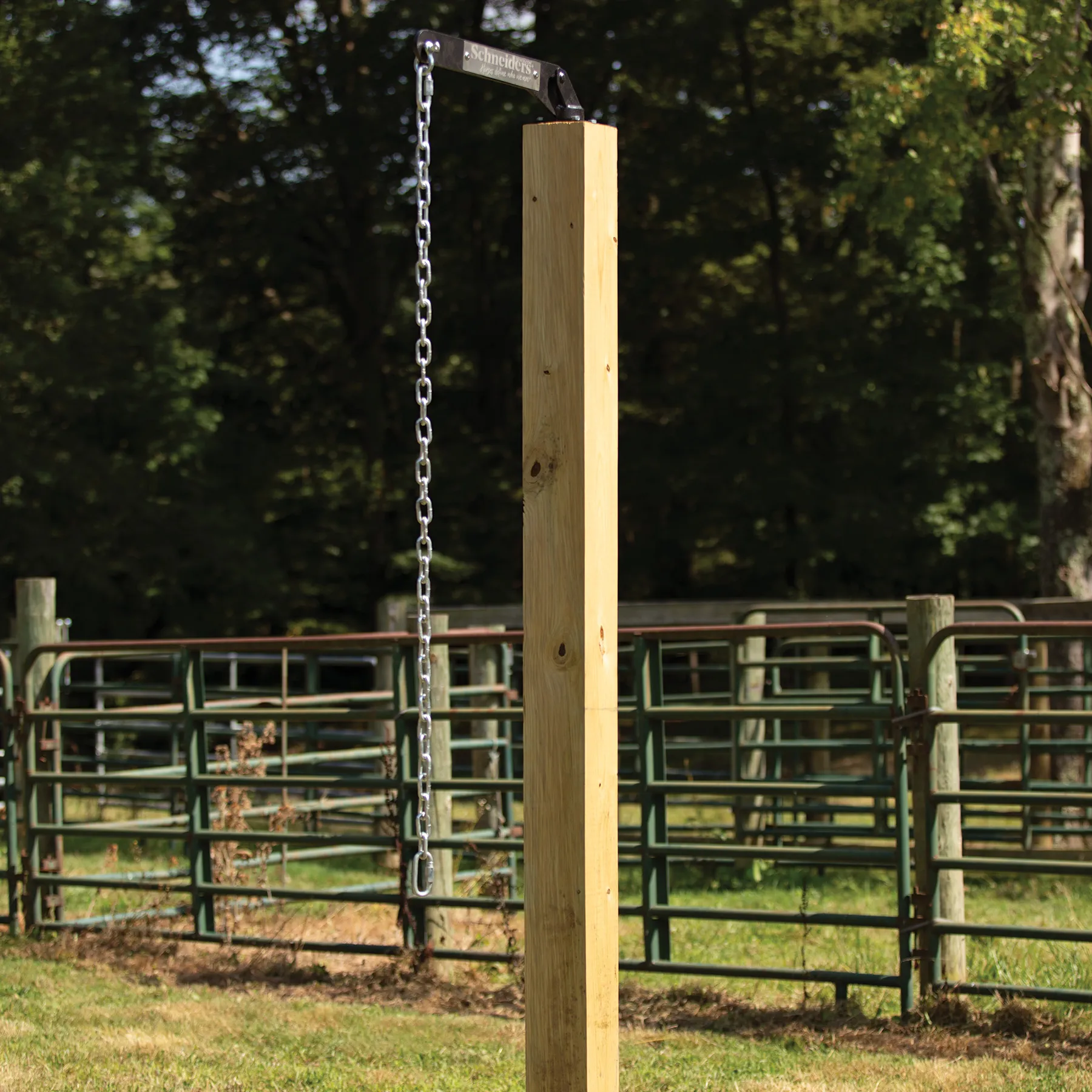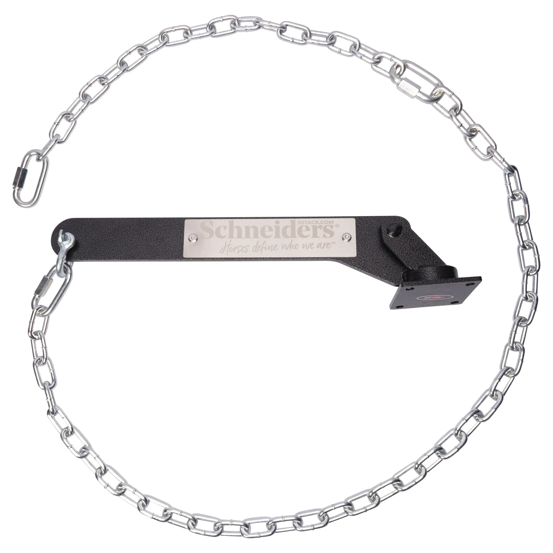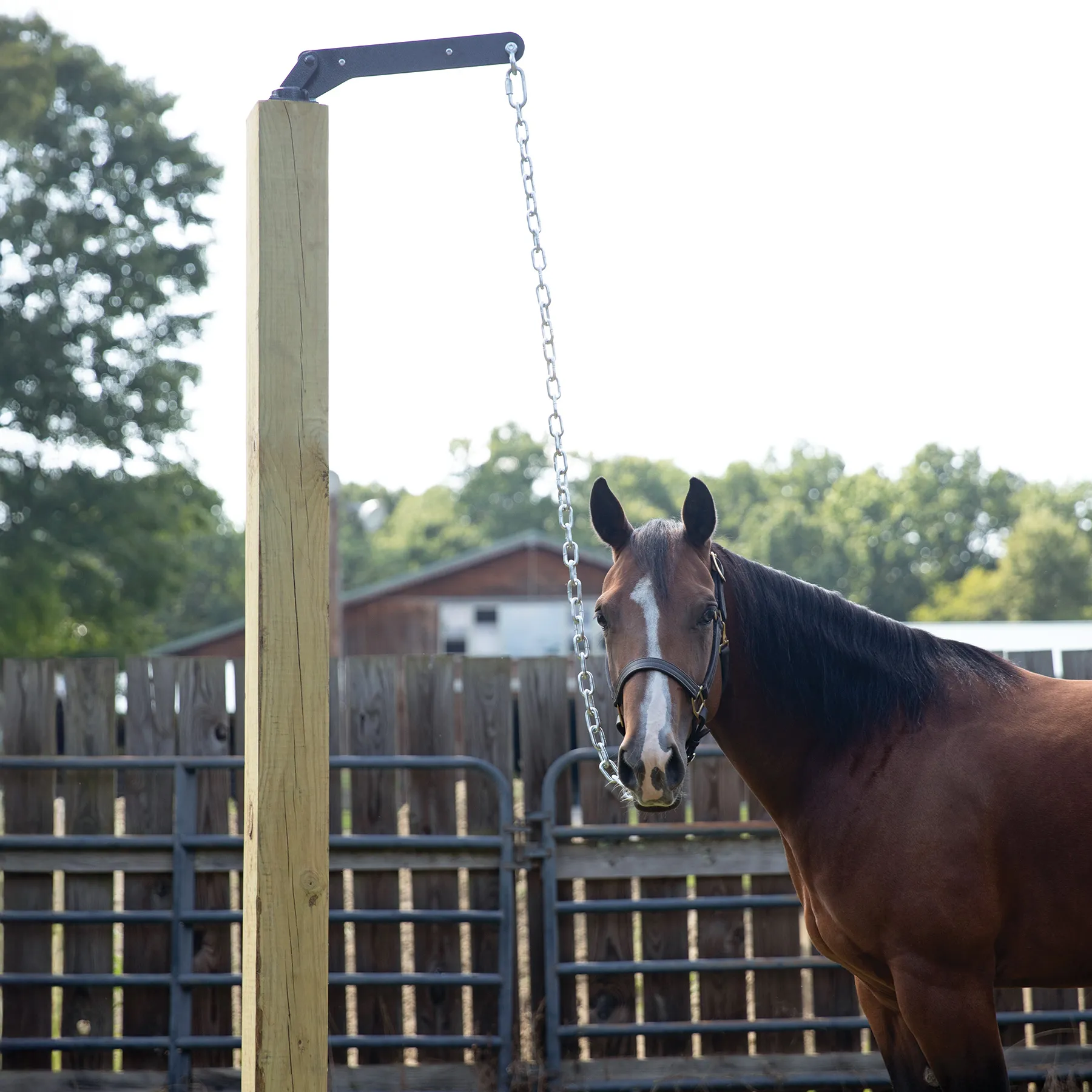 Improve your horse's patience and safety when tied with our swivel patience arm. This 360° swivel tying arm allows free movement, preventing tangles and reducing anxiety while keeping your horse secure and comfortable. Perfect for grooming, bathing, or training, this durable steel arm features a rust-resistant Black Armor finish and comes with a 6.5-foot galvanized, adjustable-length chain with quick-link chain links. Trusted by trainers, it's a safer alternative to traditional tying methods.