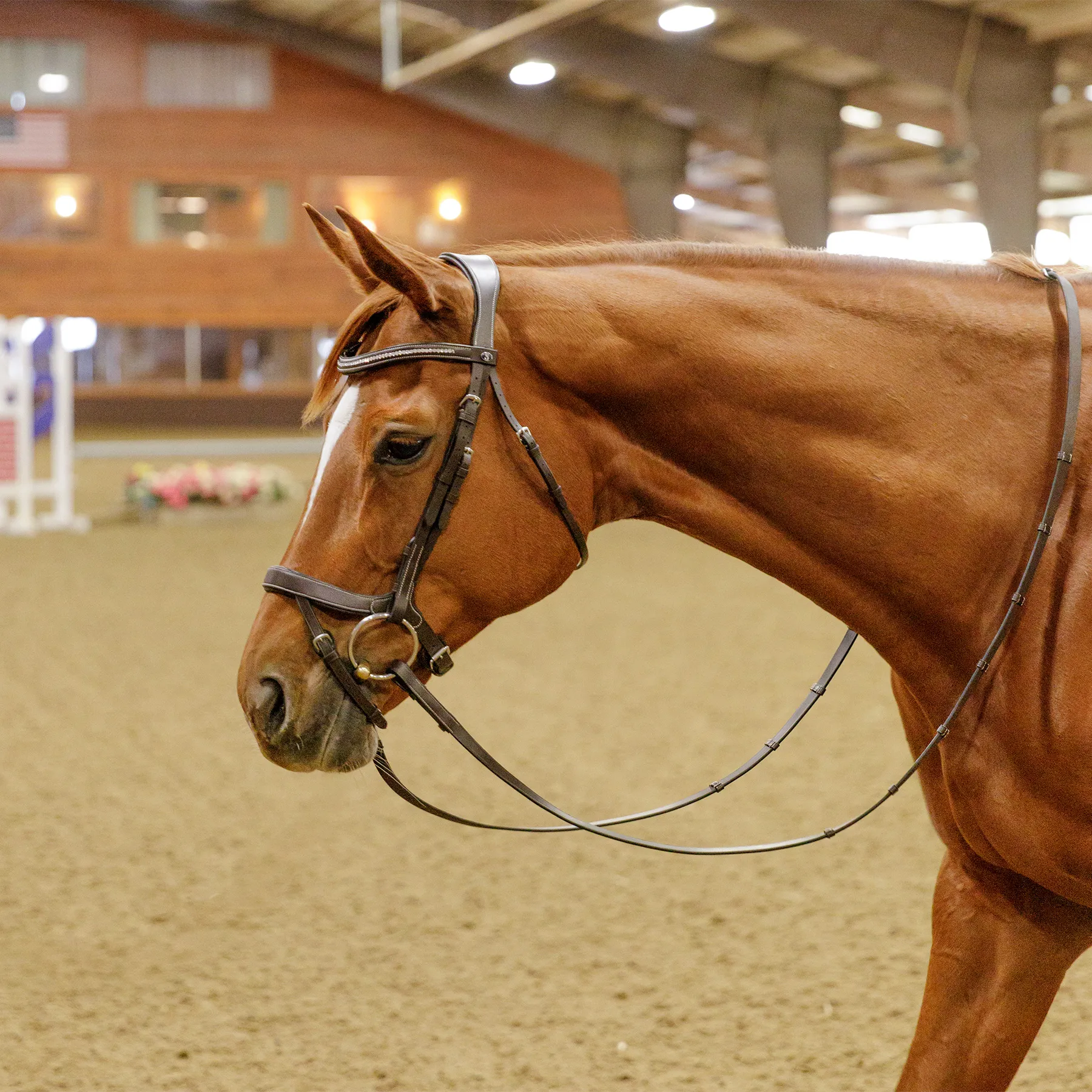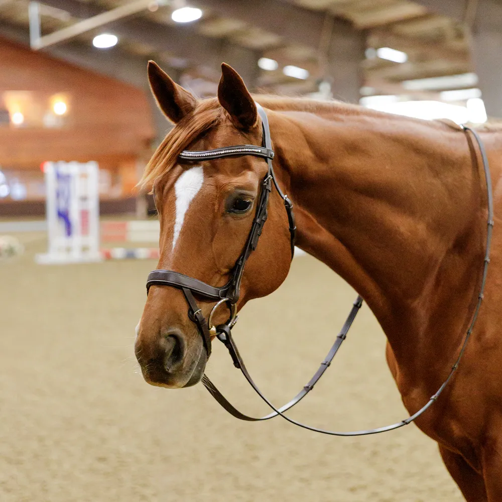 Upgrade your old English bridle with this Ergonomic Flash English Bridle with a Clear Crystal Browband - where superior craftsmanship meets elegance. Designed for both jumpers and dressage riders, this bridle offers exceptional comfort, performance, and a touch of sophistication. From its ergonomic design to its high-quality materials, this bridle delivers the perfect balance of form and function.