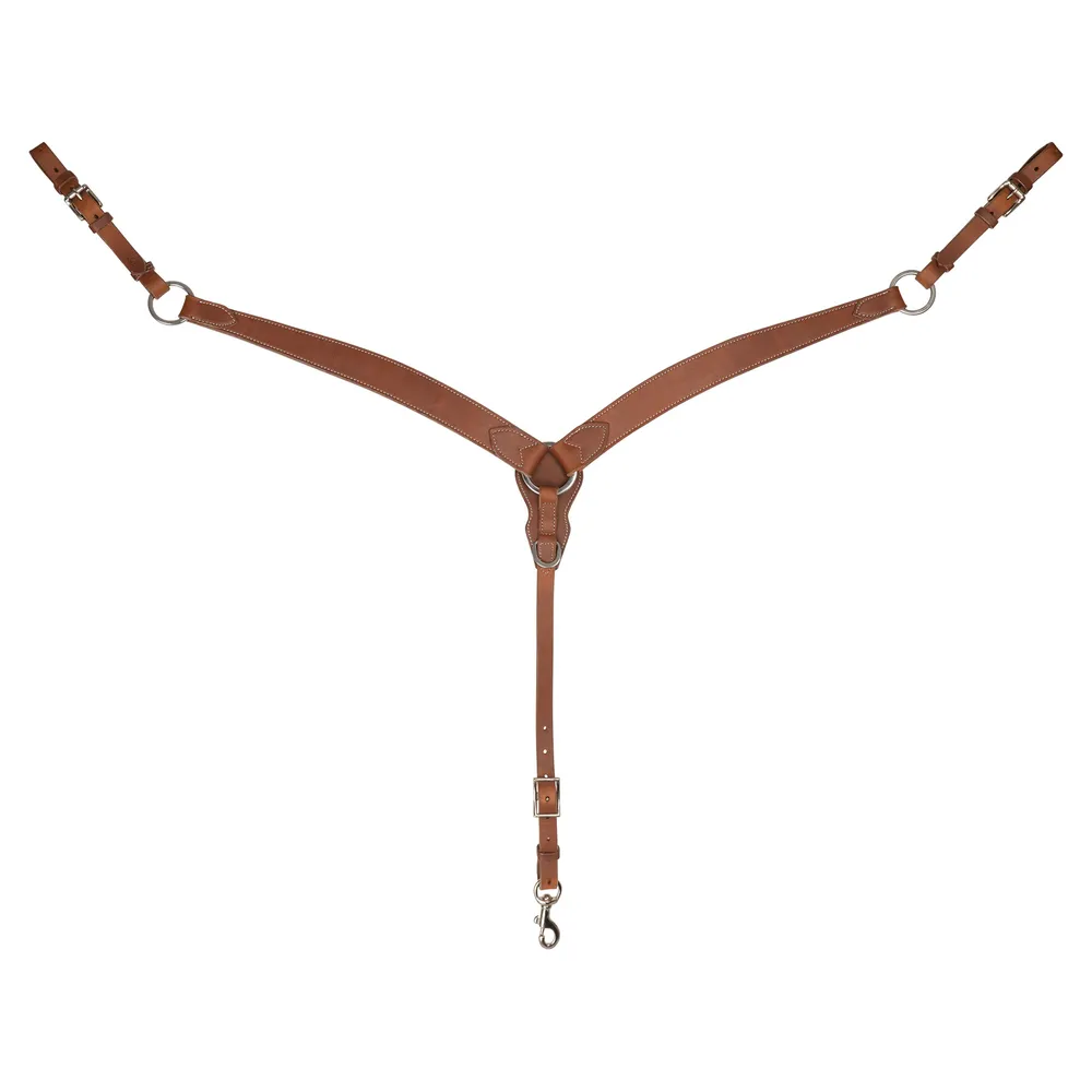 Built for both performance and rugged trail riding, this harness leather breast collar helps keep your saddle securely in place, even during intense movement or uneven terrain. Made from high-quality, moisture-resistant leather, it offers strength without sacrificing suppleness. With stainless steel hardware and multiple adjustment points, it's a reliable choice for reining, ranch, cutting classes, or a hilly trail ride.