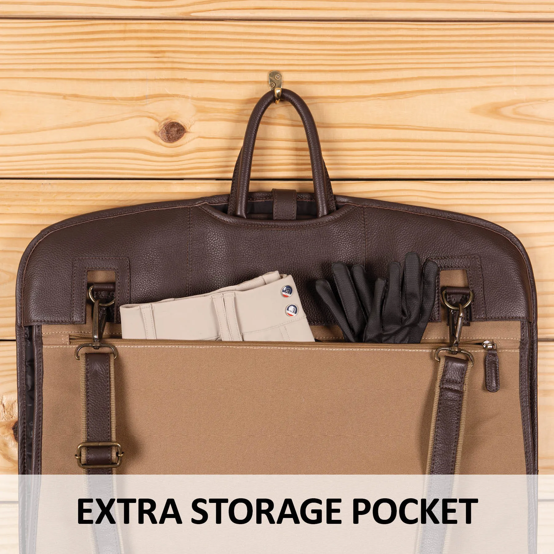 This beautiful canvas garment bag is accented with soft leather for a classy and durable design. It's the perfect bag to keep your valuable show clothes clean, neat, and organized. With the fold-over top, carrying handles, heavy-duty zippers, and nylon lining, you'll love all the details that make this bag great!