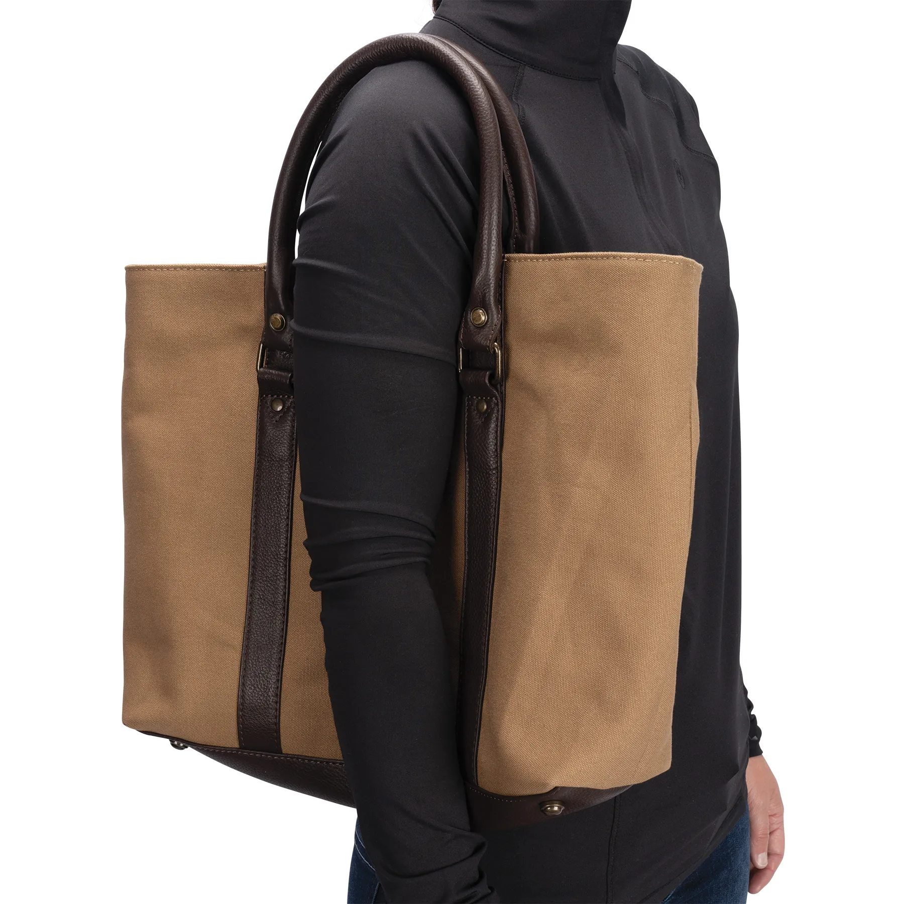 This beautiful canvas and leather tote bag is the perfect size for a day trip to the barn! Perfect for toting around your laptop or extra barn chores, you'll love its beautiful features. The heavy canvas, rich brown leather, and antiqued bronze hardware make this bag a stylish addition to your barn gear!