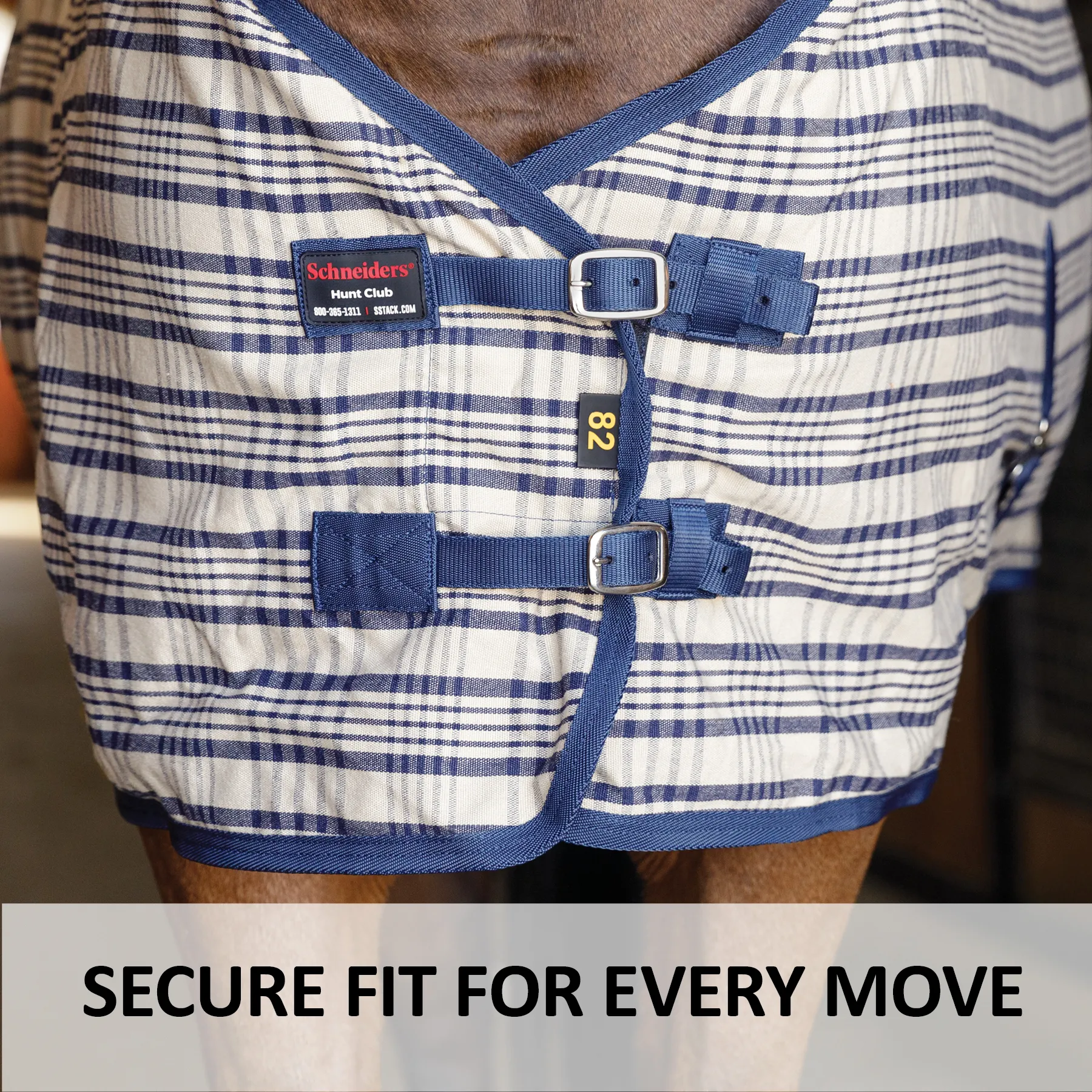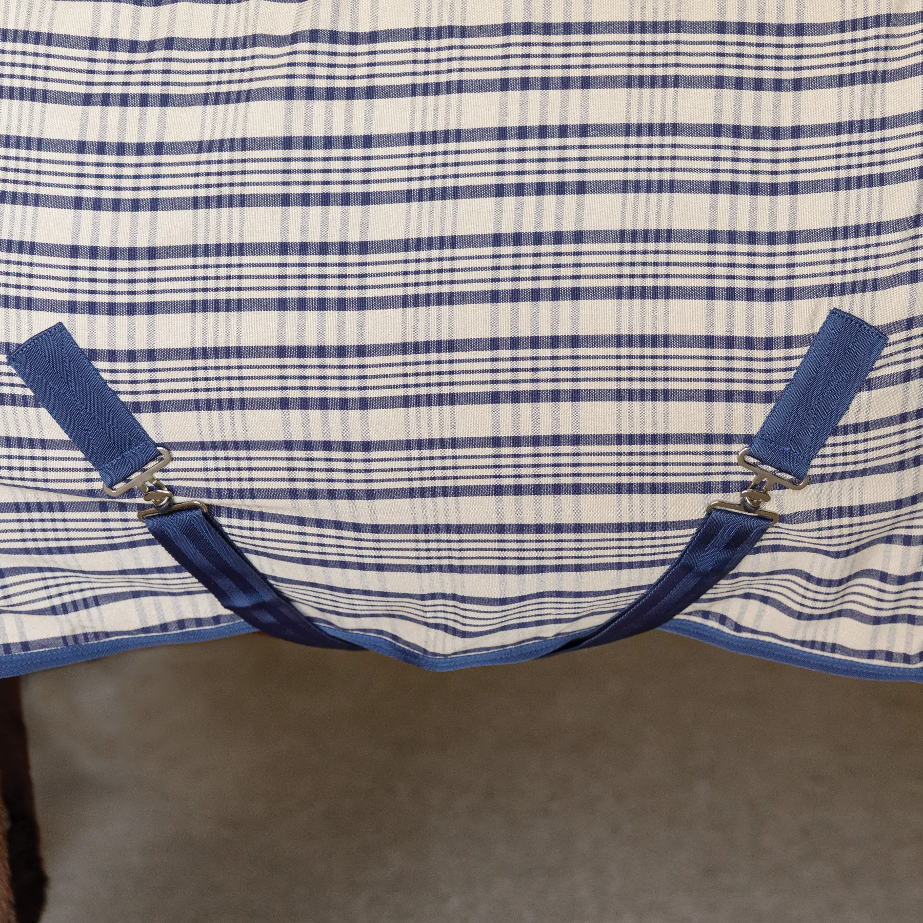 This classic, hunt plaid stable sheet combines timeless style with practical performance. This sheet boasts a beautiful tan and navy plaid pattern, perfect for use as a summer sheet, a liner in cooler weather, or a stylish show cover on the road. Its polyester construction offers durability and absorbency, while the fleece-lined wither provides extra comfort. Generously cut for full-body coverage, it's a versatile and lightweight option for your horse's wardrobe.