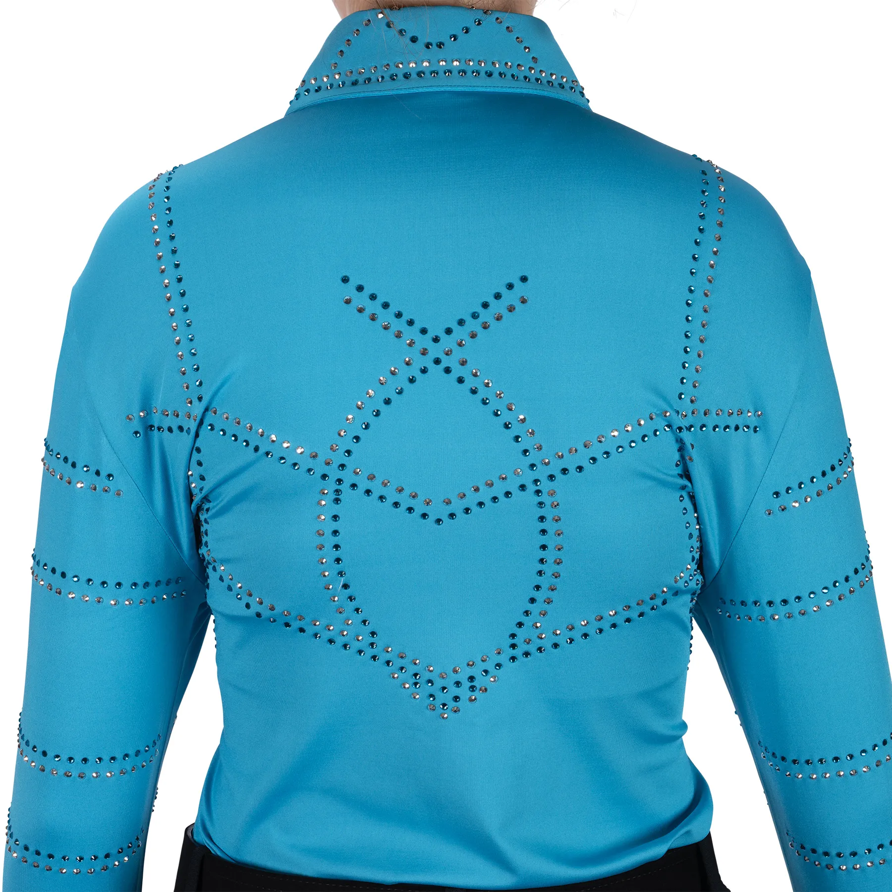 This sparkling western show shirt is guaranteed to turn heads. Its front and back are embellished with hundreds of vibrant crystals, creating a stunning visual effect. The figure-flattering 4-way stretch fabric also ensures comfort and breathability without getting untucked throughout the day. The versatile long-sleeved design is also perfect for various Western classes, such as Western pleasure, horsemanship, trail, or Western riding.