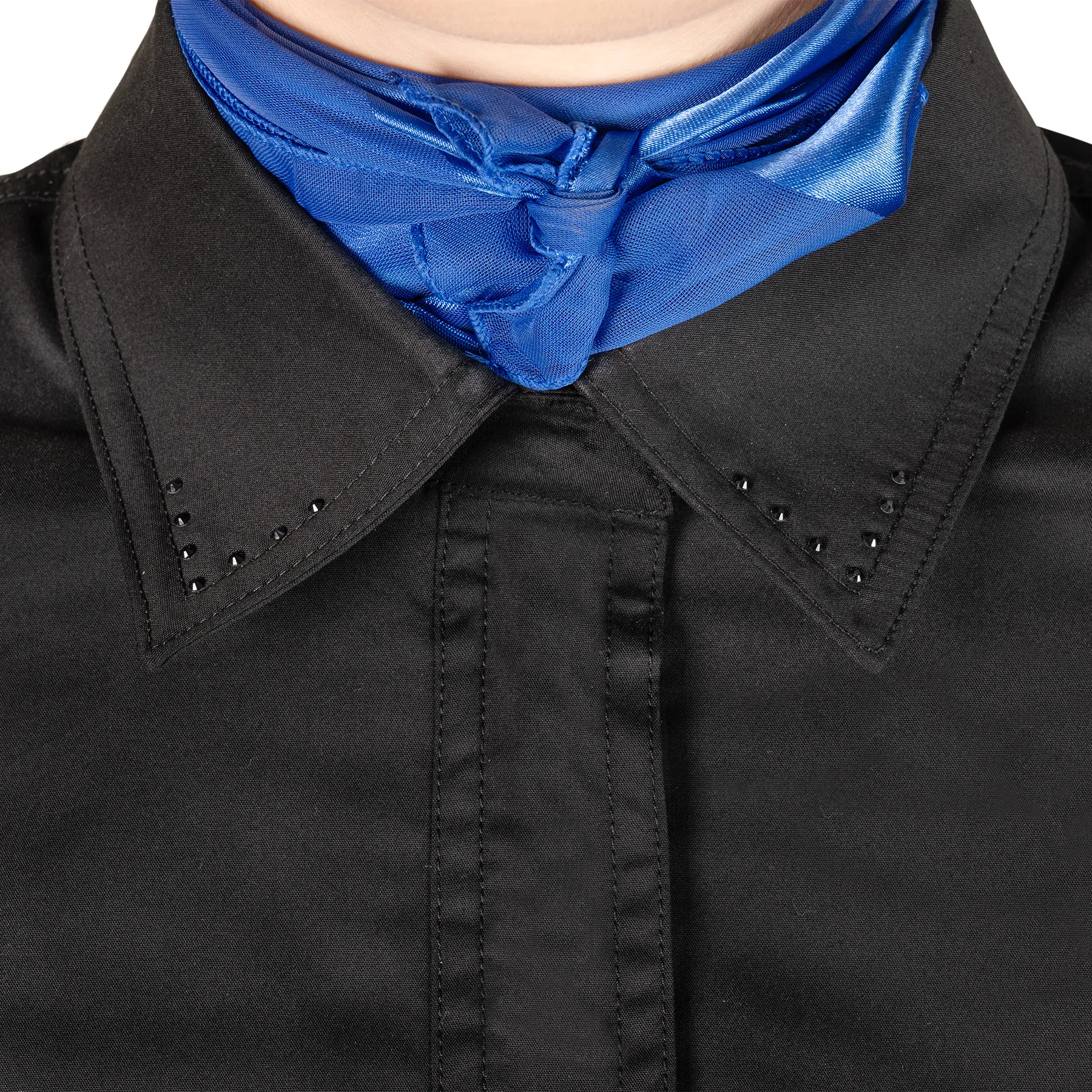 Turn heads in the ring with this sleek Western ladies' show shirt. A crisp and stylish choice for any Ranch Class, Horsemanship, Trail, or Pleasure class. With a tailored feminine fit and subtle crystal accents on the collar and cuffs, this shirt combines elegance and functionality for a polished show-day look.