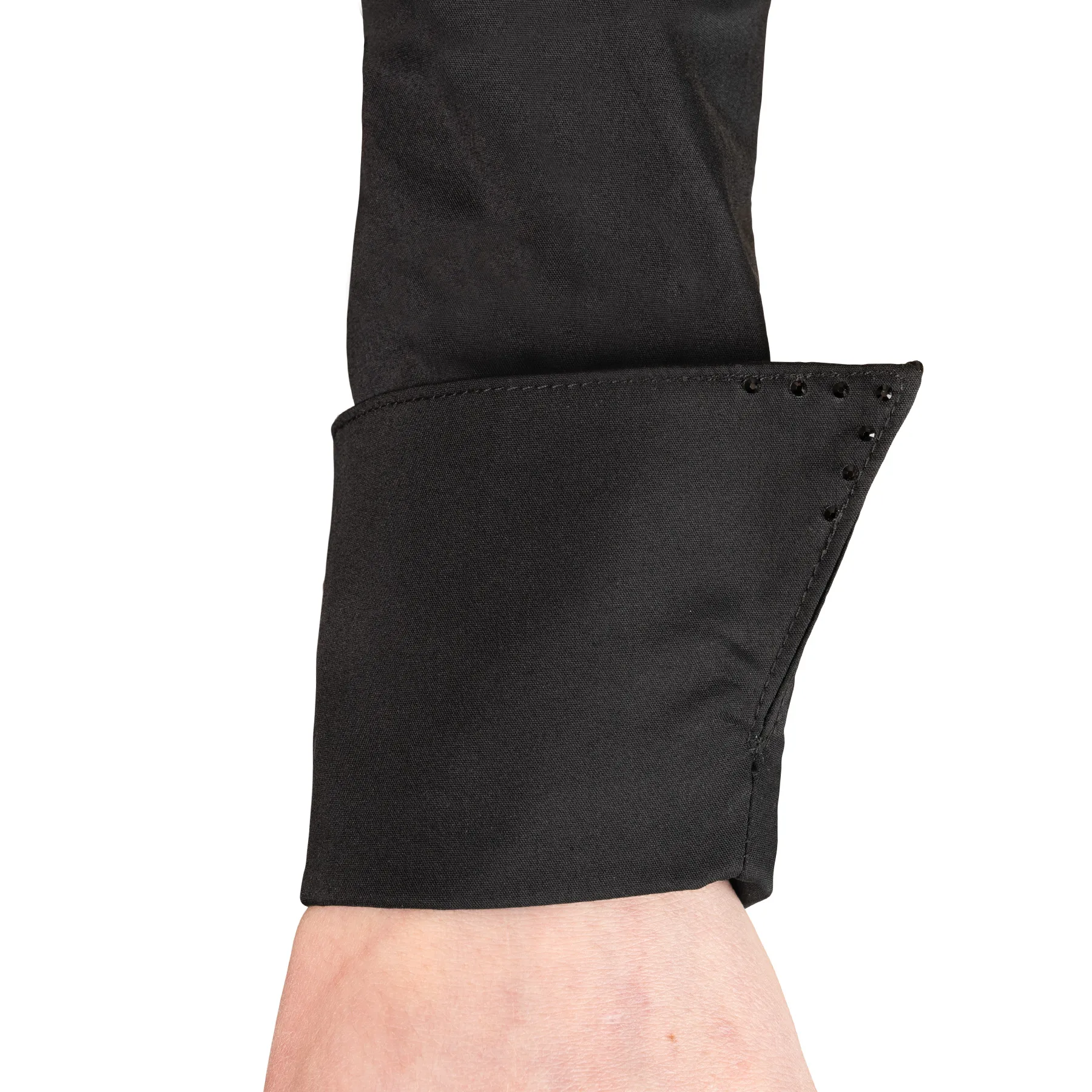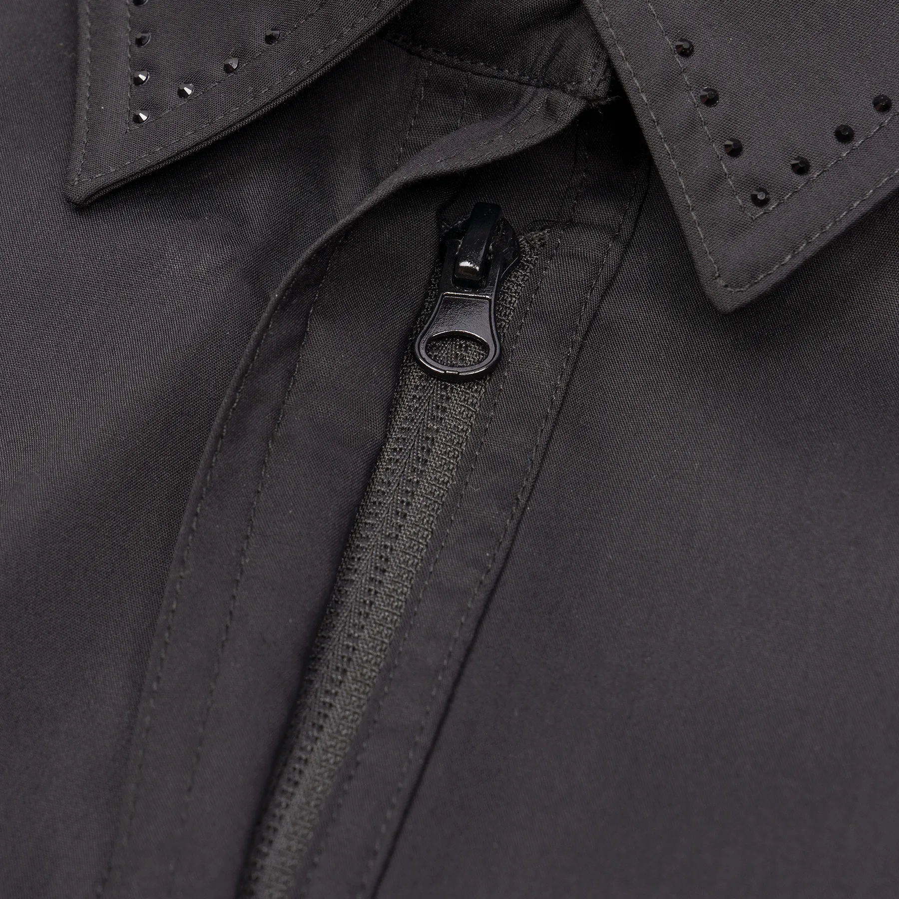 - Hidden full-front zipper with French cuffs and snap closures