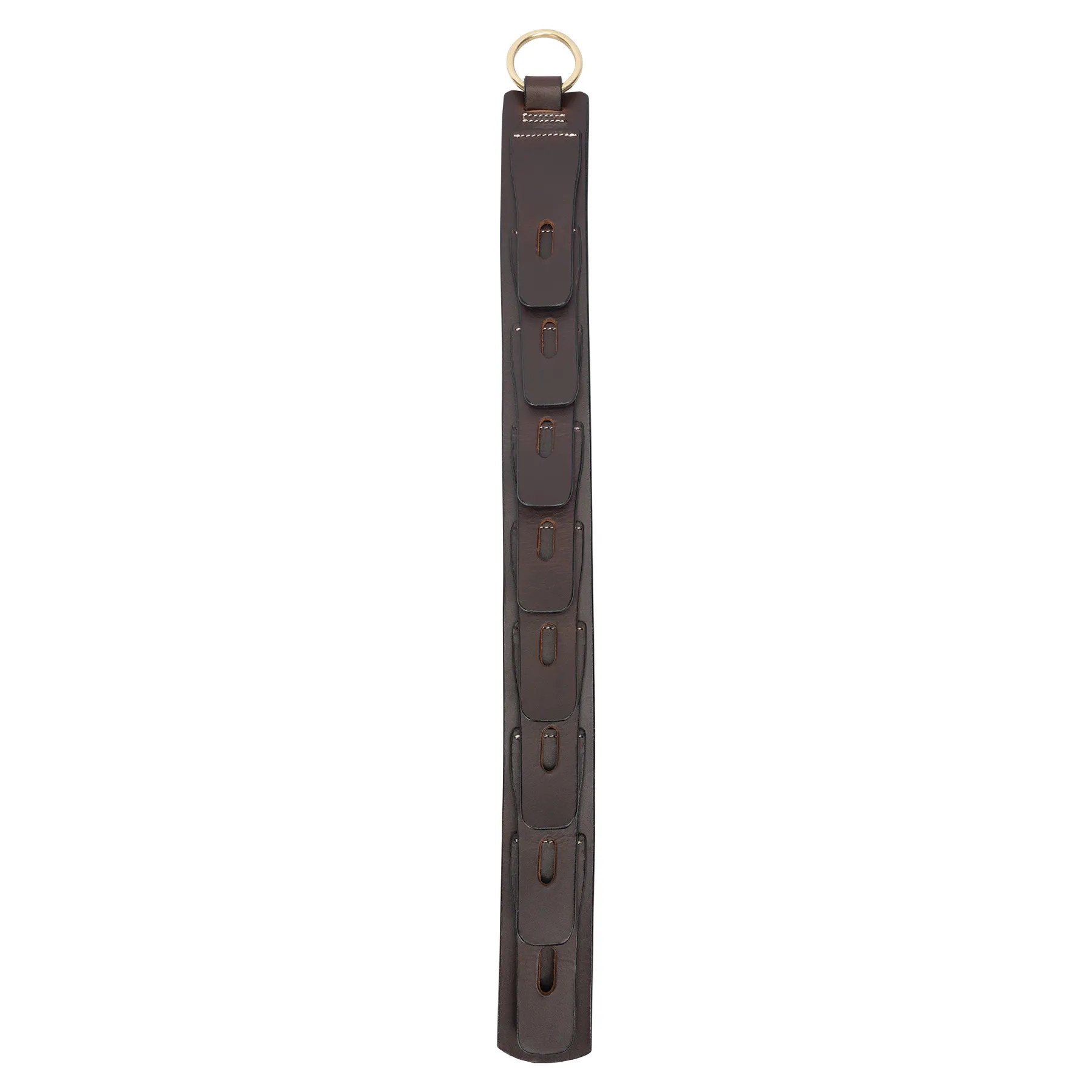 Keep your tack room or trailer tidy with this sleek leather cinch hanger, designed to hold up to 8 western cinches. Whether you're storing fleece, mohair, or neoprene styles, this durable and supple leather hanger keeps everything in reach and neatly arranged. Featuring a solid brass O-ring and a space-saving design, it's the perfect blend of function and Western flair.