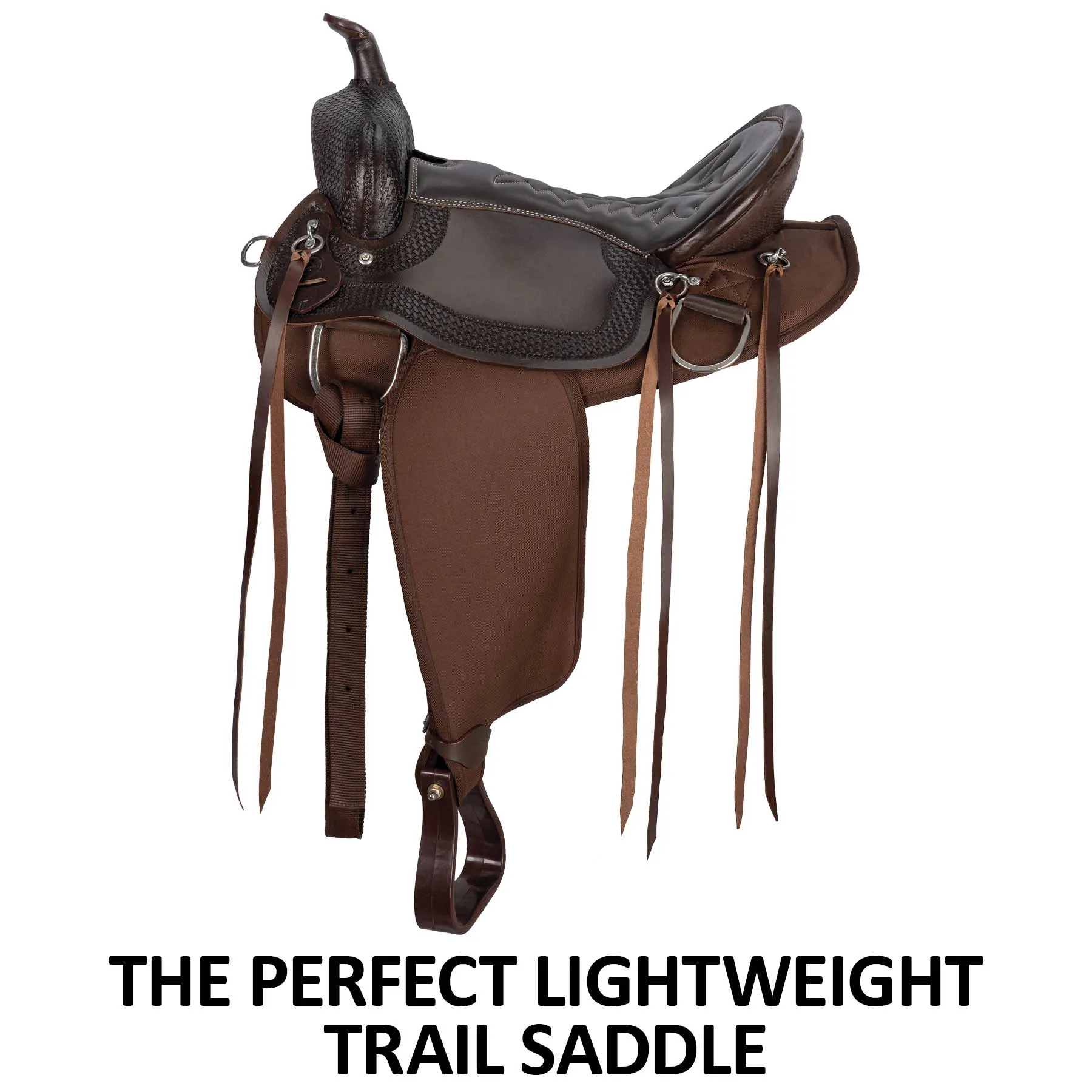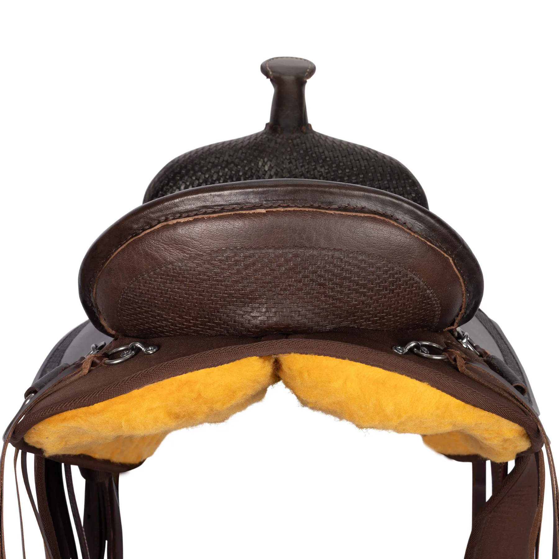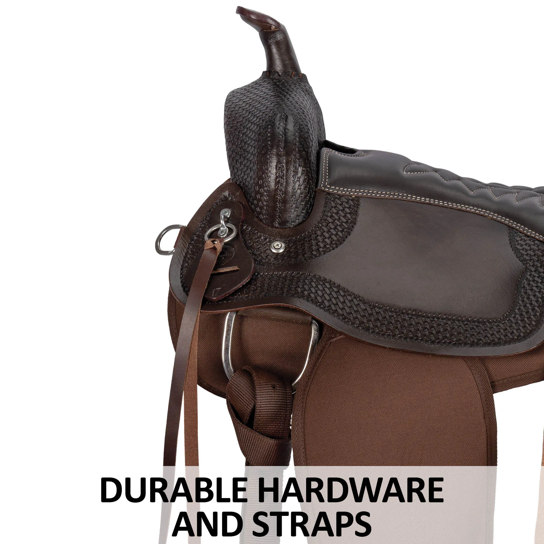 This Western trail saddle is the perfect blend of comfort and practicality for any trail ride. This saddle features a unique combination of leather and Cordura, offering lightweight comfort and durability. The easy-care synthetic skirt and fenders mean less time on maintenance and more time enjoying the ride. The saddle is accented with a beautiful basket weave tooled leather pommel and seat jockey, and a generously padded smooth leather seat ensures all-day comfort. This saddle provides style and comfort, making your trail rides more enjoyable and memorable.