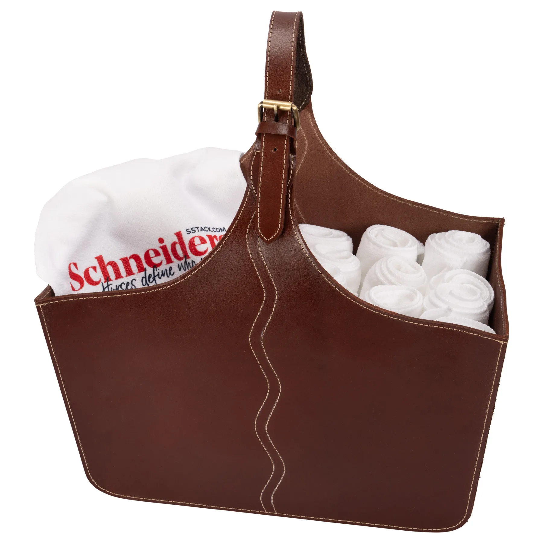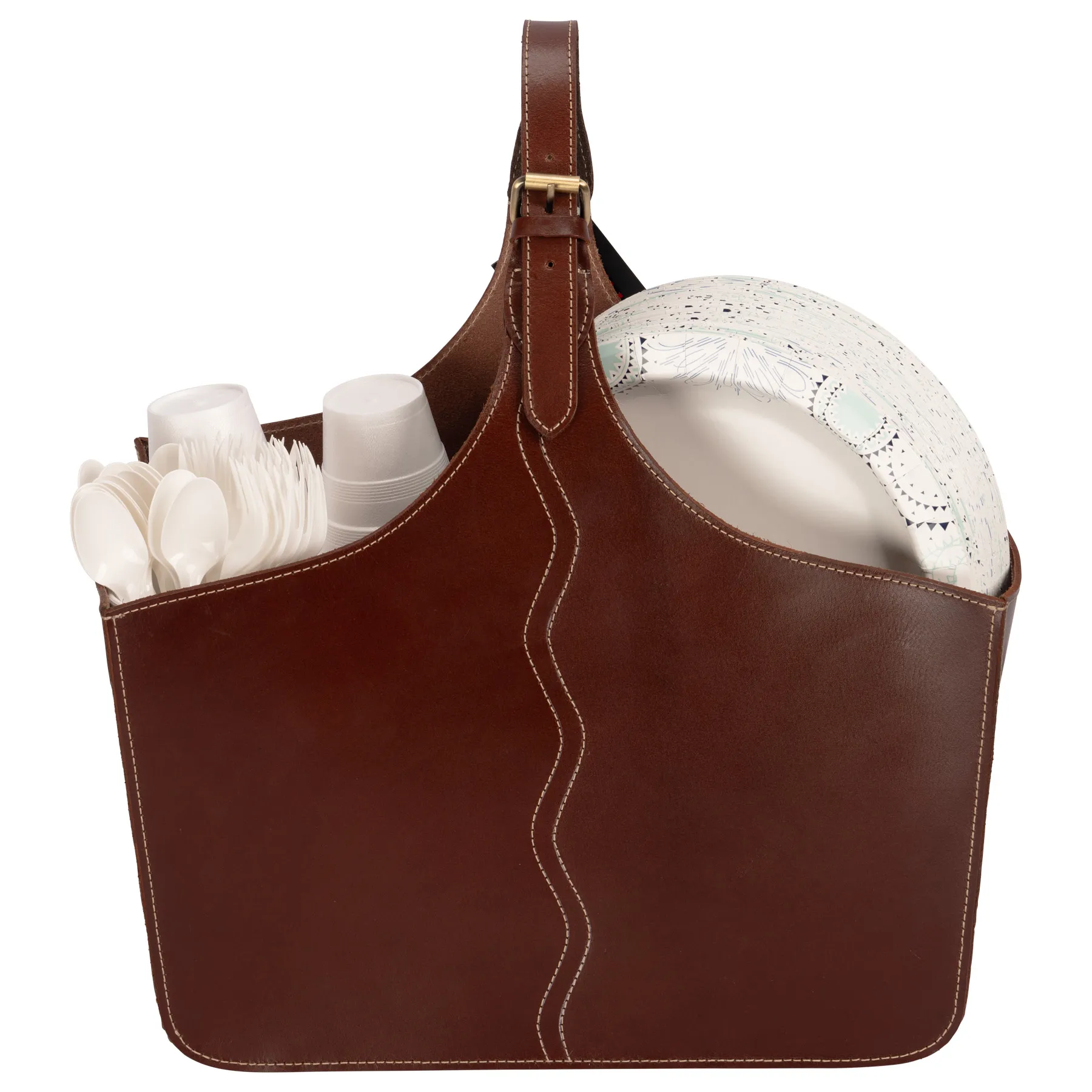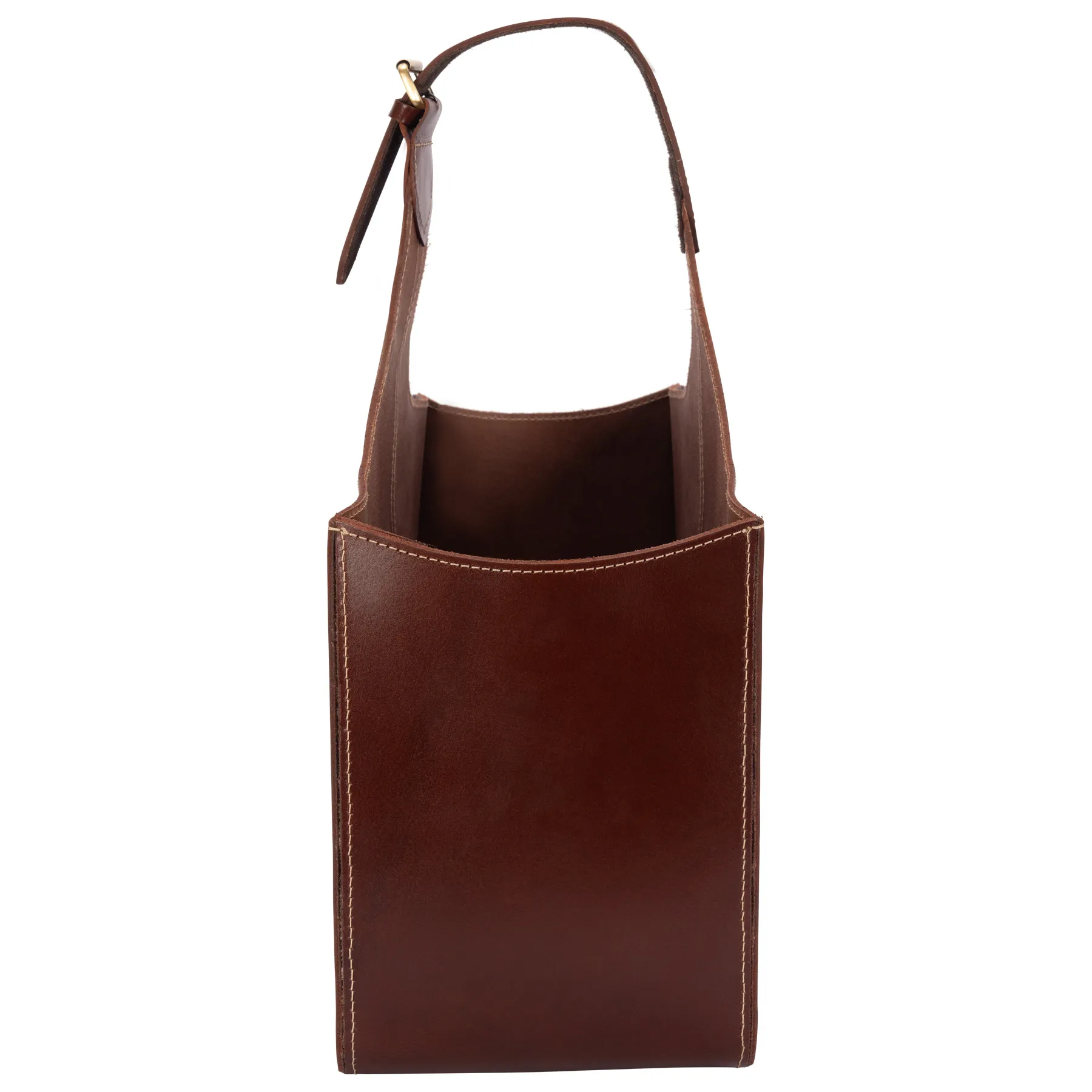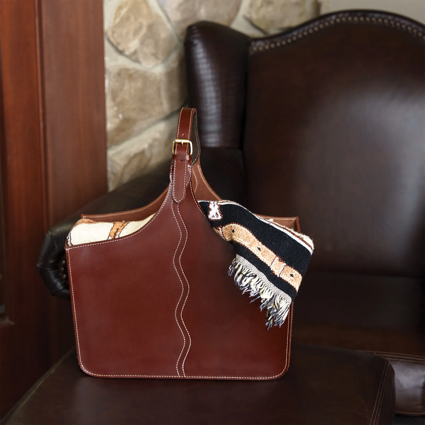 Add a touch of classic equestrian style to your space with this beautifully crafted leather magazine tote. Made from rich, smooth chestnut leather with elegant cream contrast stitching, it offers both style and practicality for organizing magazines, toiletries, glasses, and other everyday essentials. Its sturdy, structured design keeps the tote upright and looking polished whether it's placed in the barn lounge, living quarters trailer, bathroom, or home.